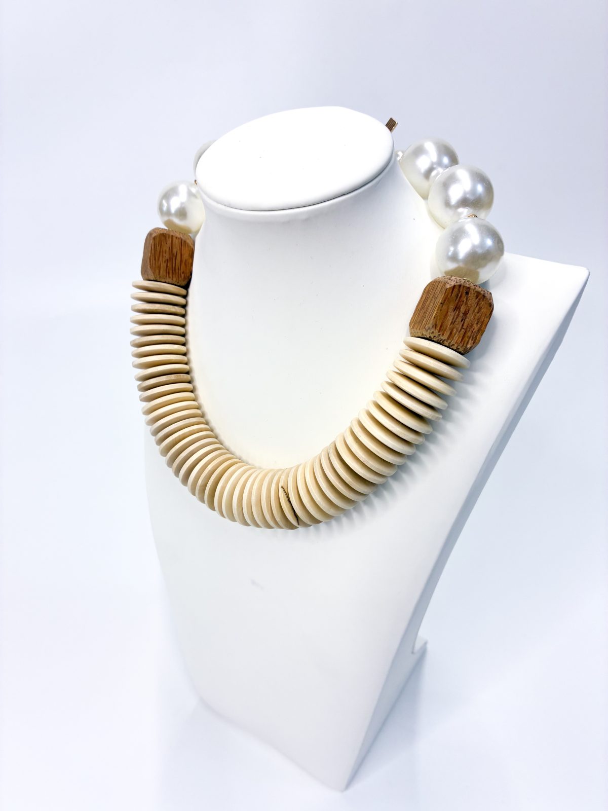 Εντυπωσιακό statement κολιέ που συνδυάζει μαργαριταρένιες χάντρες, φυσικά ξύλινα στοιχεία και διαδοχικούς ivory κρίκους σε tribal διάταξη. Ένα κομμάτι που ισορροπεί ανάμεσα στο φυσικό και το εκλεπτυσμένο.