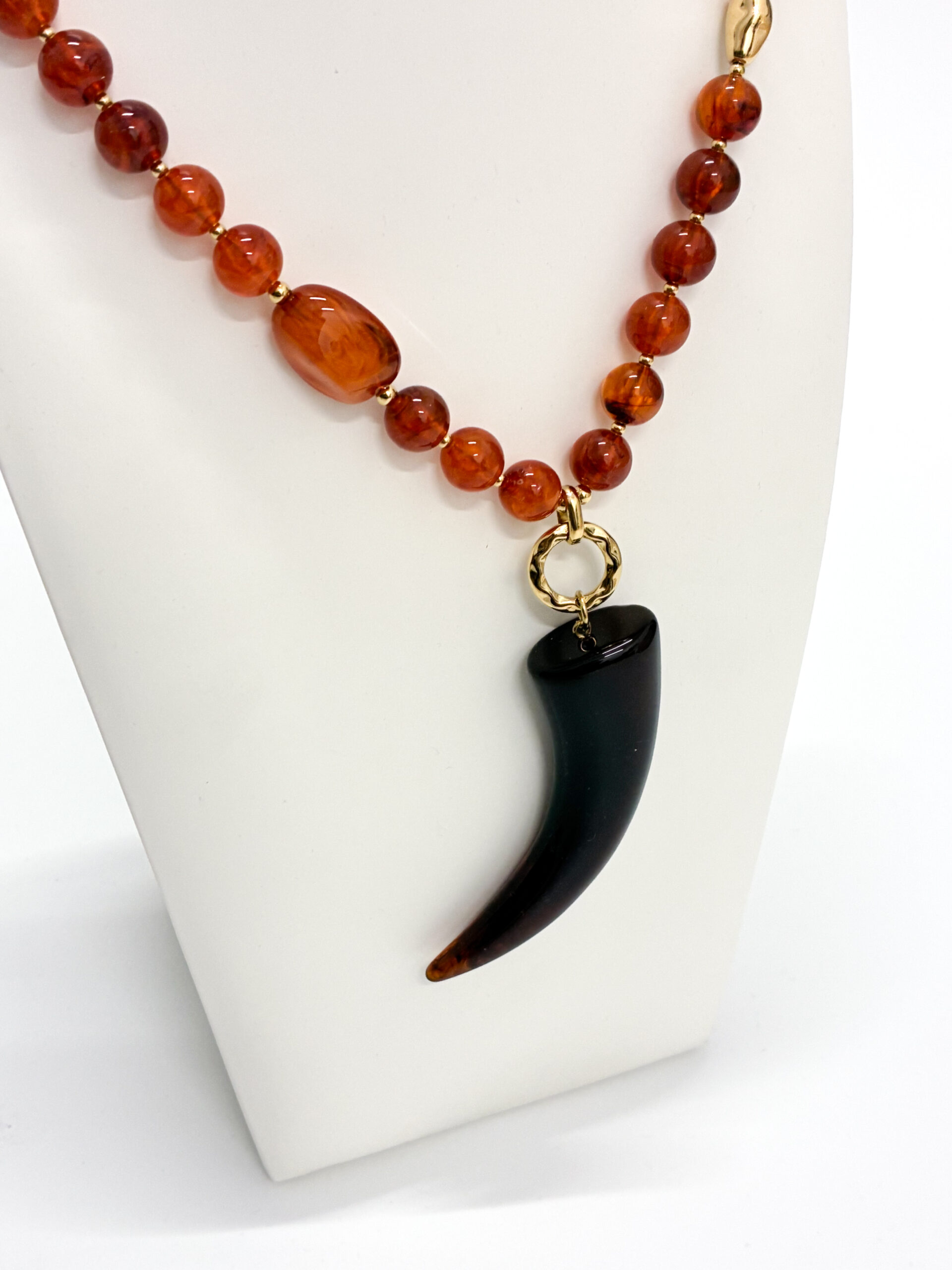 Κολιέ με κεχριμπαρένιες χάντρες σε ζεστή καφέ-πορτοκαλί απόχρωση, διακοσμημένο με μαύρο καμπύλο μοτίφ που προσθέτει χαρακτήρα και ισορροπία. Ένα κόσμημα που συνδυάζει γήινη αισθητική με statement λεπτομέρεια.