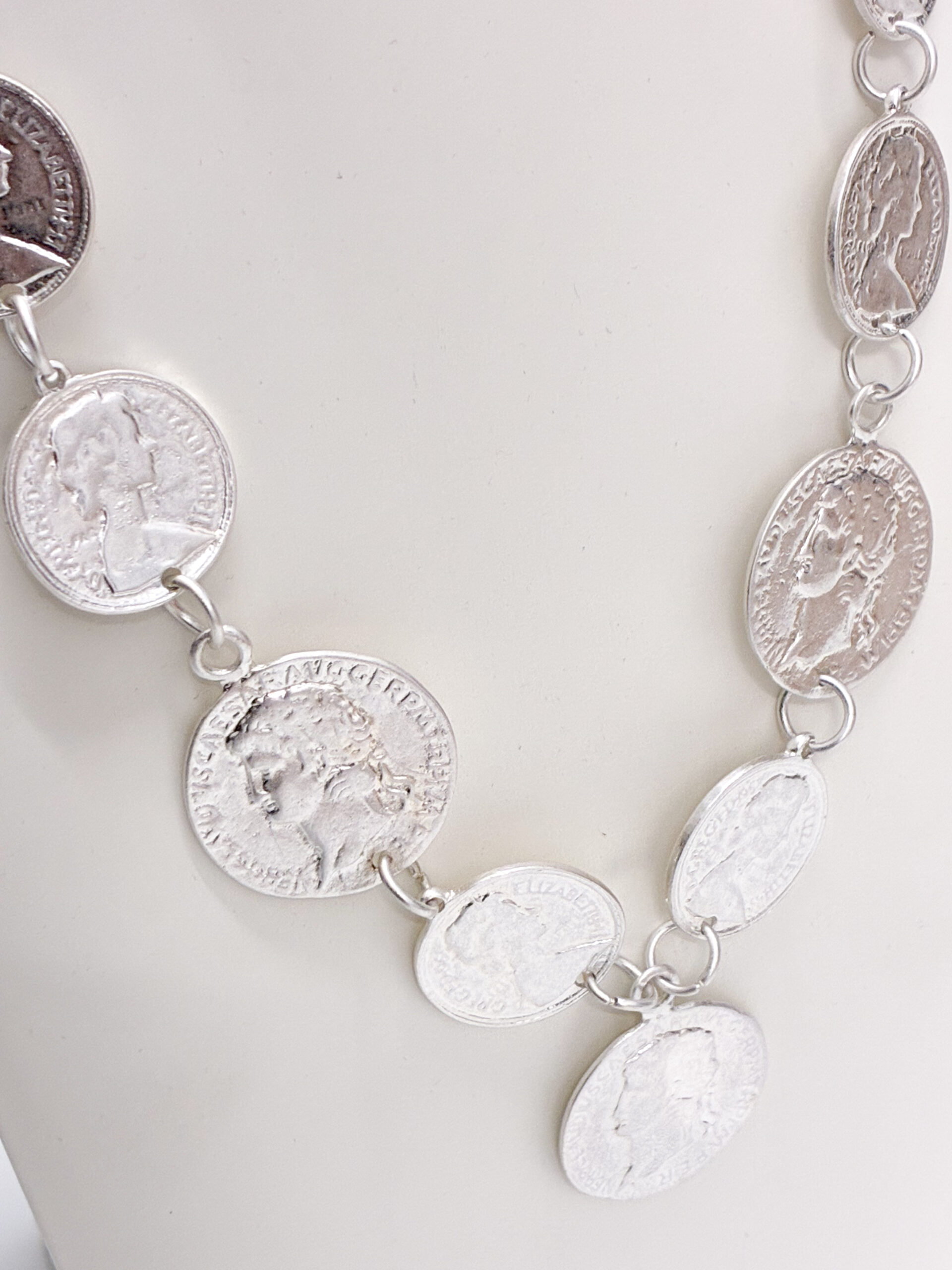 Statement κολιέ με μεταλλικά νομίσματα σε ασημί απόχρωση, δεμένα μεταξύ τους σε κομψή αλυσίδα. Ένα κόσμημα με διακριτική vintage αισθητική που προσθέτει χαρακτήρα και κίνηση στο look.