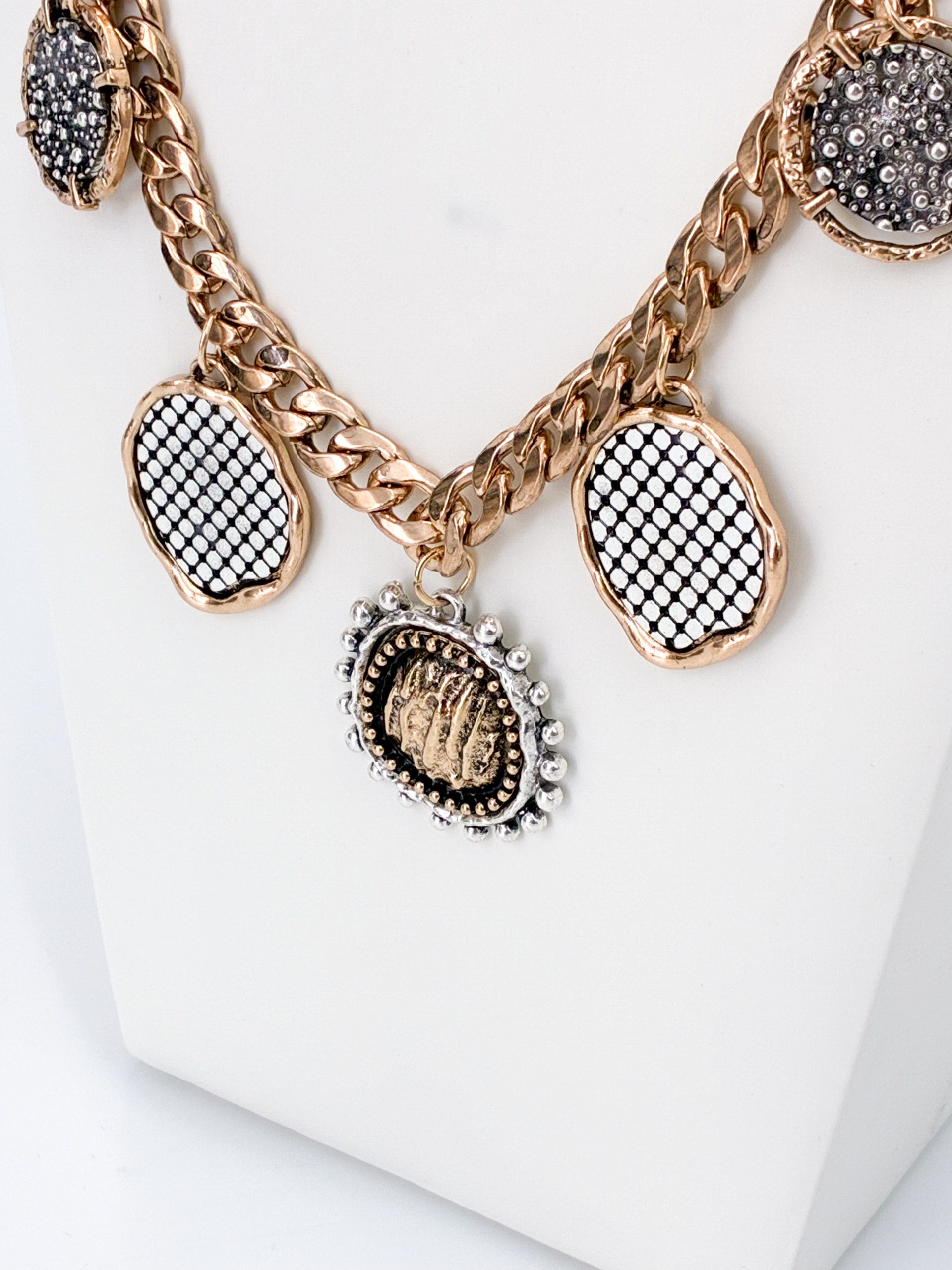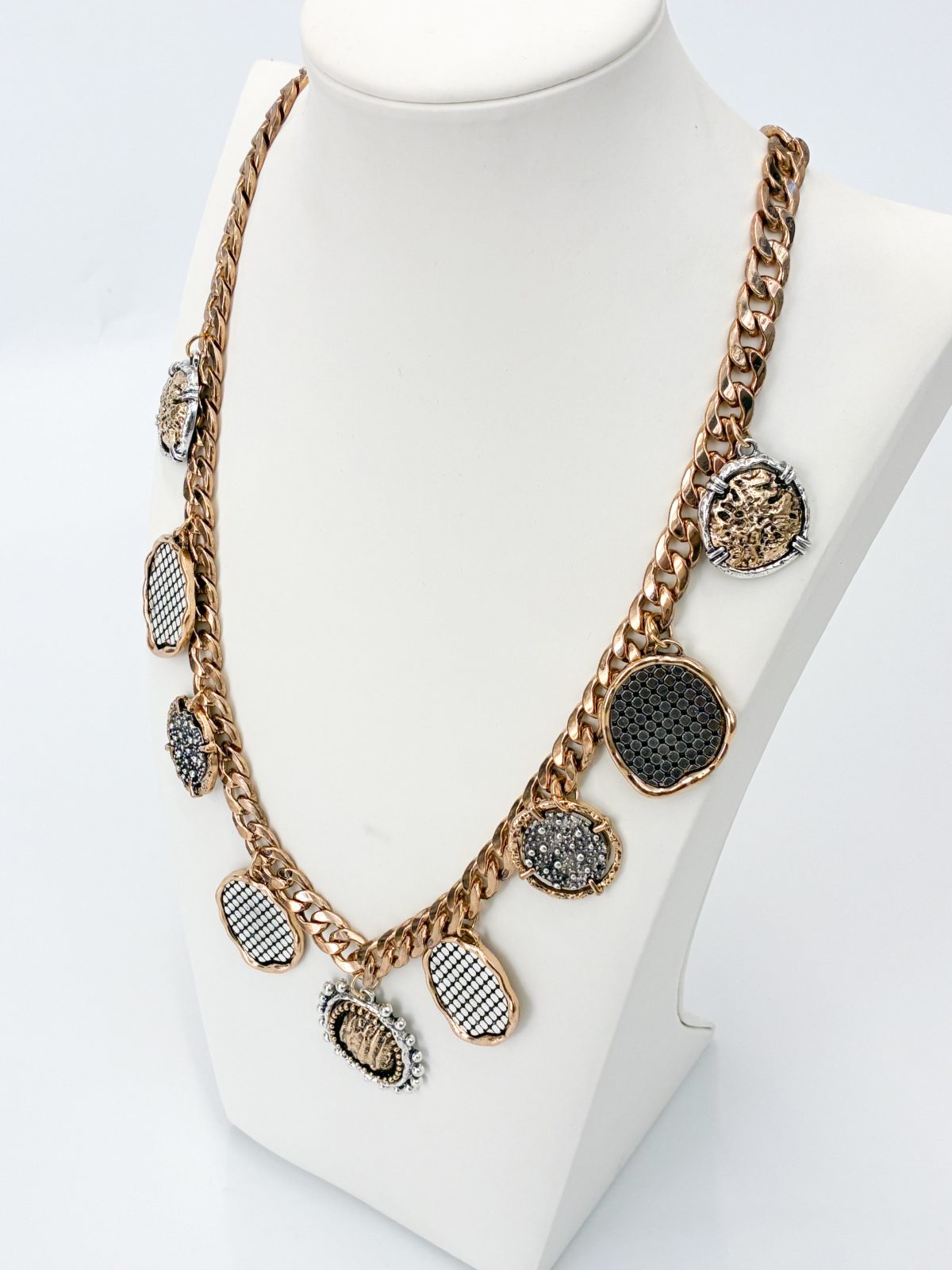 Εντυπωσιακό κολιέ με χοντρή χρυσή αλυσίδα και ιδιαίτερα μενταγιόν που θυμίζουν παλιές σφραγίδες ή αποτυπώματα κεριού. Οι μεταλλικές λεπτομέρειες σε μαύρο, ασημί και χρυσό δίνουν ένα αίσθημα μυστηρίου και δυναμικής πολυτέλειας. Ένα κόσμημα που συνδυάζει το vintage ύφος με το statement χαρακτήρα.