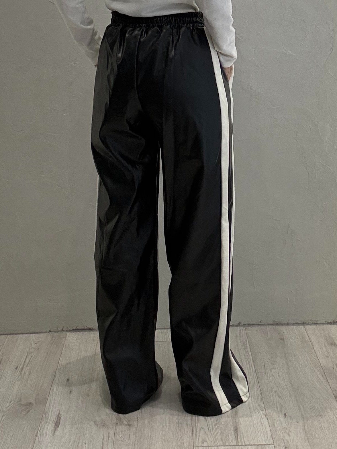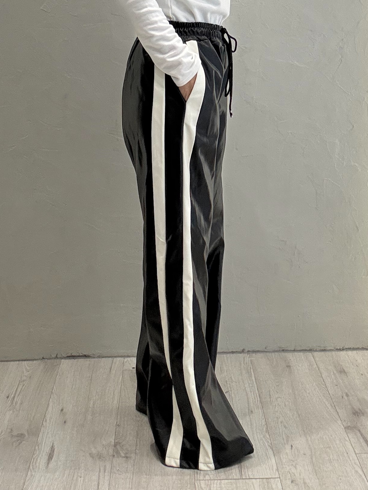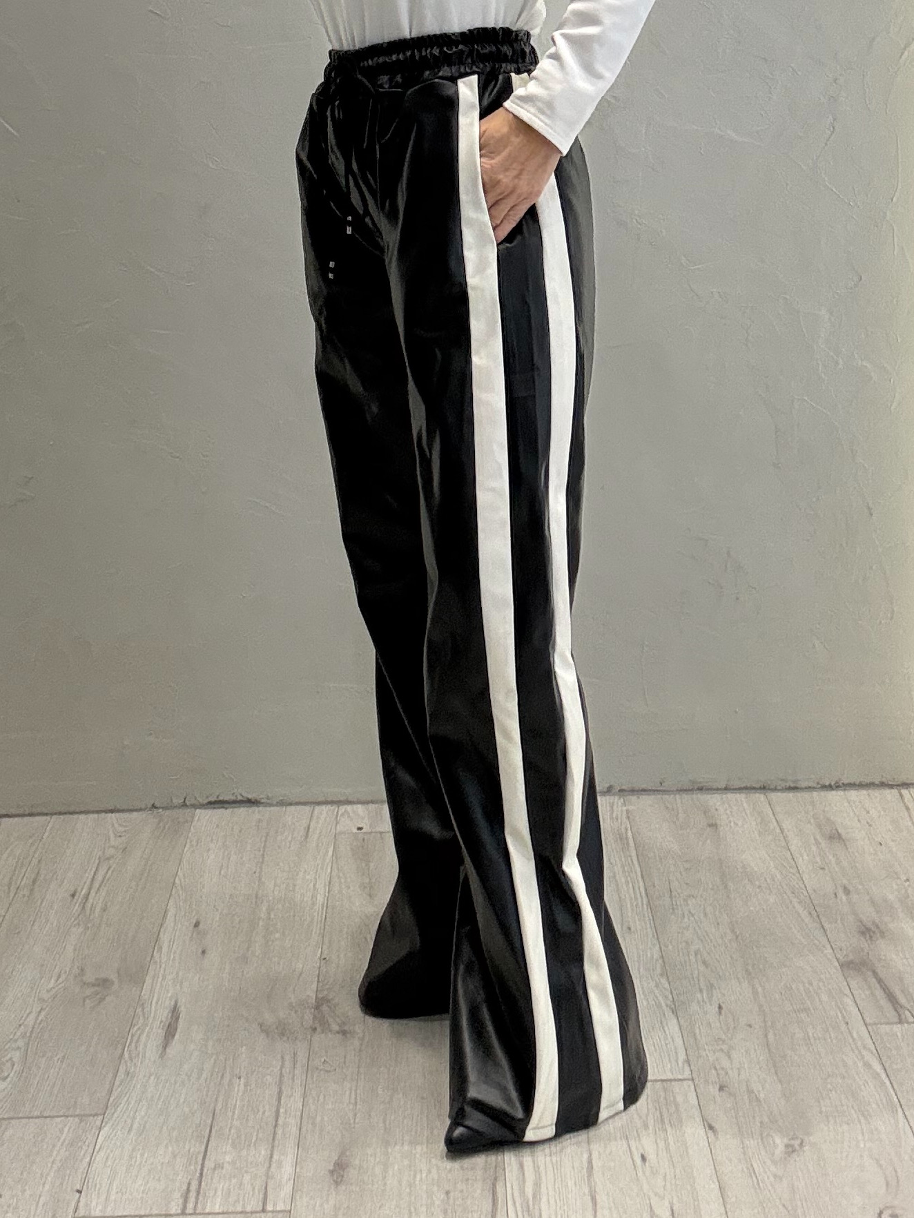 Μαύρο παντελόνι με κάθετη λευκή ρίγα που επιμηκύνει οπτικά τη σιλουέτα και δίνει έντονη, σύγχρονη γραμμή.