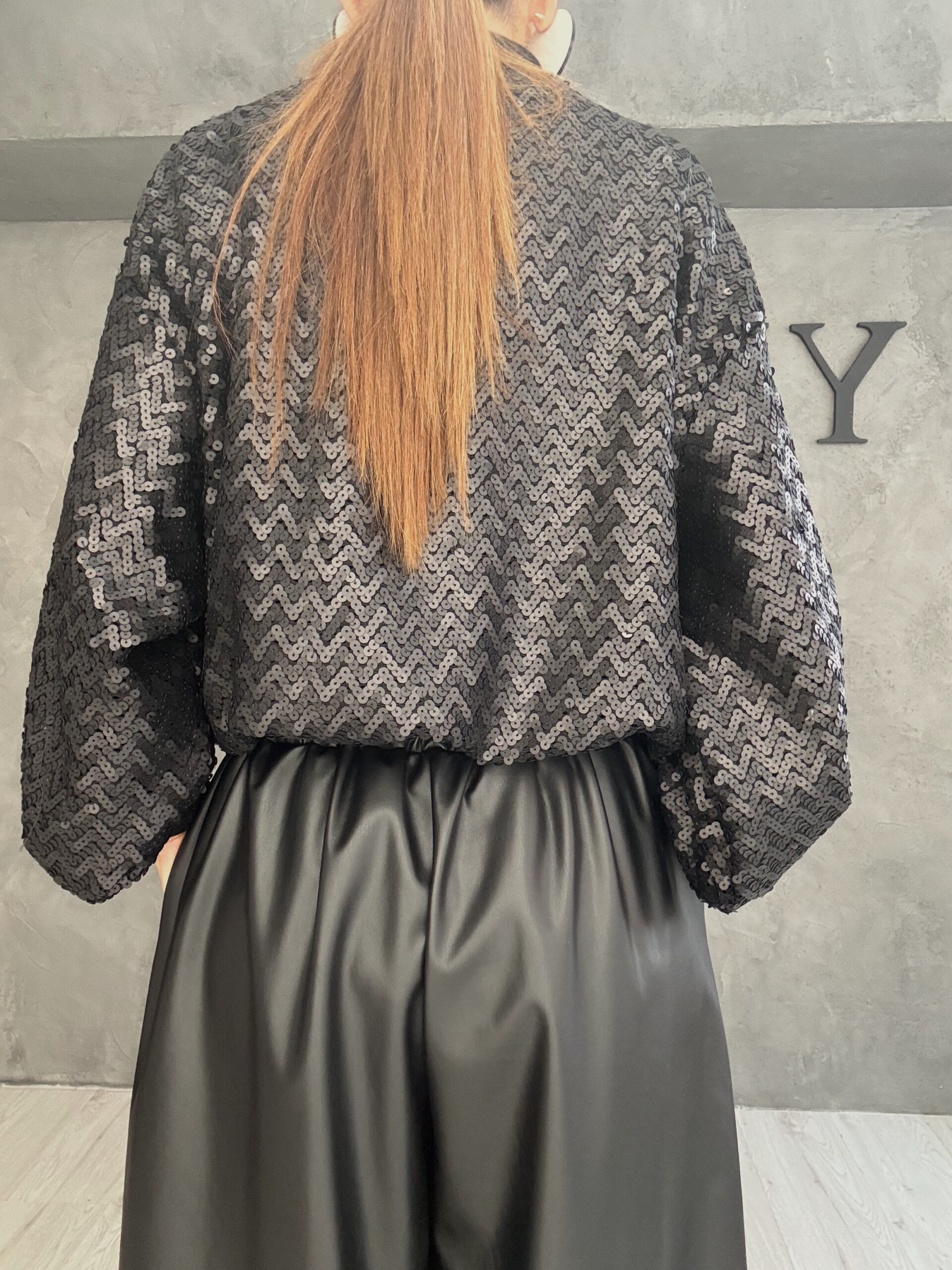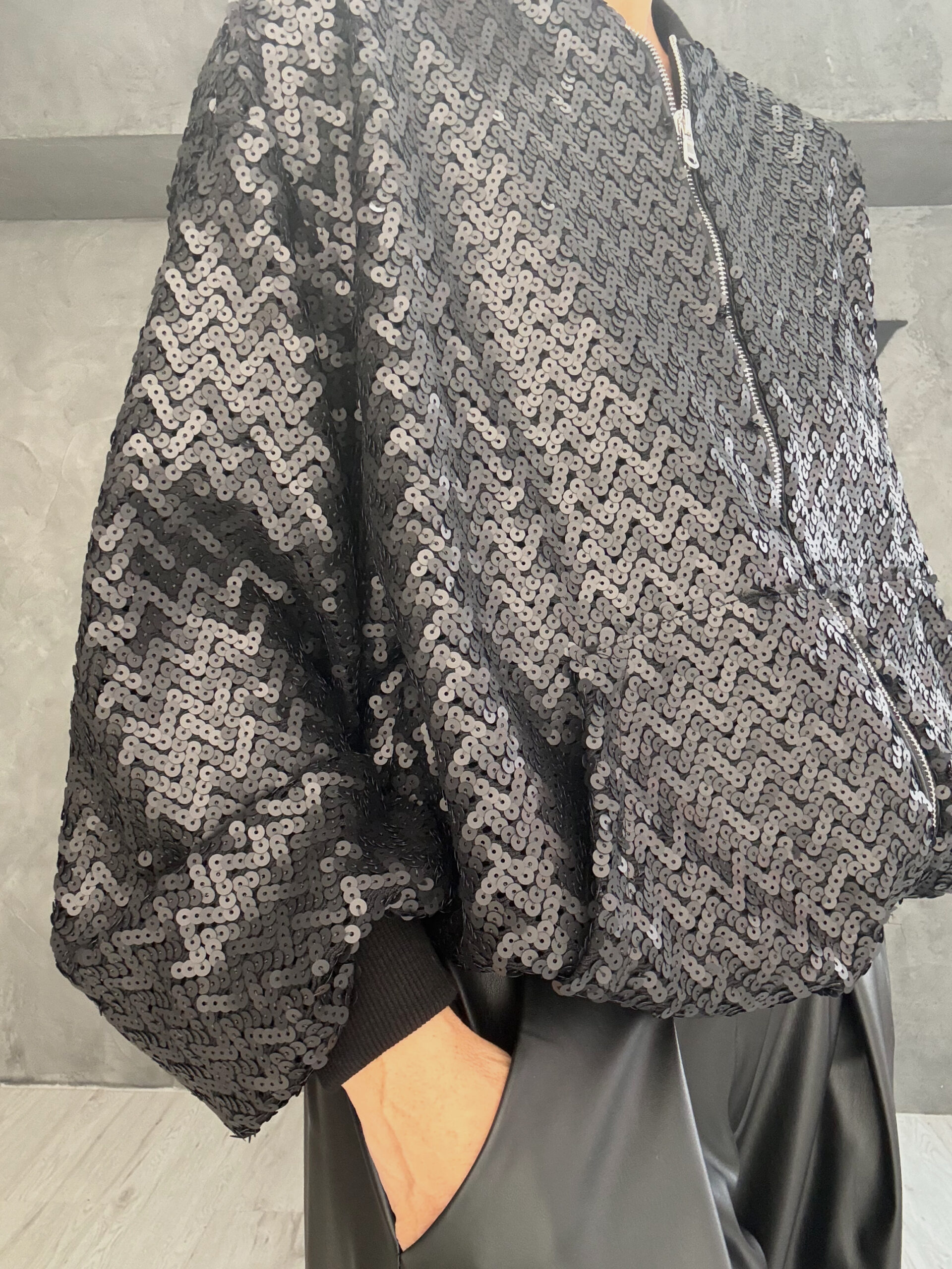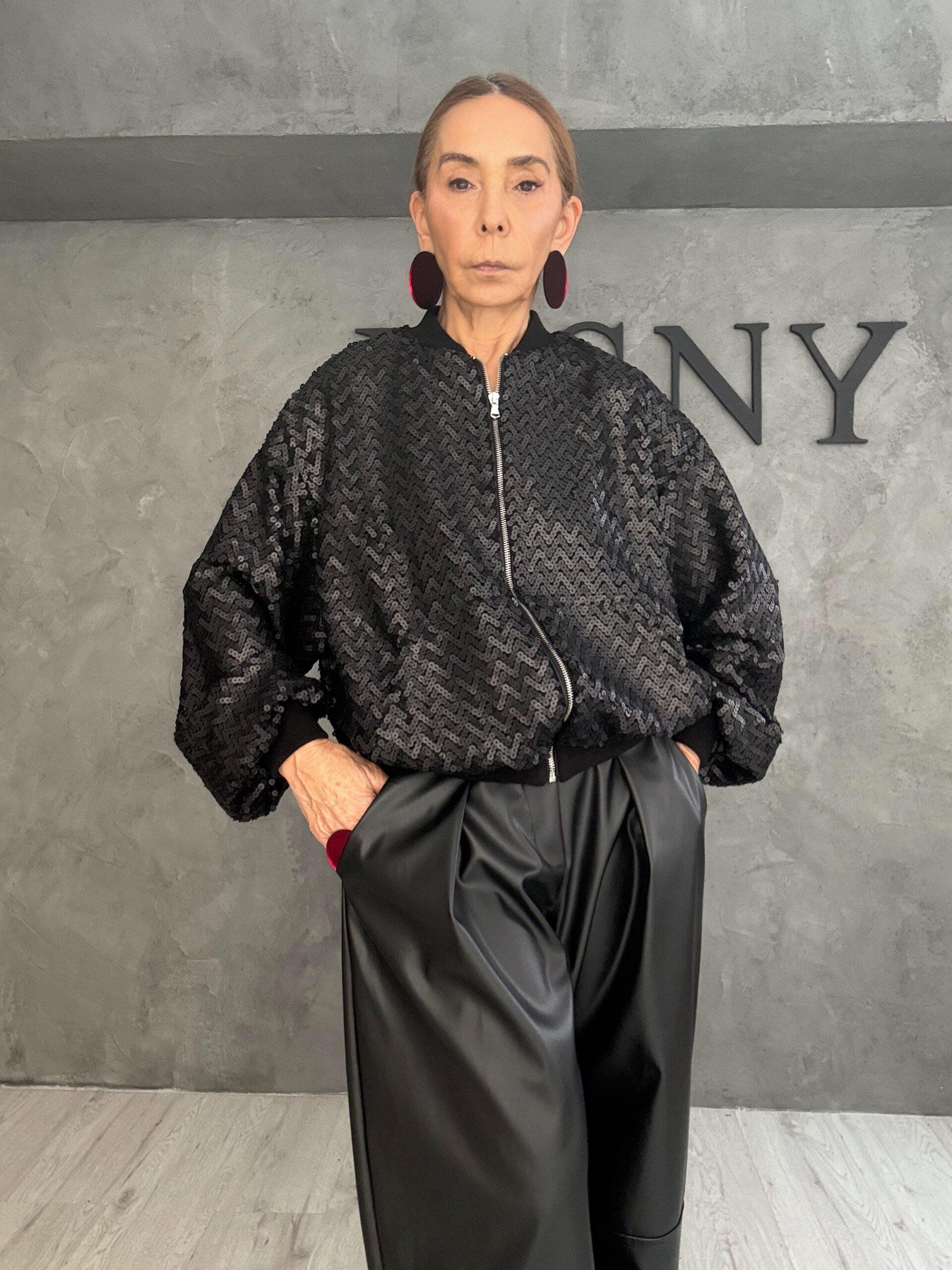 Μαύρο bomber με διακριτική παγιέτα, σχεδιασμένο για να ισορροπεί ανάμεσα στη δομή και την άνεση. Η relaxed γραμμή του δίνει όγκο χωρίς να βαραίνει, ενώ το φερμουάρ και το τελείωμα κρατούν το σύνολο καθαρό και ελεγχόμενο. Το υλικό προσθέτει βάθος στο total black, χωρίς να χρειάζεται έντονη αντίθεση. Ένα κομμάτι που λειτουργεί ως statement μέσα από τη φόρμα και όχι τη διακόσμηση.