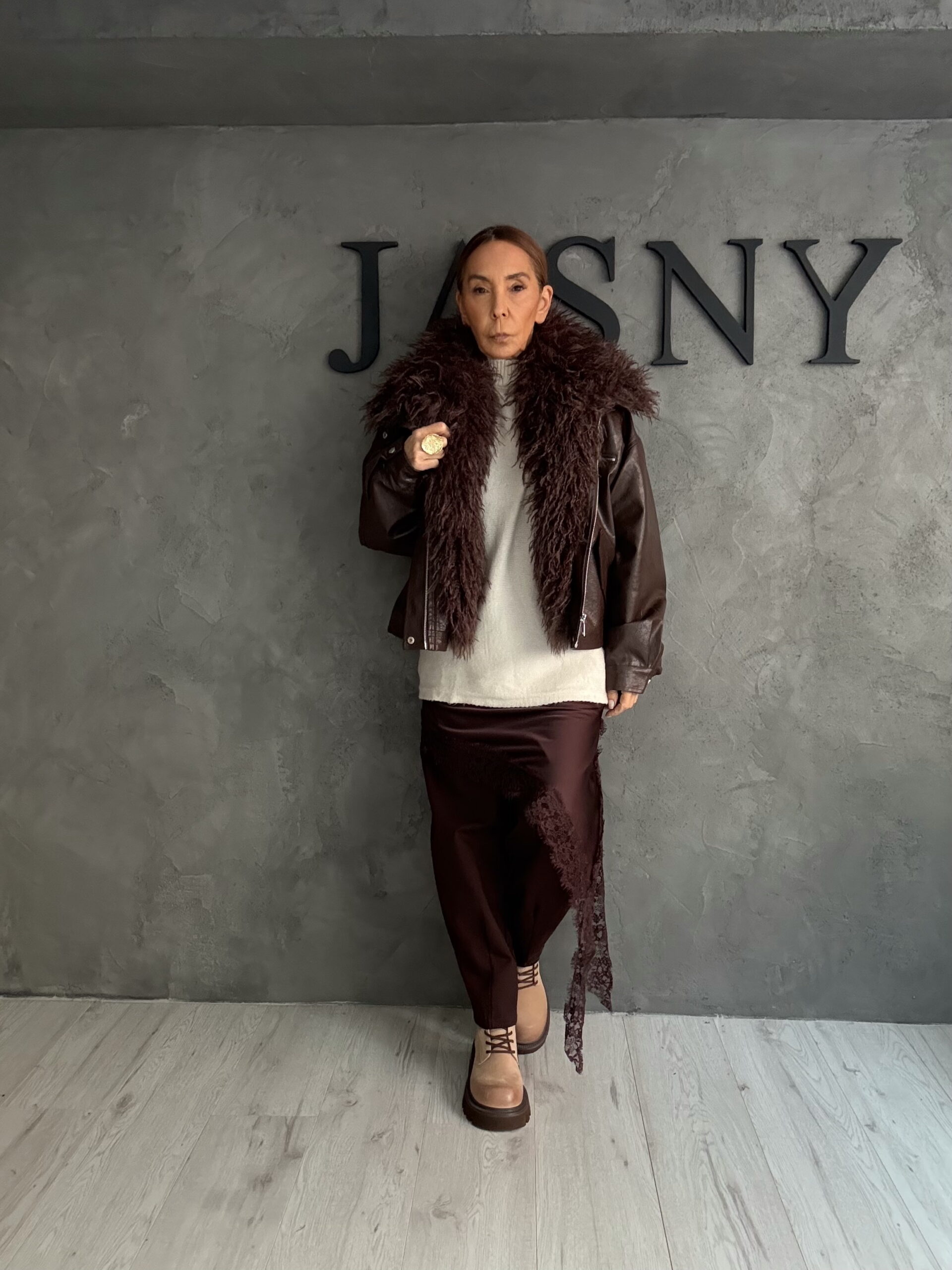 Ένα ολοκληρωμένο χειμερινό look με έντονη παρουσία και πολυτελή ισορροπία. Το καφέ δερμάτινο jacket με πλούσιο γούνινο γιακά λειτουργεί ως statement κομμάτι, προσθέτοντας όγκο, ένταση και προστασία. Το ανοιχτόχρωμο knit φωτίζει το σύνολο και δημιουργεί αντίθεση, ενώ η σατινέ φούστα σε βαθύ μπορντό με λεπτομέρεια δαντέλας προσθέτει θηλυκότητα και γιορτινή υφή.