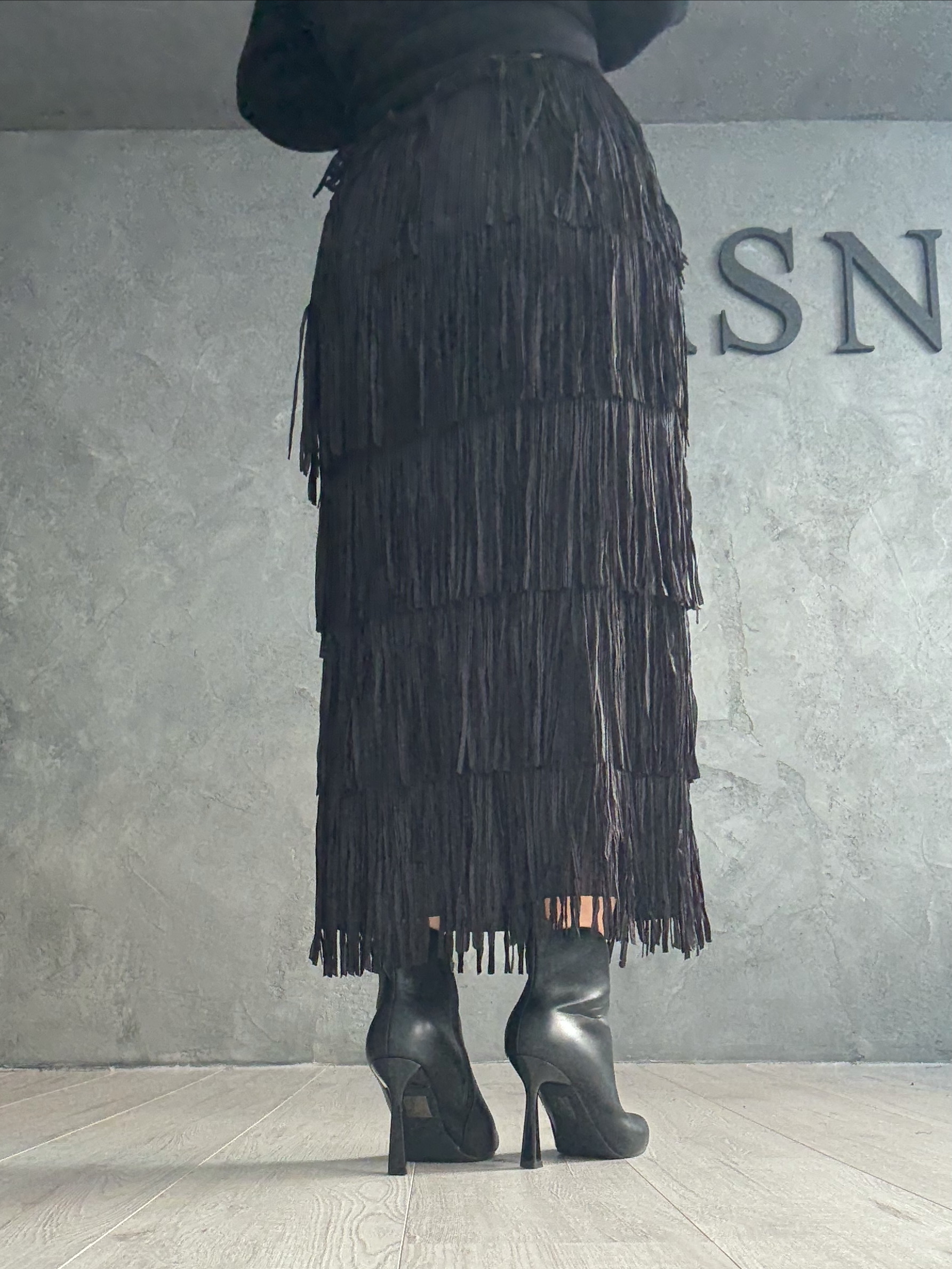 φούστα σε μαύρη απόχρωση με εντυπωσιακά κρόσσια σε επίπεδα που δημιουργούν κίνηση και ένταση στο περπάτημα. Ένα statement κομμάτι με δυναμικό χαρακτήρα, ιδανικό για εμφανίσεις που ξεχωρίζουν χωρίς υπερβολή.