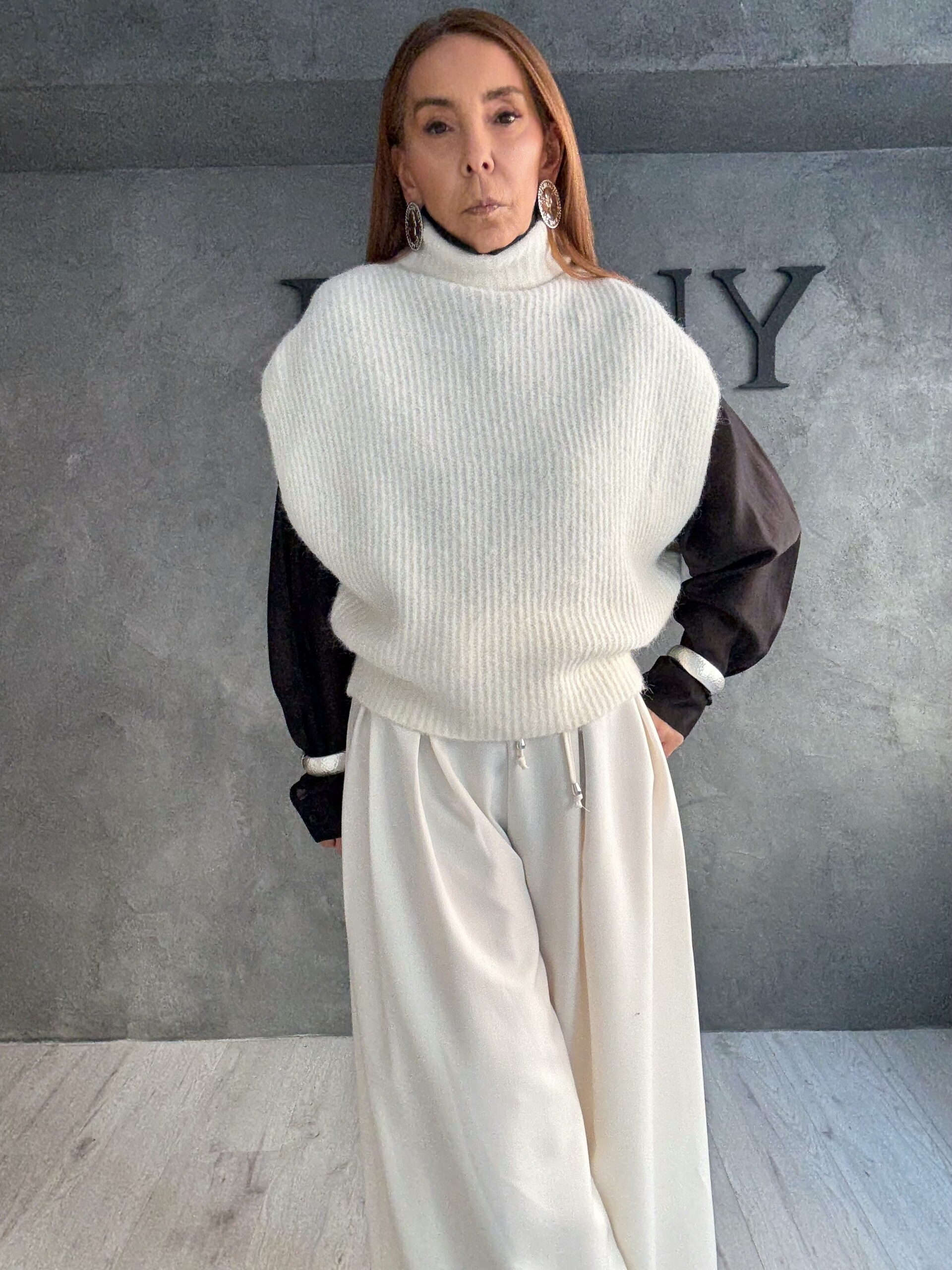 Αμάνικο πουλόβερ με καθαρό σχεδιασμό και σύγχρονη αισθητική, που δίνει έμφαση στην απλότητα και τη διαχρονικότητα. Η πλέξη του είναι απαλή και ευχάριστη στην αφή, ενώ το ύψος στον λαιμό προσθέτει διακριτική κομψότητα και ισορροπεί ιδανικά το σύνολο.