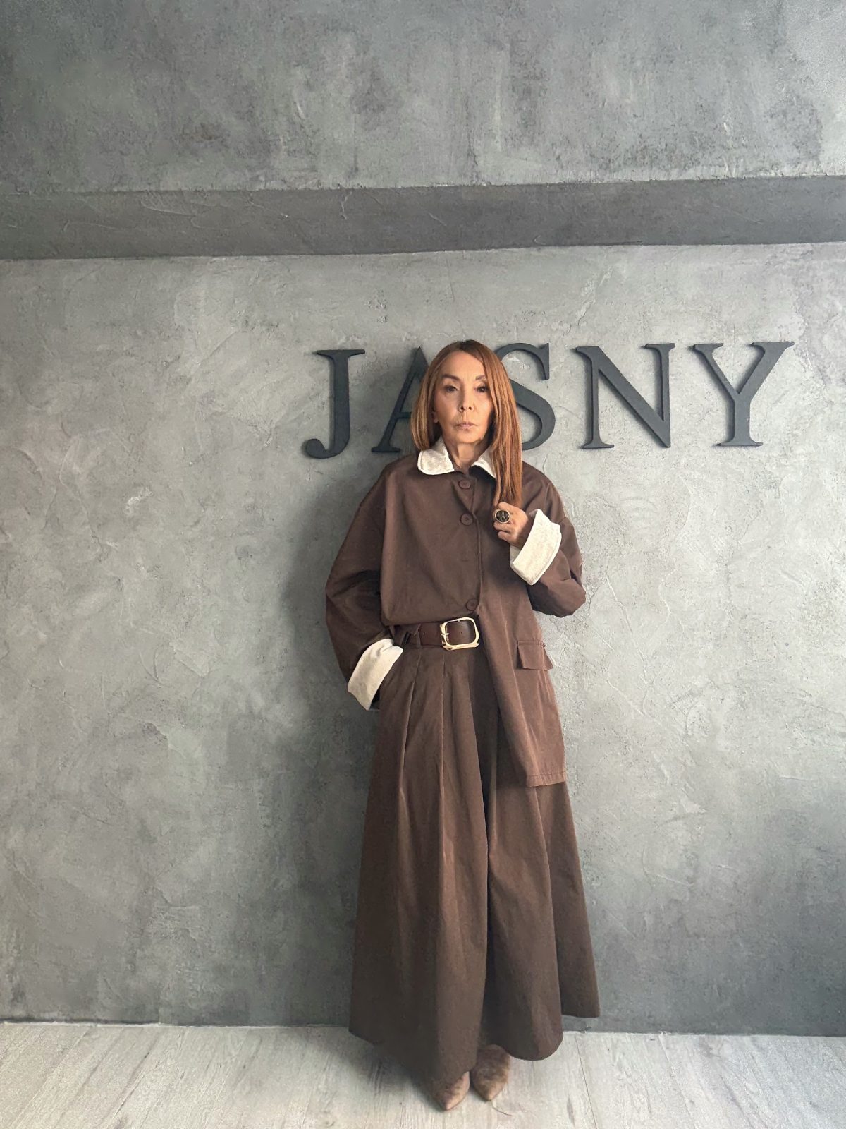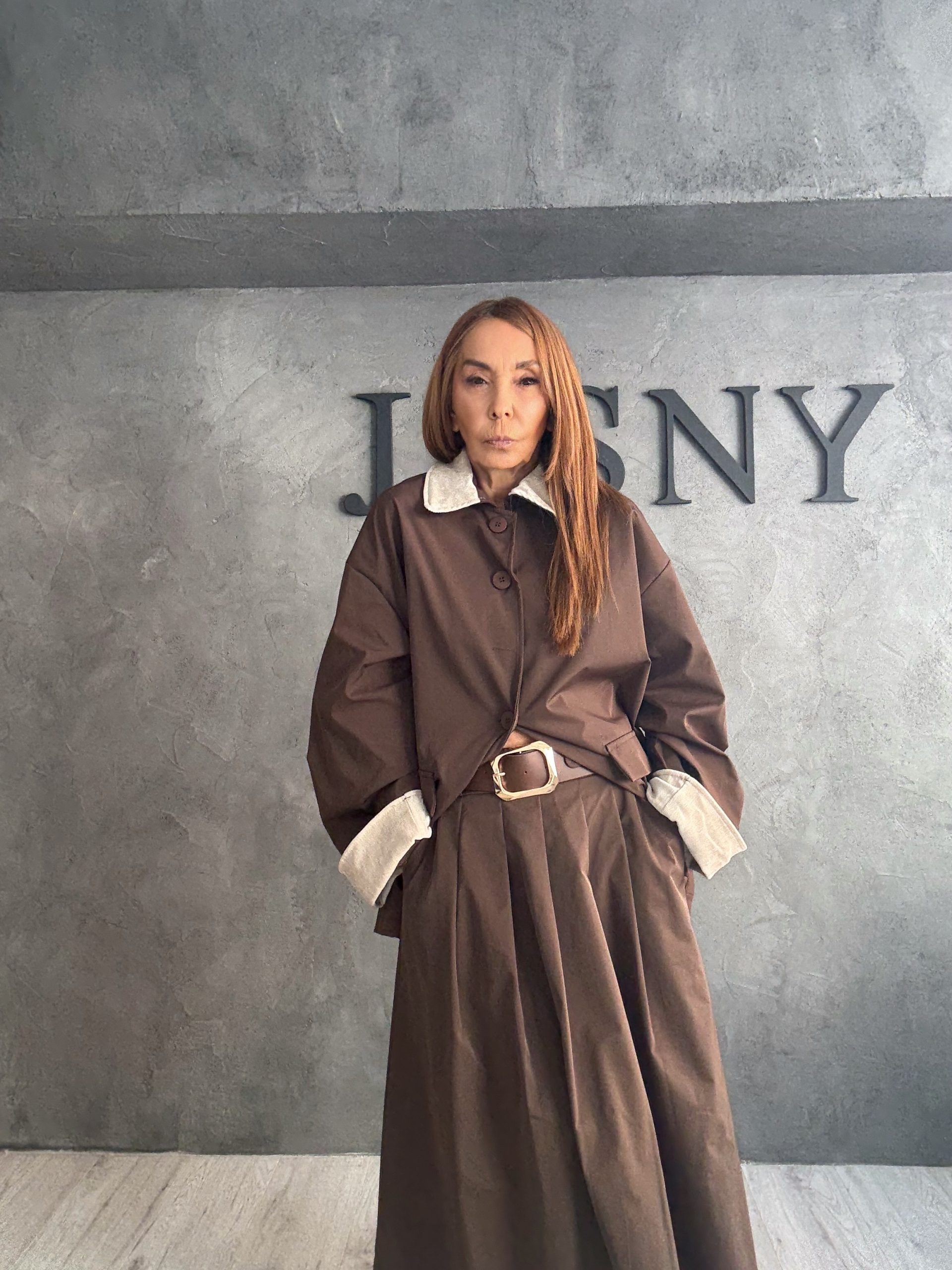 Το λουκ συνδυάζει γήινες αποχρώσεις και oversized γραμμές σε ένα minimal αλλά ιδιαίτερα κομψό αποτέλεσμα. Το καφέ σετ με cropped καπαρντίνα και φούστα δημιουργεί αίσθηση ρευστής σιλουέτας, ενώ η ζώνη με χρυσή αγκράφα προσδίδει δυναμισμό και δομή. Το εκρού contrast στο γιακά και στα μανίκια φέρνει μια πινελιά καθαρότητας και φρεσκάδας, ολοκληρώνοντας μια εικόνα που αποπνέει urban chic χαρακτήρα.