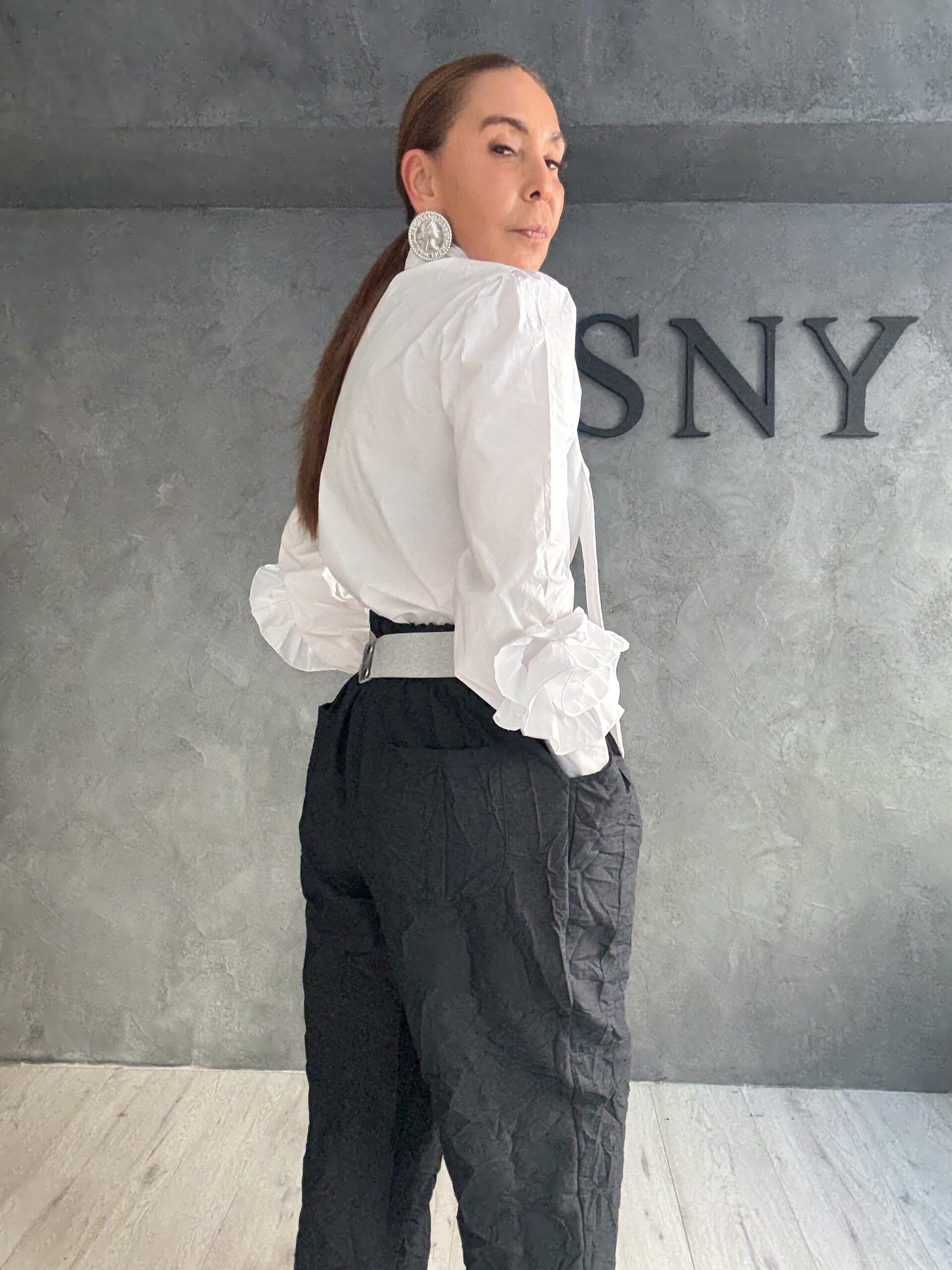 Λευκό πουκάμισο με έντονο design χαρακτήρα, που συνδυάζει καθαρές γραμμές με dramatic λεπτομέρειες. Ο ψηλός γιακάς με μακριά κορδέλα–δέσιμο δημιουργεί ένα elegant focal point, ενώ τα φουσκωτά μανίκια με ruffled τελείωμα προσθέτουν όγκο και σύγχρονη θηλυκότητα.