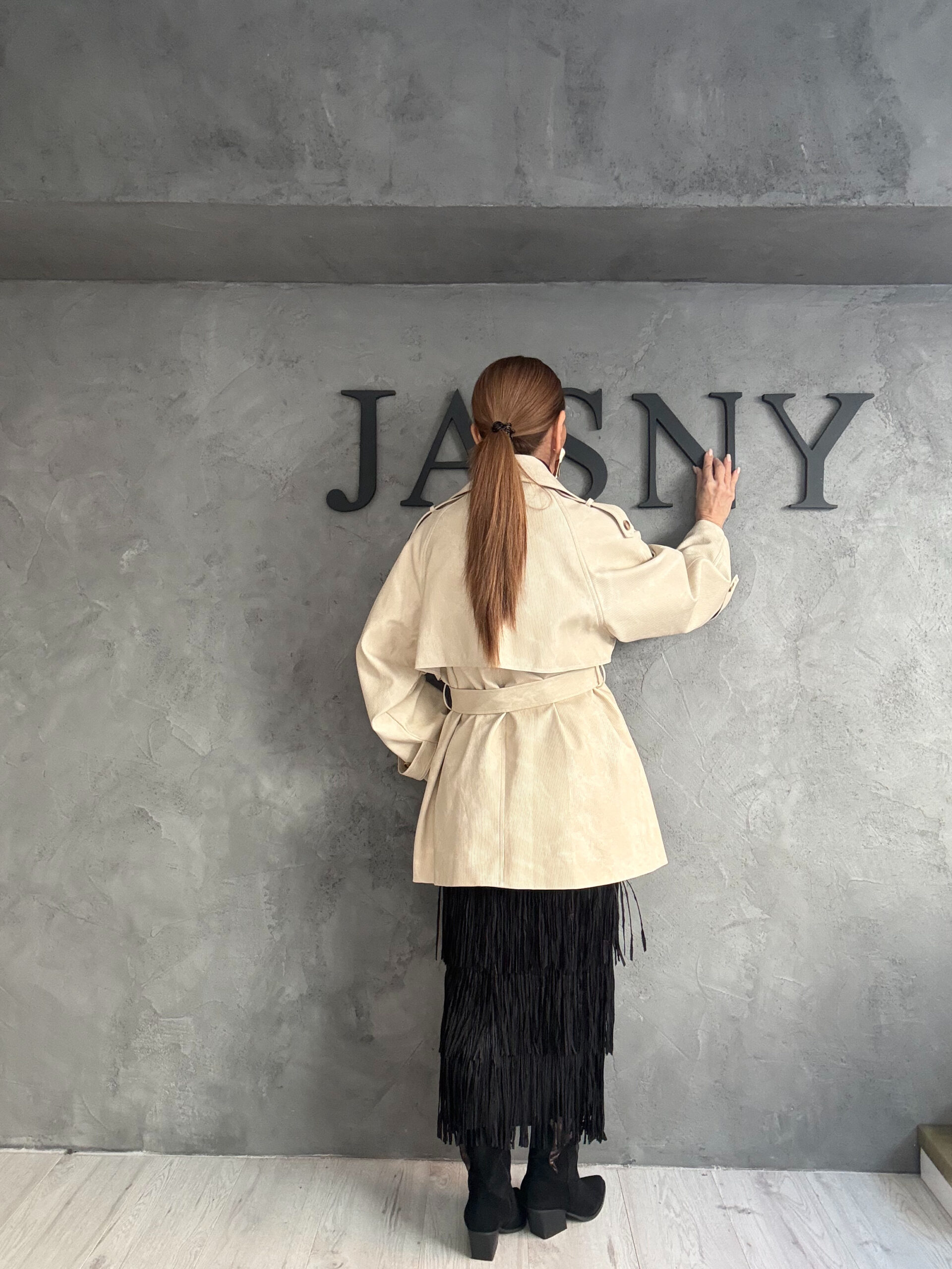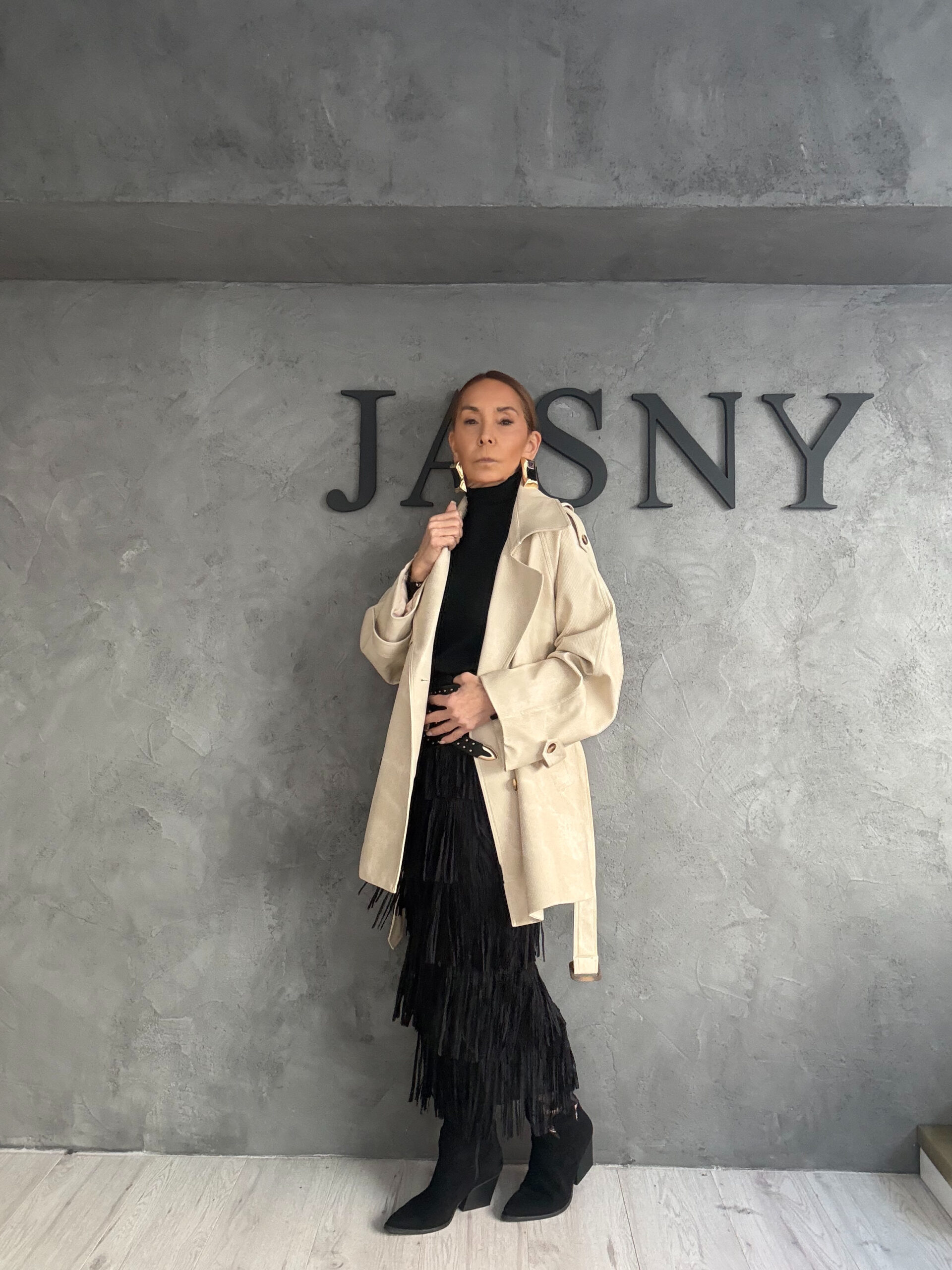 Ένα editorial look που ισορροπεί ιδανικά ανάμεσα στη δομή και την κίνηση. Το neutral jacket με καθαρές γραμμές και ήρεμο όγκο λειτουργεί ως σταθερό πλαίσιο, πάνω σε total black βάση που ενισχύει τη δυναμική του συνόλου. Η φούστα με κρόσσια προσθέτει ρυθμό και βάθος, δημιουργώντας αντίθεση ανάμεσα στο αυστηρό και το ρευστό. Η statement ζώνη στη μέση «δένει» το look, τονίζοντας τη σιλουέτα και προσθέτοντας χαρακτήρα χωρίς υπερβολή. Ένα σύνολο με έντονη παρουσία, που αποπνέει αυτοπεποίθηση και σύγχρονη κομψότητα.