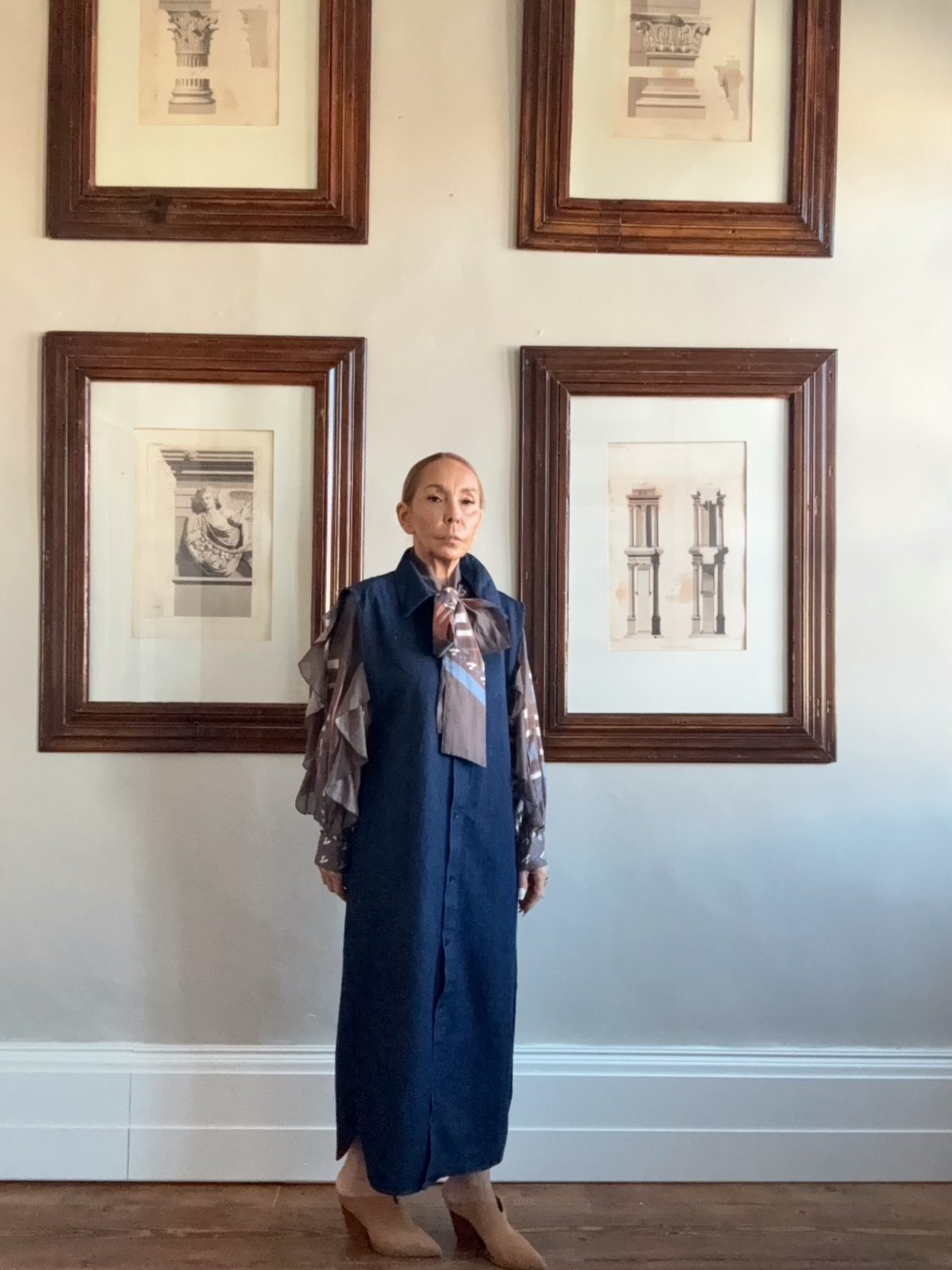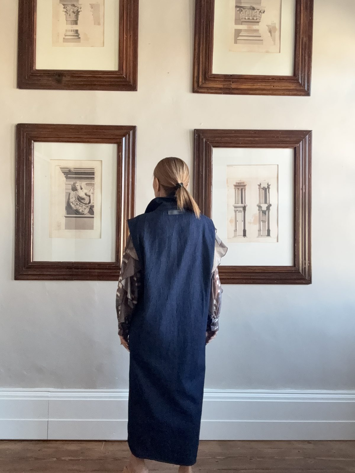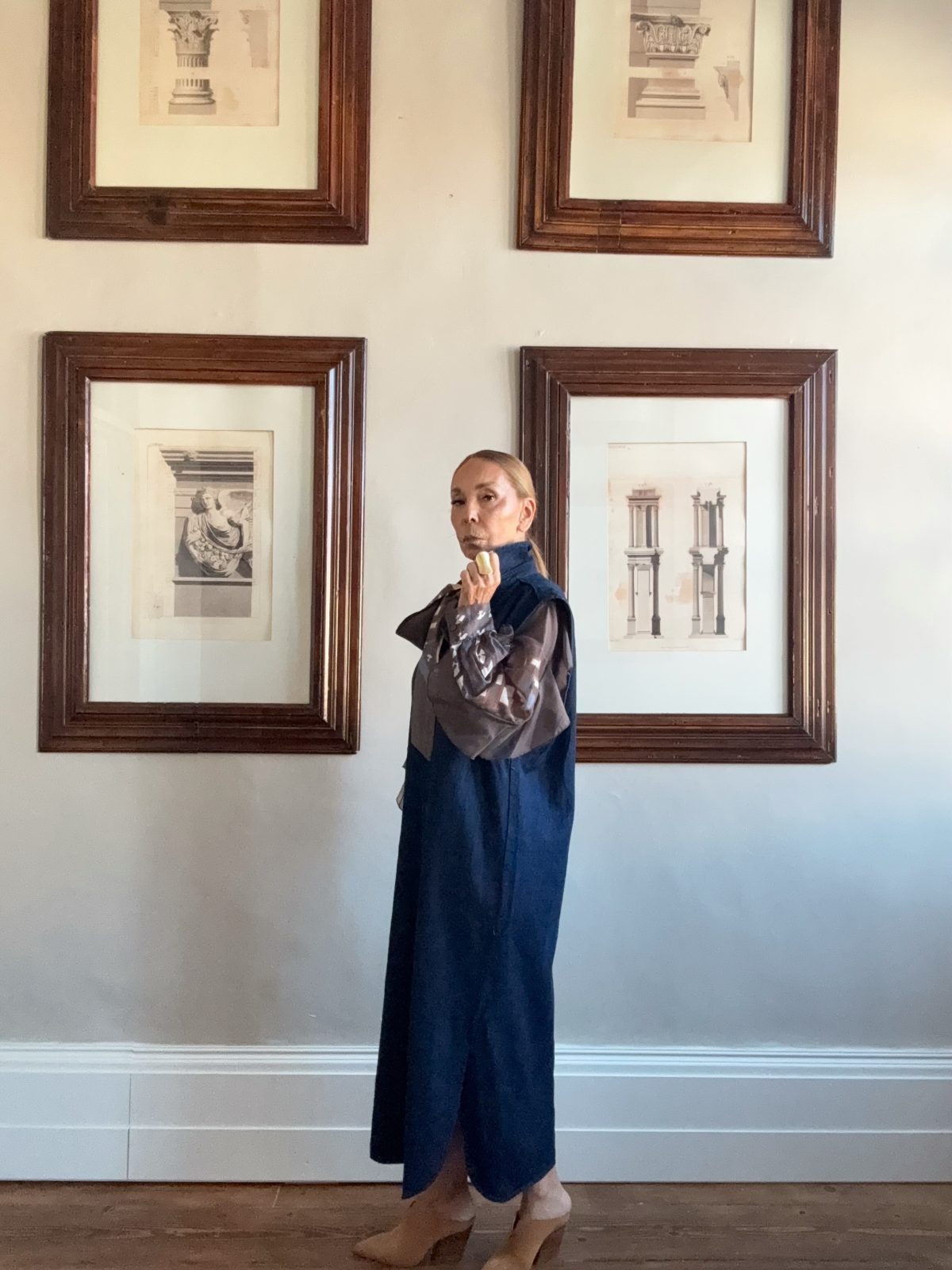 Ένα εκλεπτυσμένο look που ισορροπεί ανάμεσα στη μινιμαλιστική αυστηρότητα και στη σύγχρονη καλλιτεχνική αισθητική. Το μακρύ denim πανωφόρι σε σκούρο μπλε λειτουργεί ως statement κομμάτι, προσφέροντας καθαρές γραμμές και αίσθηση δομής. Από μέσα, το μεταλλιζέ πουκάμισο σε γήινους καφέ τόνους χαρίζει λάμψη και πολυτέλεια, δημιουργώντας ένα εντυπωσιακό layering εφέ. Το look ολοκληρώνεται με nude ψηλοτάκουνα παπούτσια που μακραίνουν τη σιλουέτα και δίνουν θηλυκή ισορροπία στην αυστηρή δομή του outfit.