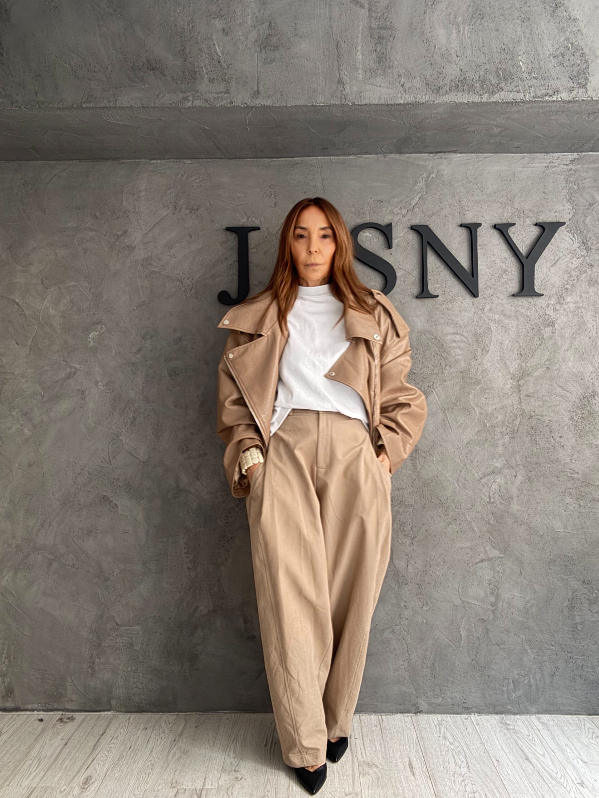 Ένα σύνολο που εκφράζει τη σύγχρονη minimal πολυτέλεια μέσα από καθαρές γραμμές και ήρεμες γήινες αποχρώσεις. Το jacket σε απαλή ταμπά απόχρωση με τη δομημένη αλλά χαλαρή εφαρμογή δημιουργεί ένα ισχυρό, fashion αποτέλεσμα, ενώ το wide παντελόνι χαρίζει ρευστότητα και κίνηση στη σιλουέτα. Ο συνδυασμός των neutral τόνων λειτουργεί αρμονικά, δίνοντας ένα αποτέλεσμα που είναι διαχρονικό, εκλεπτυσμένο και ιδιαίτερα ευέλικτο.