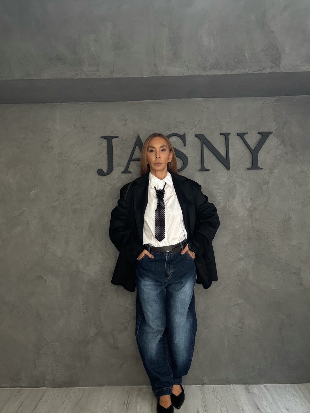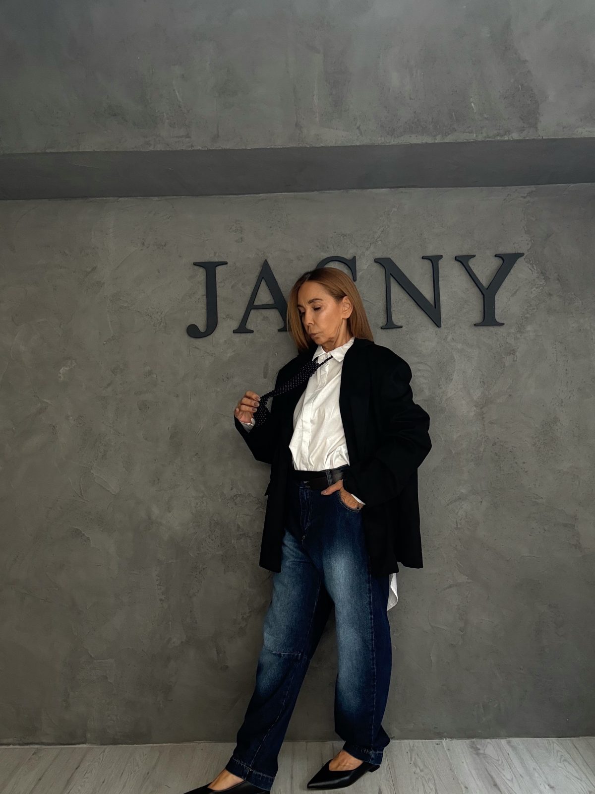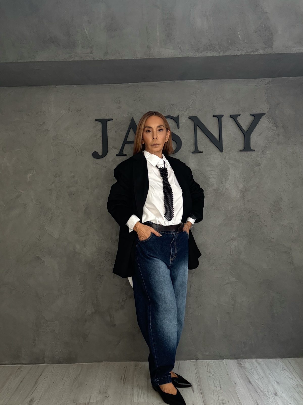 Ένα look που συνδυάζει το αυστηρό tailoring με τη χαλαρή άνεση του denim. Το μαύρο oversized σακάκι και το λευκό πουκάμισο με statement μαύρη γραβάτα-κολιέ δίνουν power dressing χαρακτήρα, ενώ το relaxed blue jean σπάει την αυστηρότητα και φέρνει φρέσκια, urban ισορροπία. Τα μαύρα μυτερά flats ολοκληρώνουν το look με minimal κομψότητα.