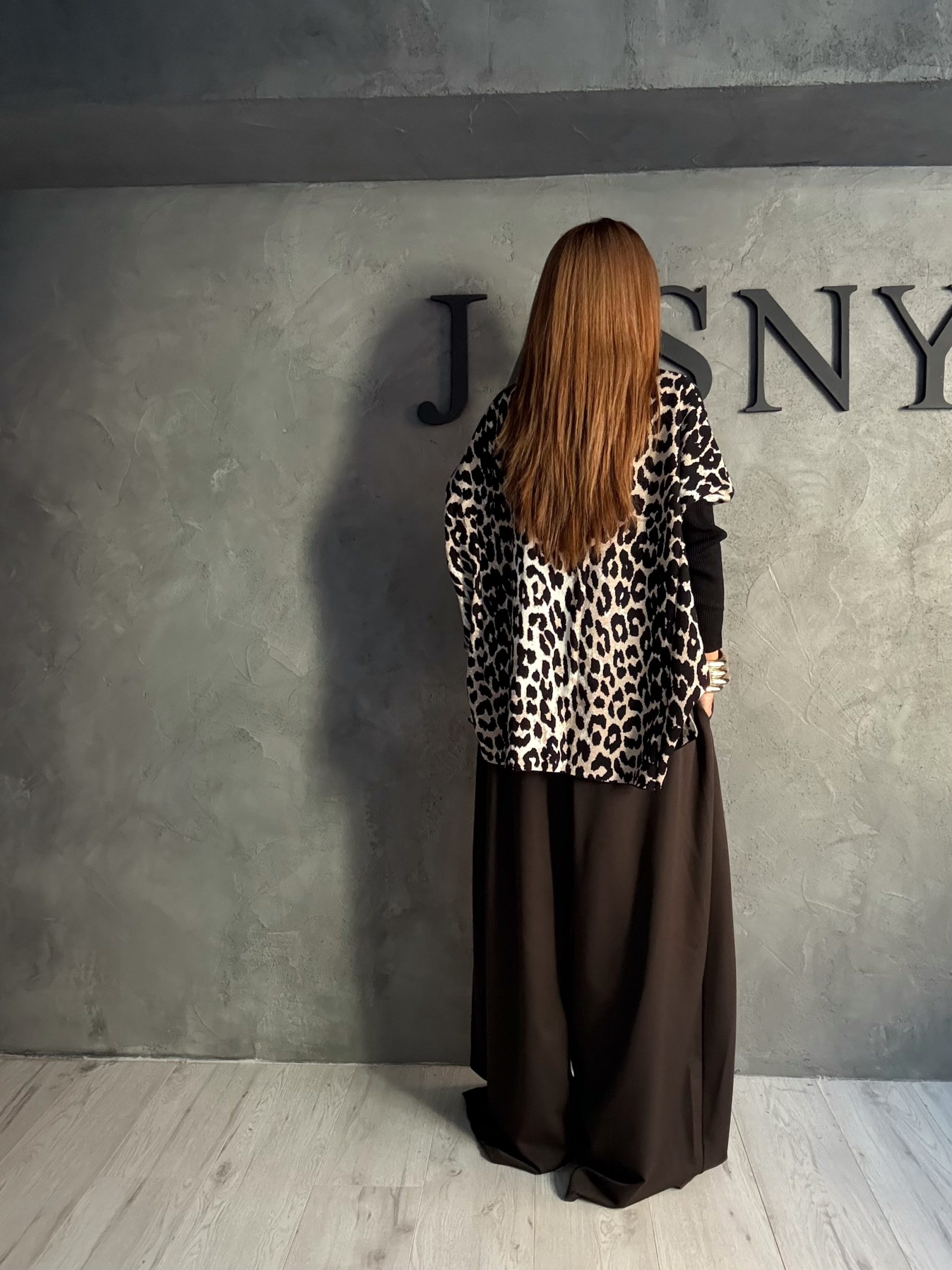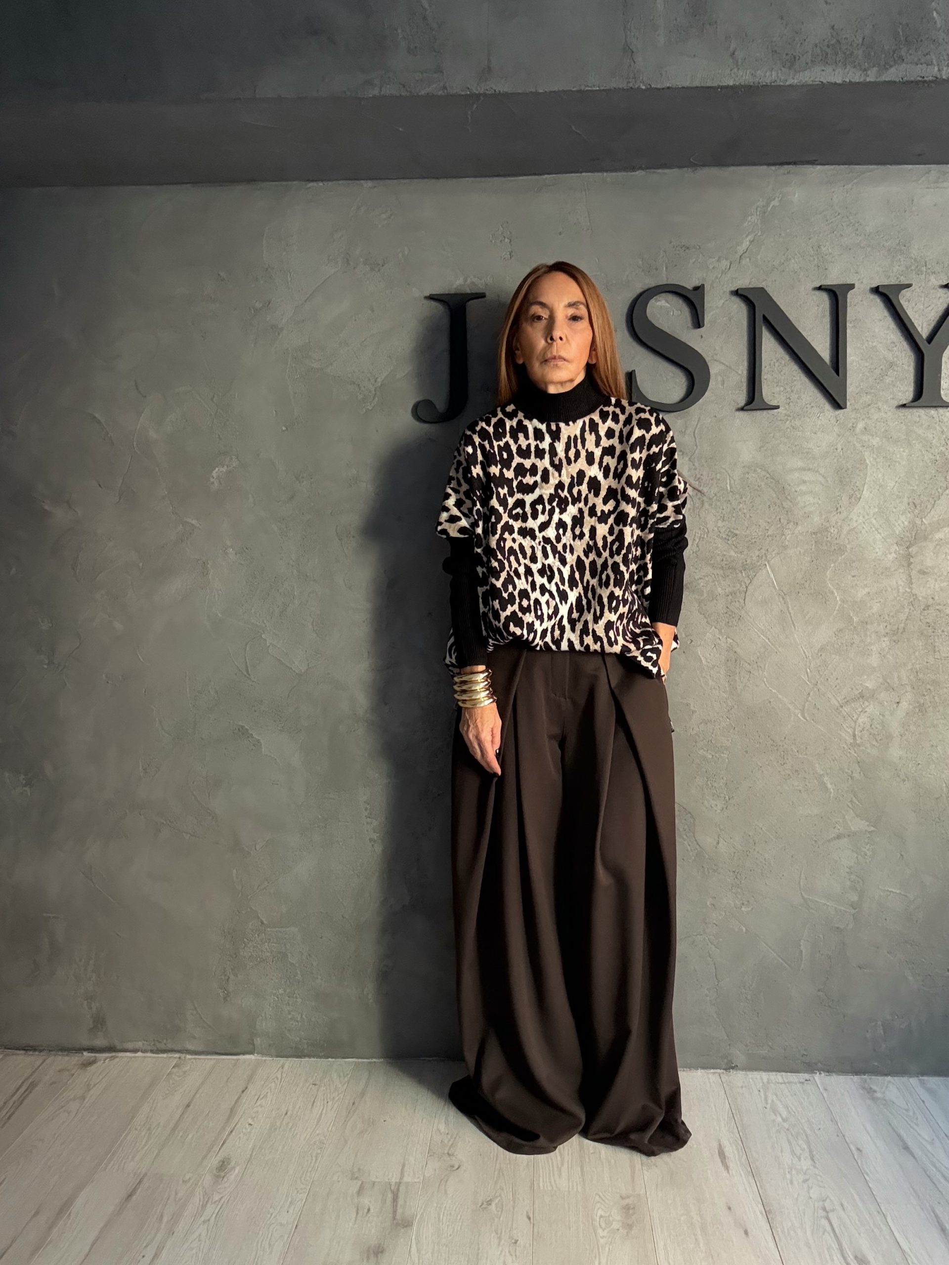 Ένα σύγχρονο, fashion-forward σύνολο που συνδυάζει την άνεση με τη δυναμική αισθητική. Η oversized animal-print μπλούζα προσθέτει ένταση και χαρακτήρα, ενώ το μαύρο wide-leg παντελόνι με τις αρχιτεκτονικές πιέτες δημιουργεί sculptural σιλουέτα με υπέροχη κίνηση. Το layering με μαύρο ζιβάγκο χαρίζει extra minimal διάθεση και καθαρή γραμμή, ιδανική για καθημερινή αλλά και πιο προσεγμένη εμφάνιση.