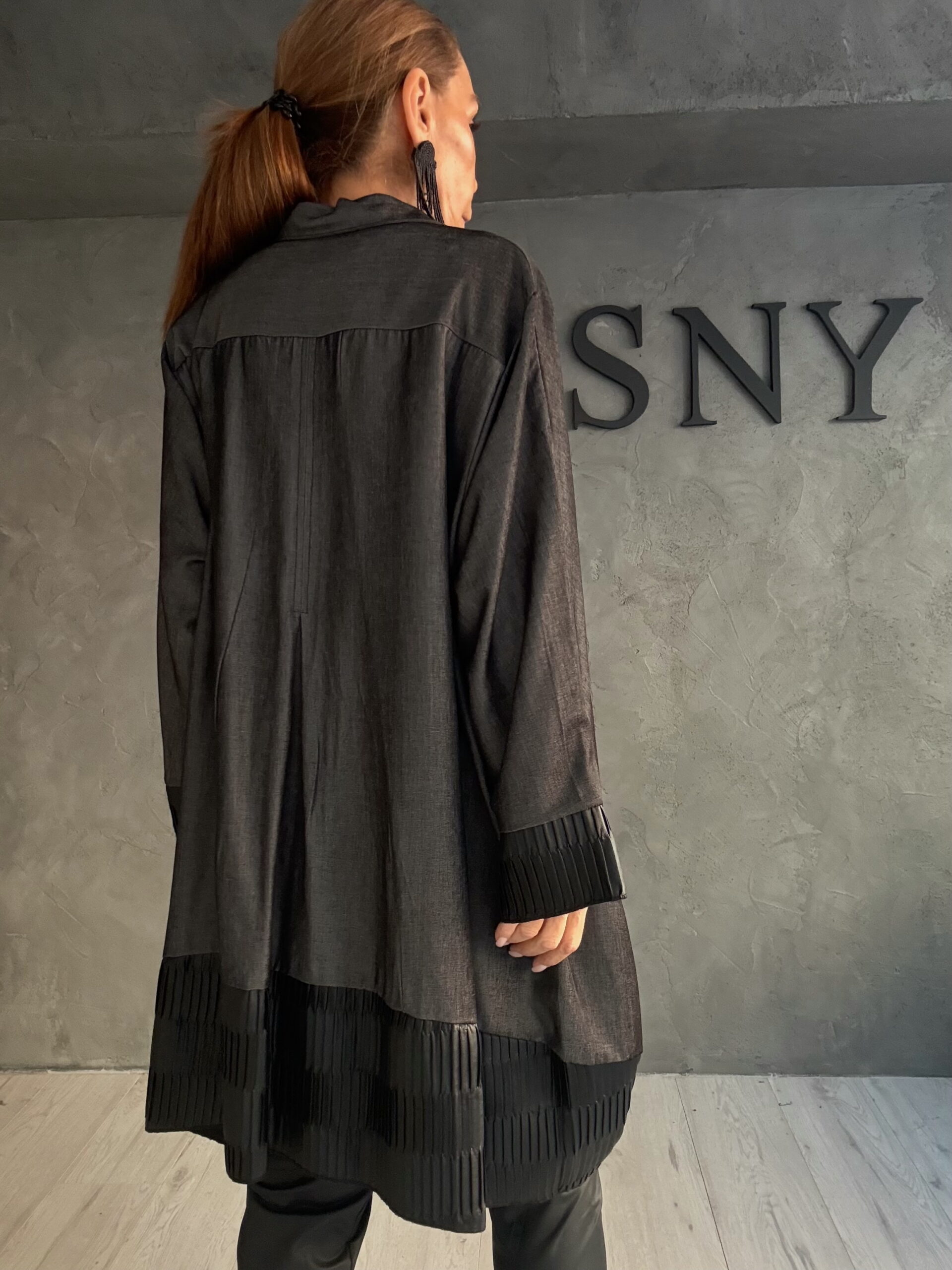 Πουκάμισο σε γκρι απόχρωση με oversized γραμμή και ασύμμετρο τελείωμα, σχεδιασμένο για άνεση και δυναμική κίνηση. Το ύφασμα πέφτει απαλά στο σώμα, ενώ οι πλισέ λεπτομέρειες στο τελείωμα και στα μανίκια προσθέτουν βάθος και ιδιαίτερο χαρακτήρα στο σχέδιο.