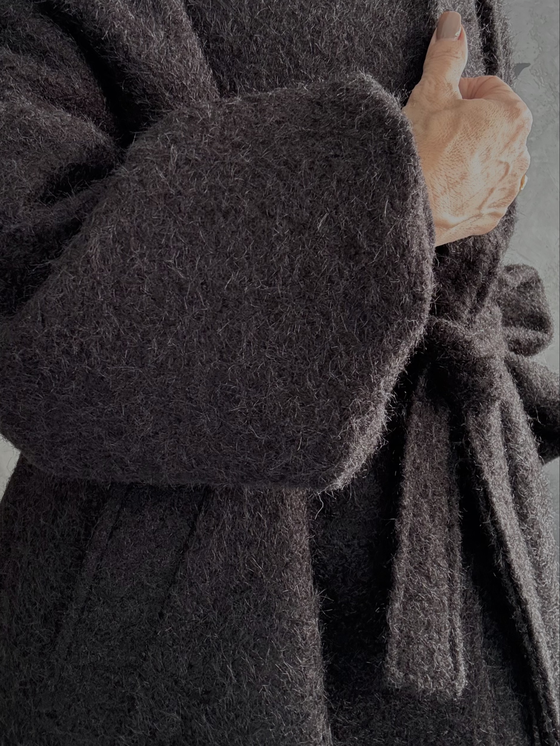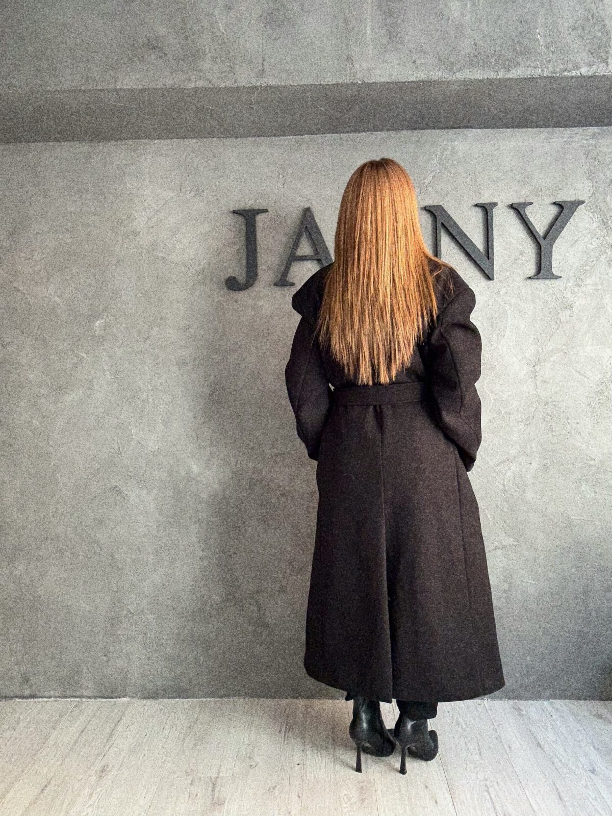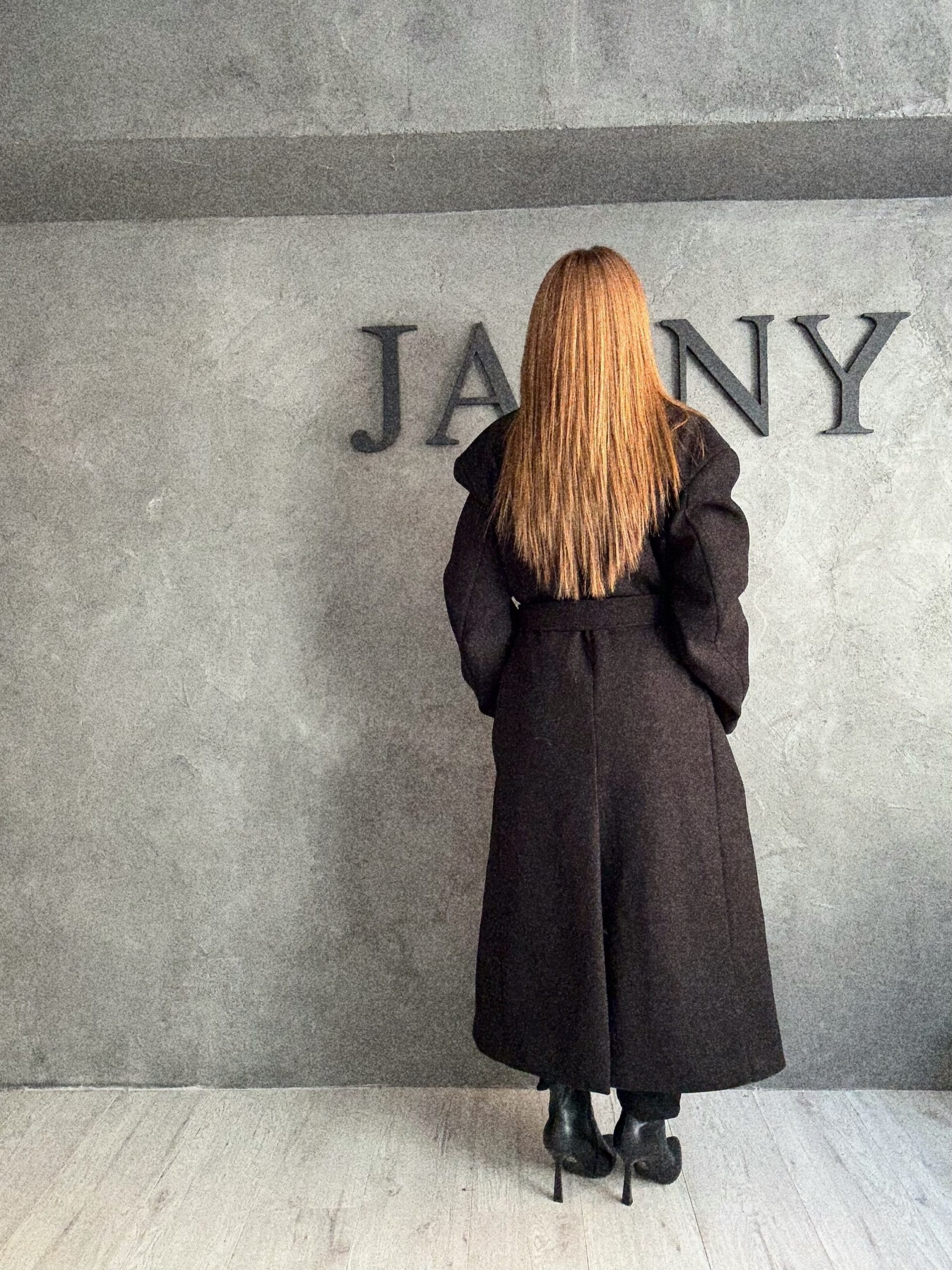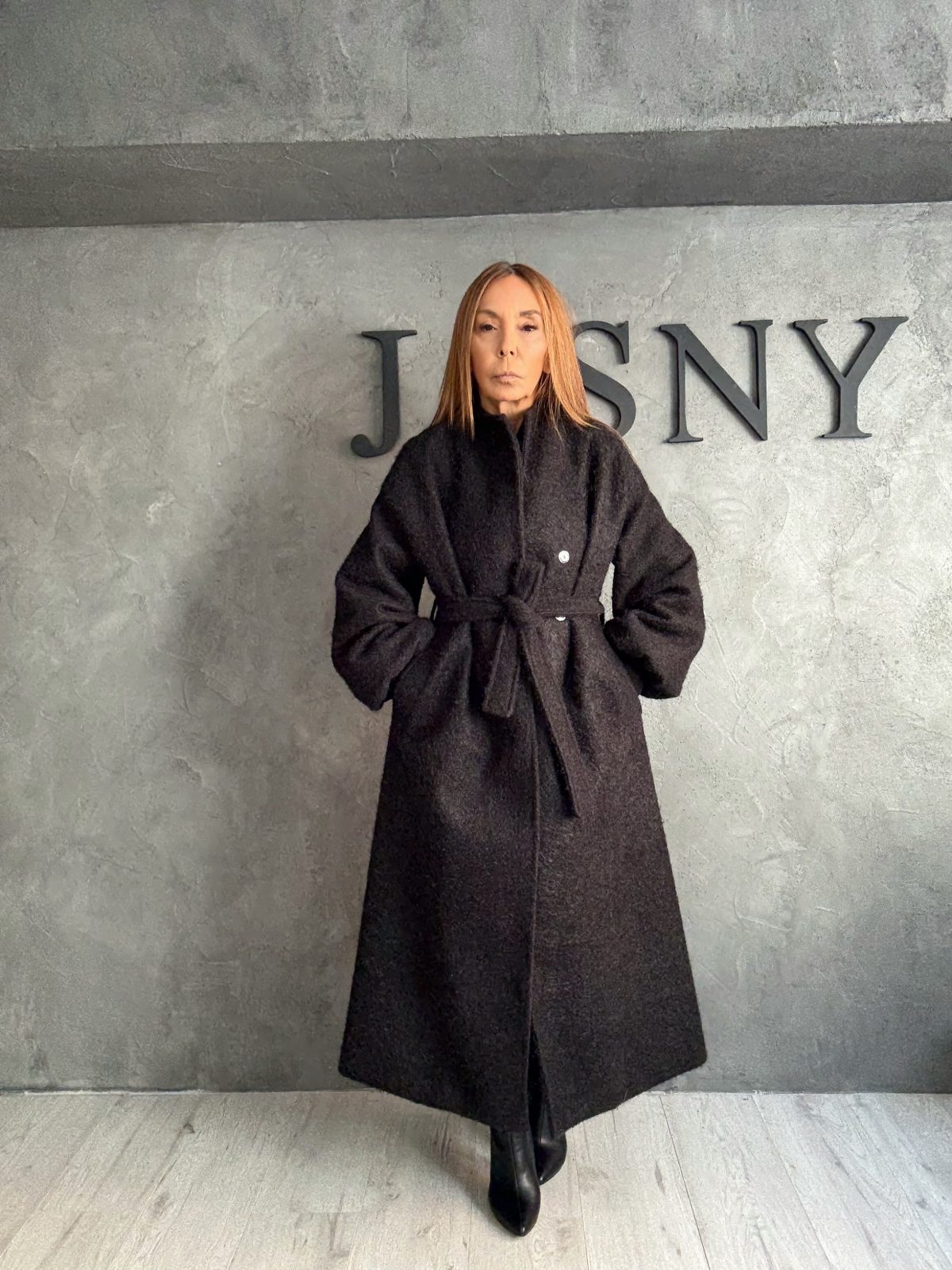 Μακρύ παλτό σε βαθύ μαύρο χρώμα, από πλούσιο boucle ύφασμα που συνδυάζει υφή και κομψότητα. Διαθέτει ίσια γραμμή, διακριτικό κουμπί και ζώνη στη μέσηκαι λάστιχο στο μανίκι για προσαρμοσμένη εφαρμογή. Η λιτή του αισθητική και η καθαρή γραμμή του το καθιστούν διαχρονικό κομμάτι – ιδανικό για elegant αλλά και σύγχρονες εμφανίσεις.
