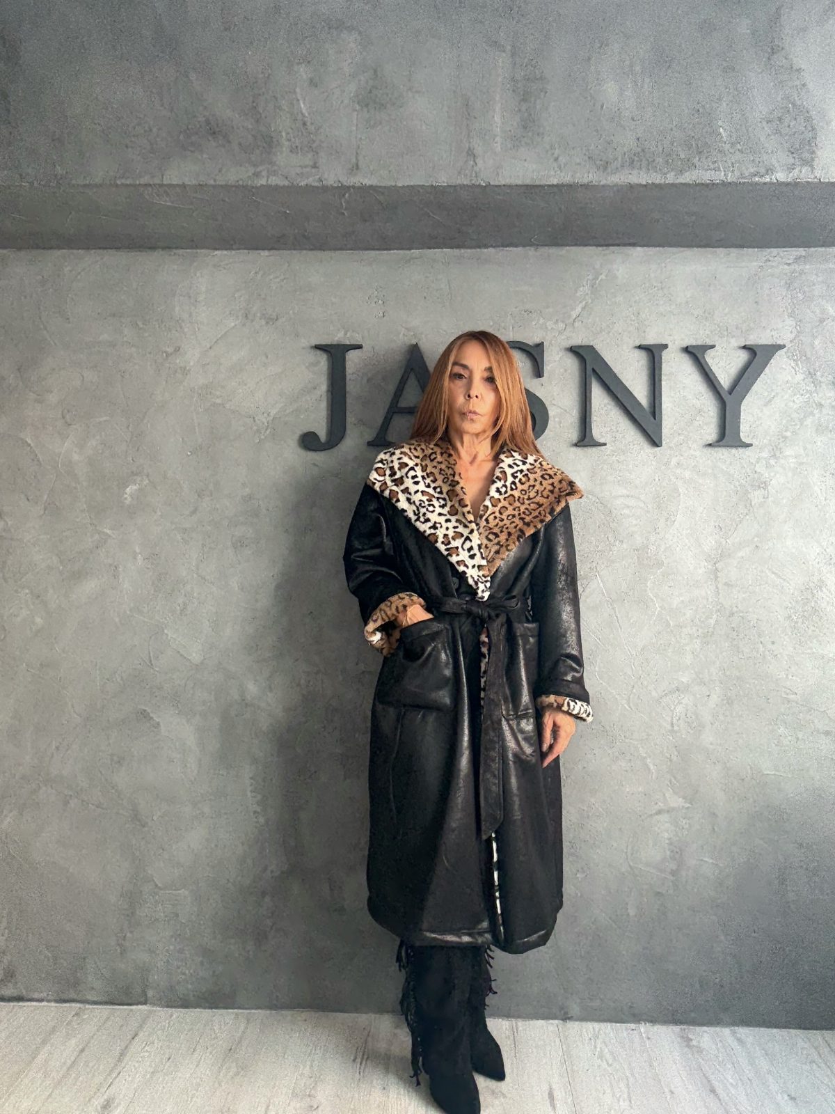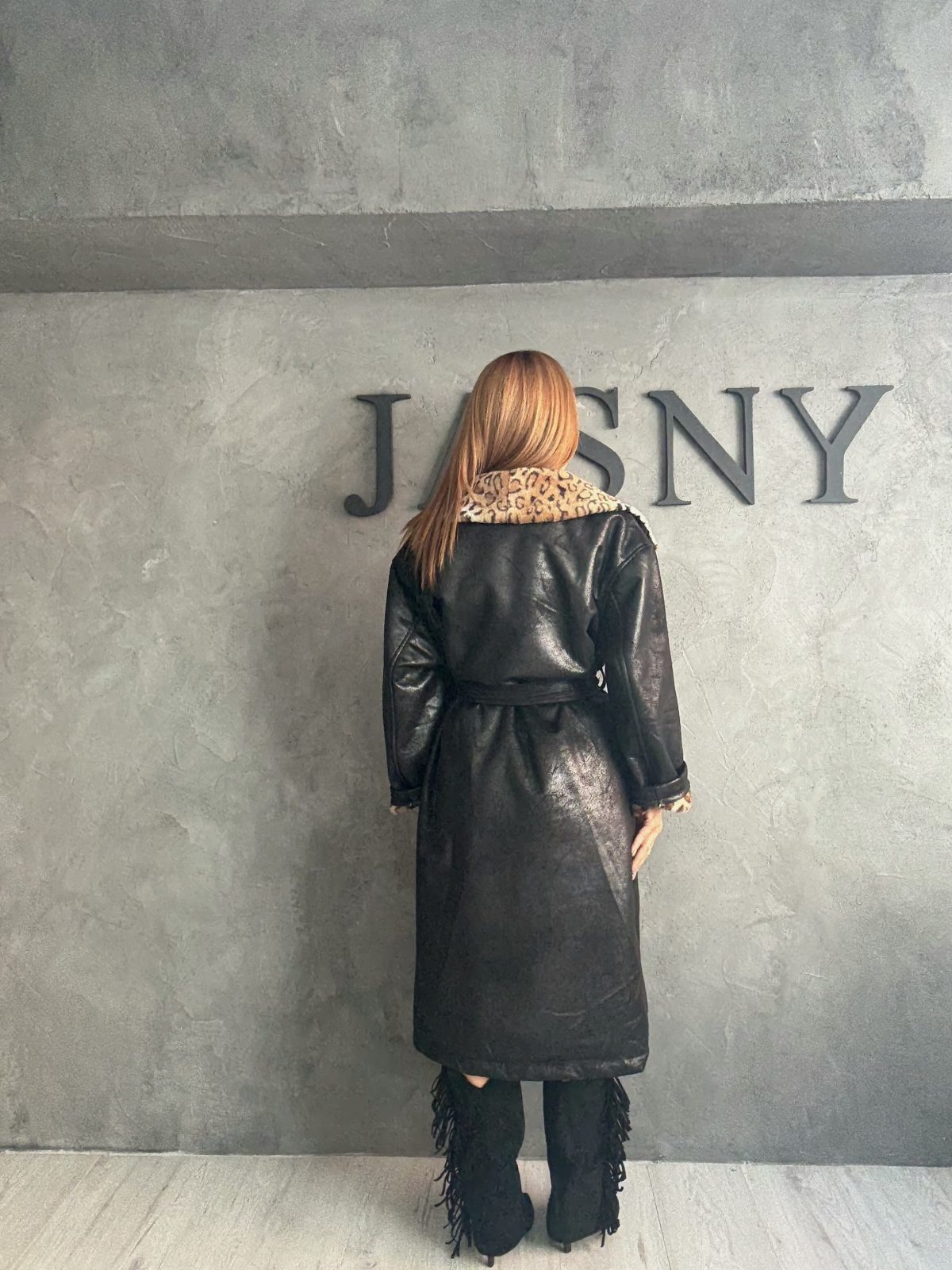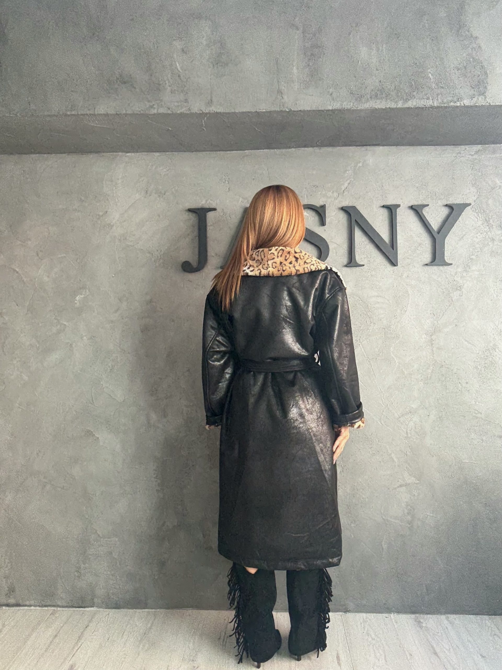 Ένα statement μακρύ παλτό σε μαύρη δερματίνη με ζεστή υφή, που απογειώνεται με γιακά και λεπτομέρειες σε animal print λεοπάρ. Η ζώνη στη μέση τονίζει τη σιλουέτα, ενώ οι μεγάλες τσέπες προσθέτουν πρακτικότητα και στιλ. Ένα κομμάτι που συνδυάζει πολυτέλεια και δυναμισμό, ιδανικό για εμφανίσεις που ξεχωρίζουν.