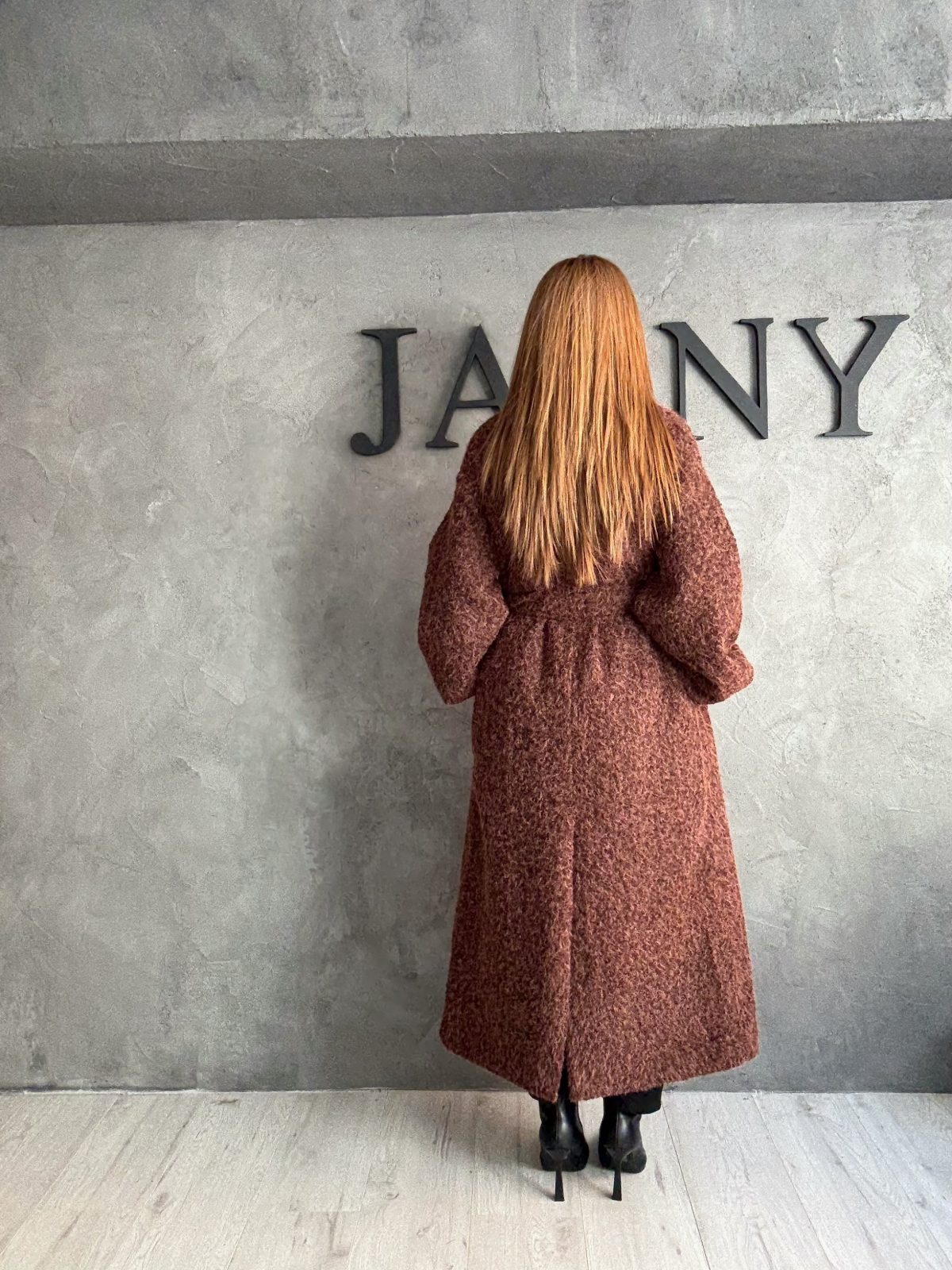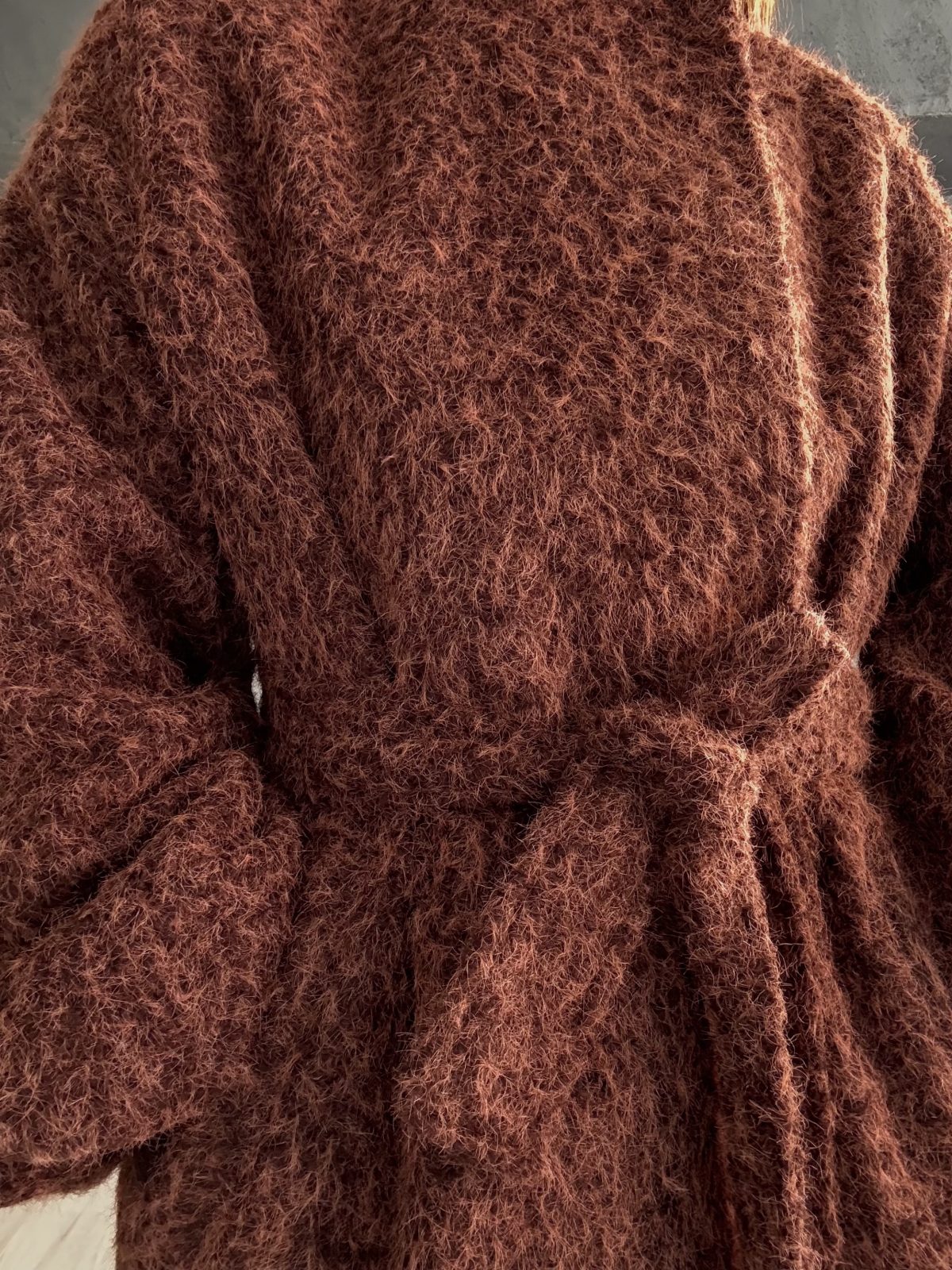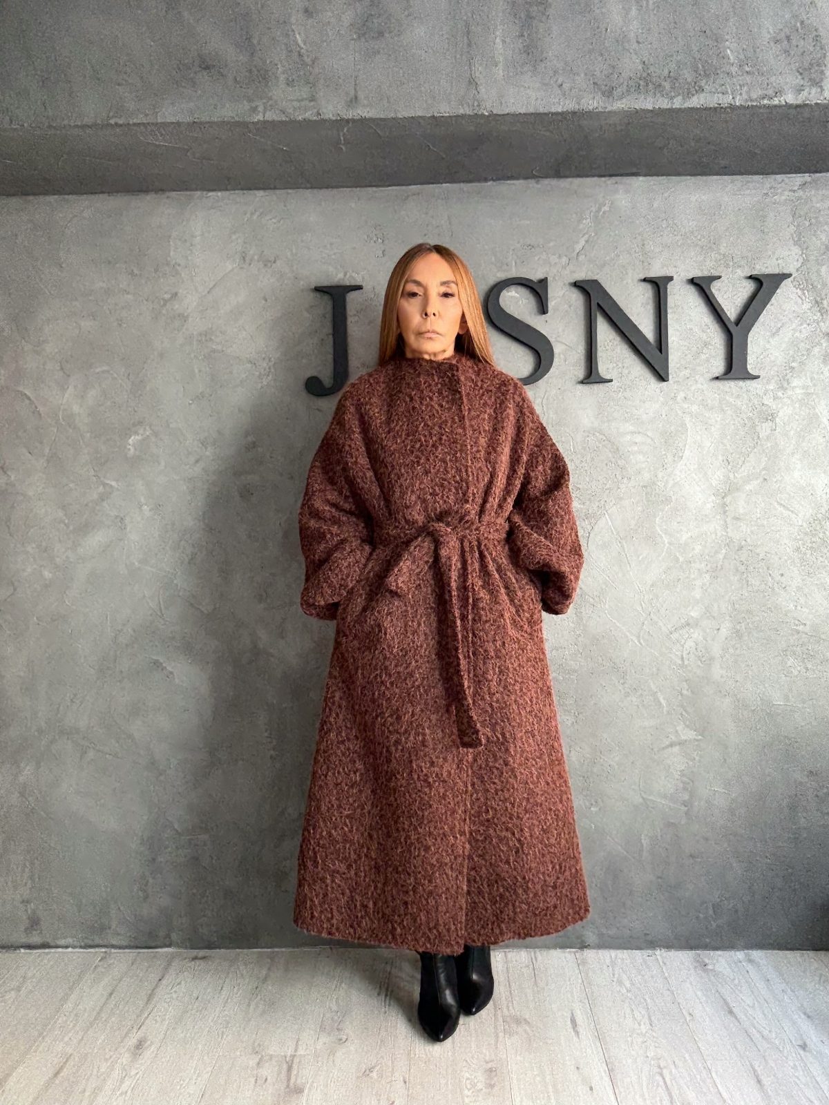 Μακρύ παλτό σε ζεστή καστανή απόχρωση, από αφράτο boucle ύφασμα που προσφέρει υφή και απαλότητα. Η minimal γραμμή του συνδυάζεται με χαλαρή εφαρμογή και ζώνη στη μέση, και λάστιχο στο μανίκι, δημιουργώντας ένα αποτέλεσμα που αποπνέει άνεση και διακριτική πολυτέλεια. Ένα cozy αλλά refined κομμάτι που δίνει χαρακτήρα σε κάθε εμφάνιση.