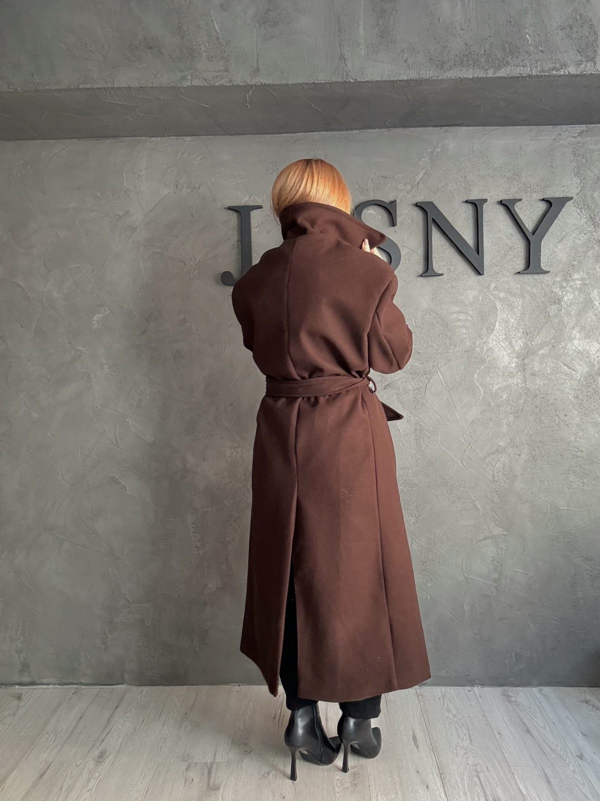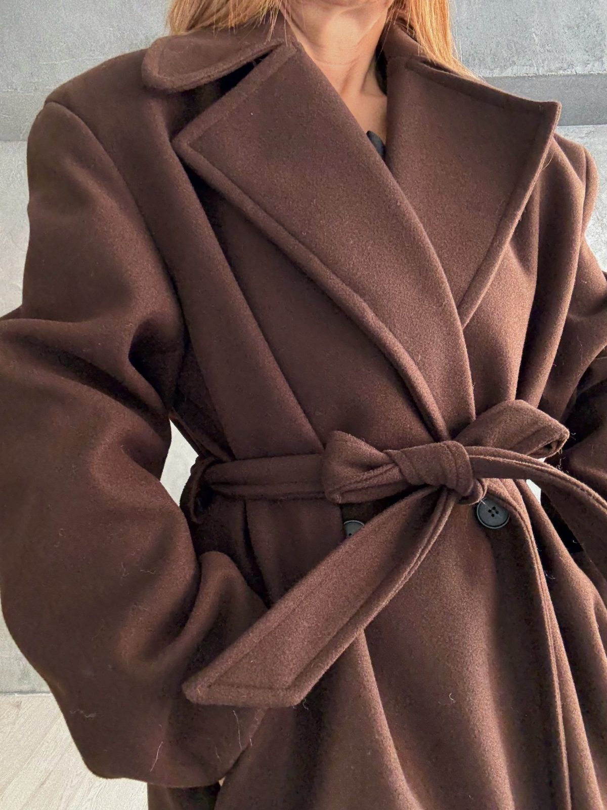 Μακρύ παλτό σε βαθιά σοκολατί απόχρωση, κατασκευασμένο από πολυτελές μάλλινο ύφασμα που προσφέρει δομή και ζεστασιά. Με έντονα πέτα, καθαρή γραμμή και ζώνη στη μέση, αγκαλιάζει το σώμα δημιουργώντας μια αρμονική και κομψή σιλουέτα. Ένα διαχρονικό κομμάτι που αποπνέει στιβαρότητα και κλασική θηλυκότητα.