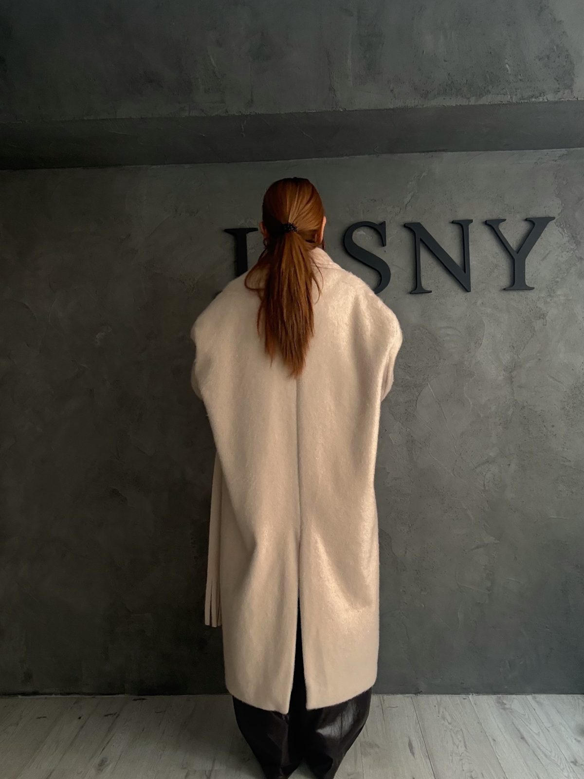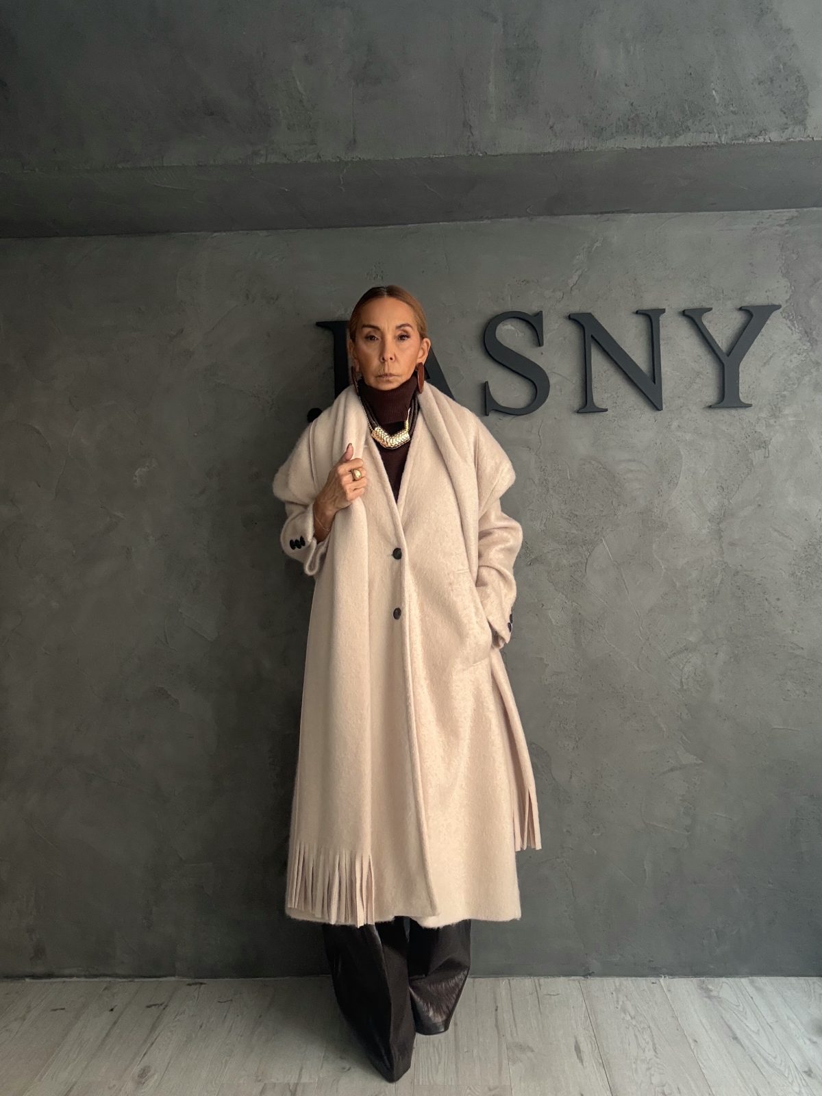 Μακρύ παλτό σε απαλή αμμώδη απόχρωση, με ελαφριά υφή και κομψό drape που πέφτει ρευστά στο σώμα. Το κασκόλ με διακριτικά κρόσσια στο τελείωμα προσθέτουν κίνηση και καλλιτεχνική ιδιαιτερότητα, ενώ η χαλαρή γραμμή προσφέρει φυσική κομψότητα χωρίς προσπάθεια. Ένα κομμάτι που ισορροπεί ανάμεσα στη minimal πολυτέλεια και το bohemian refinement.