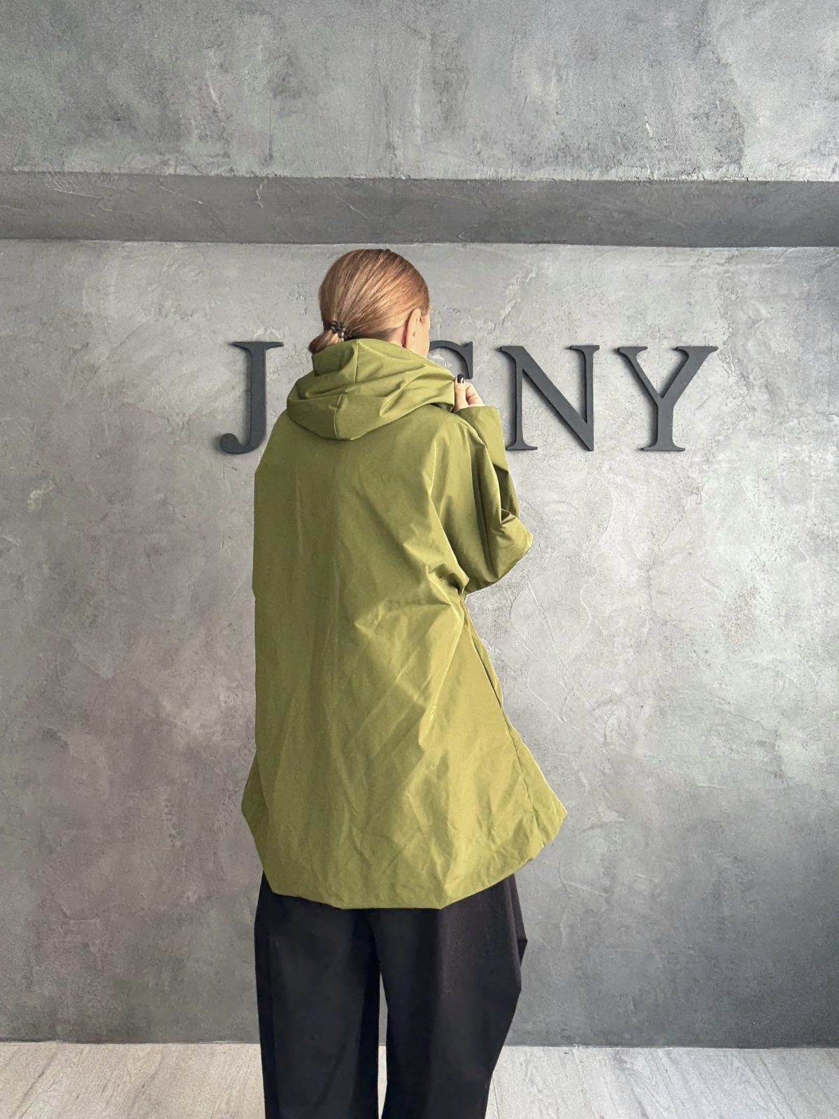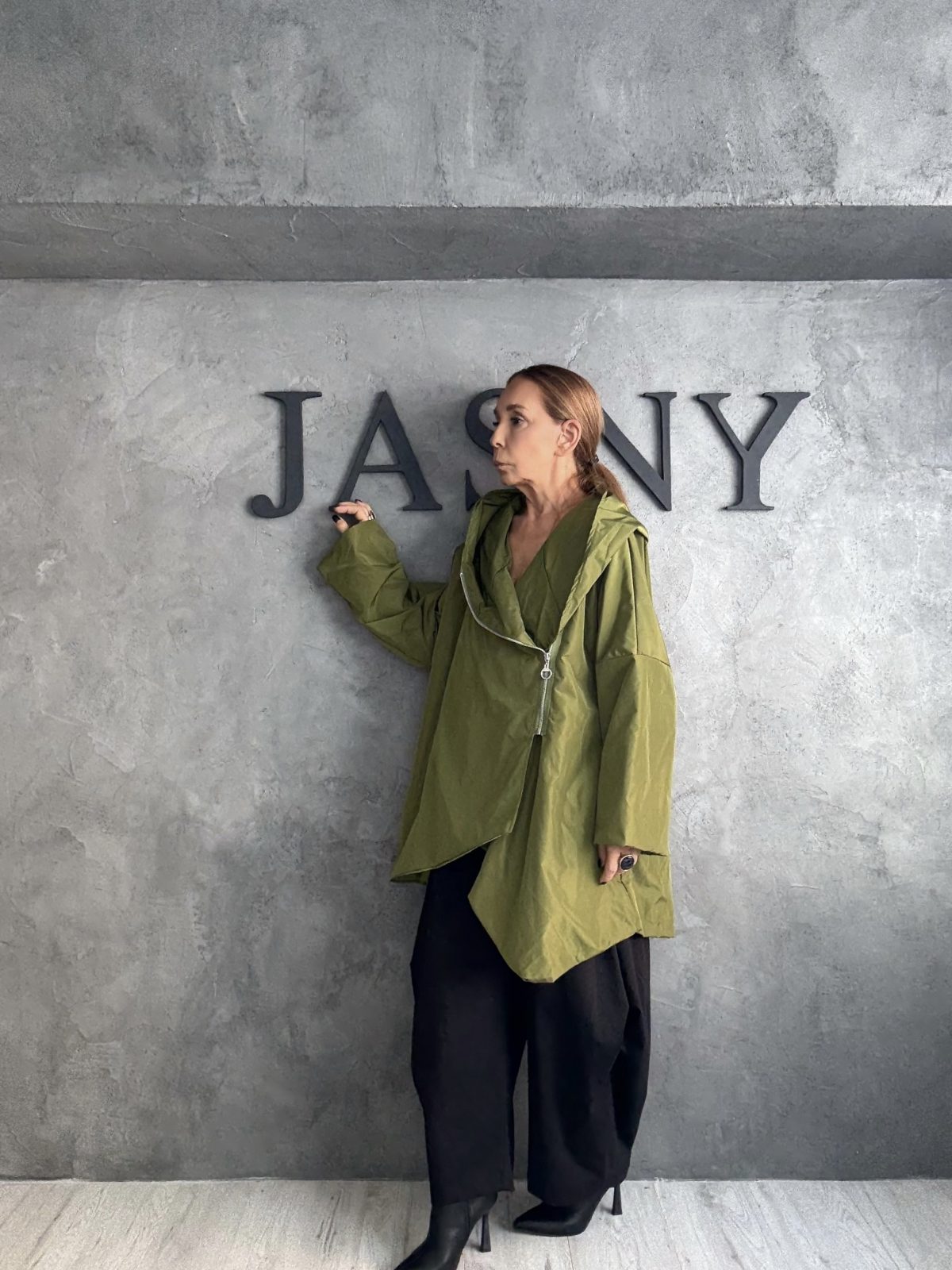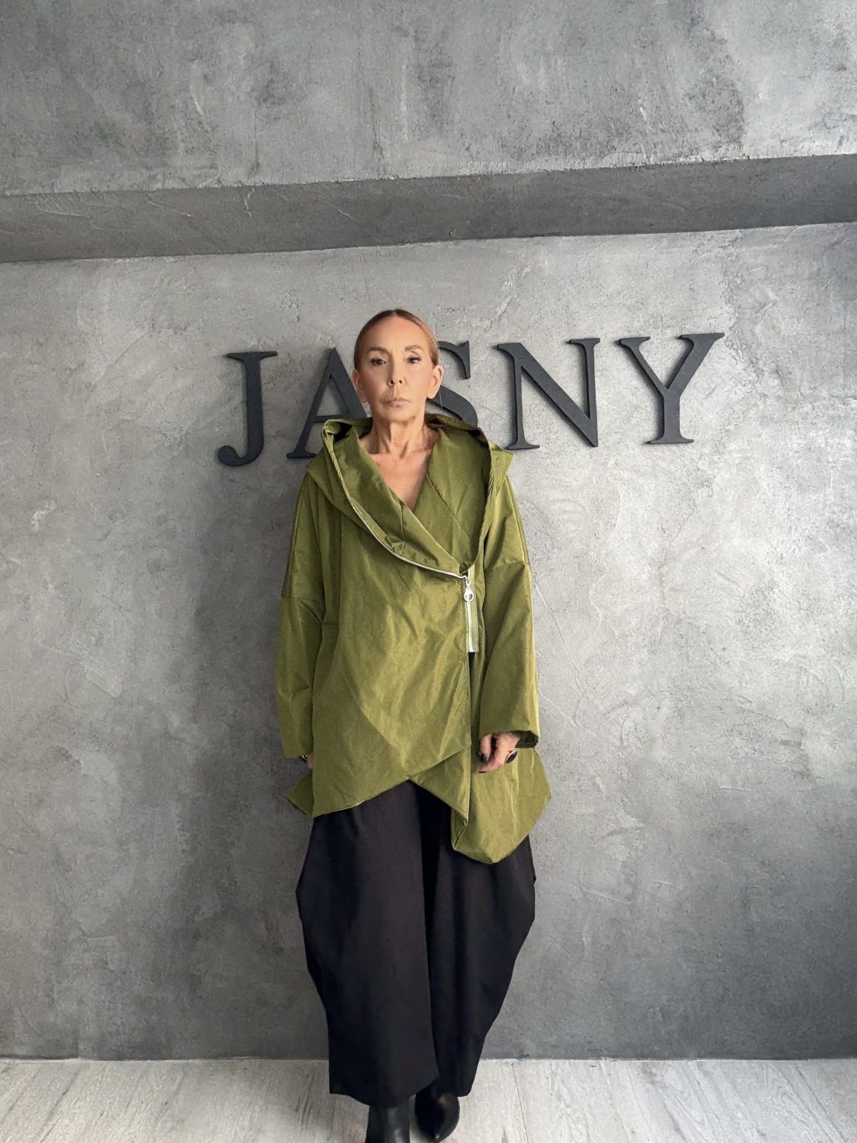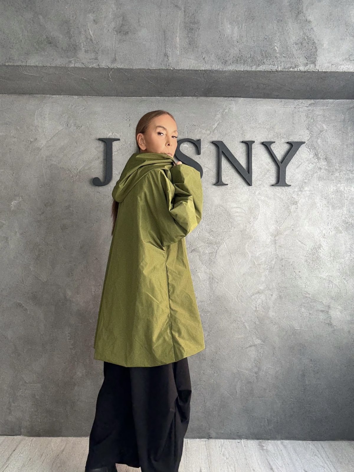 Ένα ιδιαίτερο ασύμμετρο πανωφόρι σε πράσινη απόχρωση ελιάς, με χαλαρή γραμμή που αγκαλιάζει το σώμα. Διαθέτει δραματικό γιακά που μπορεί να φορεθεί ανοιχτός ή κλειστός, προσφέροντας διαφορετικές σιλουέτες. Το ύφασμα έχει φυσική υφή και ελαφριά δομή, δημιουργώντας μια αίσθηση αβίαστης κομψότητας και avant-garde χαρακτήρα.