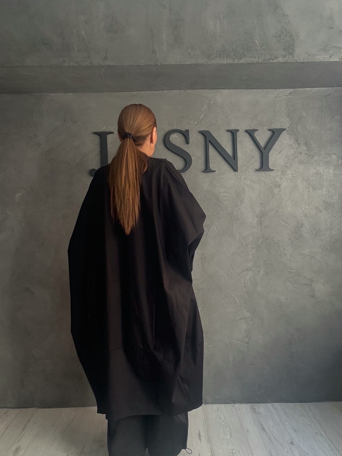 Μακρύ μαύρο πανωφόρι σε κιμονό γραμμή, με χαλαρή εφαρμογή και ρευστότητα στο ύφασμα. Το minimal design του το κάνει διαχρονικό και εύκολο να συνδυαστεί με κάθε look, ενώ η απλότητα του αναδεικνύει τα υπόλοιπα κομμάτια της εμφάνισης. Ένα statement outerwear που προσθέτει μυστήριο και κομψότητα.