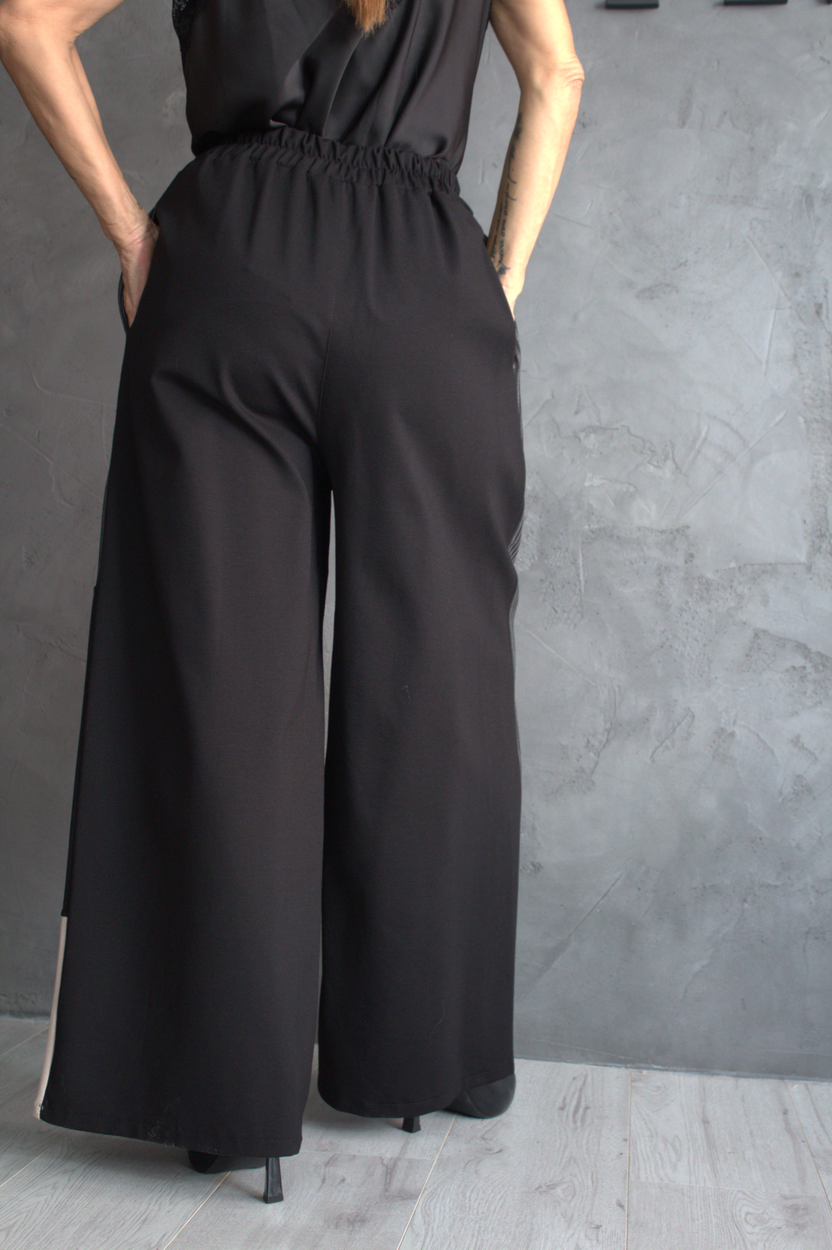 Ένα εντυπωσιακό παντελόνι σε φαρδιά γραμμή, που ξεχωρίζει για το color-block σχέδιό του σε μαύρο και εκρού με ρίγες στα πλαϊνά. Η ελαστική μέση προσφέρει άνεση, ενώ το παιχνιδιάρικο πάντρεμα των αποχρώσεων και υφών δημιουργεί μια statement αισθητική που συνδυάζει urban chic και καλλιτεχνικό χαρακτήρα.