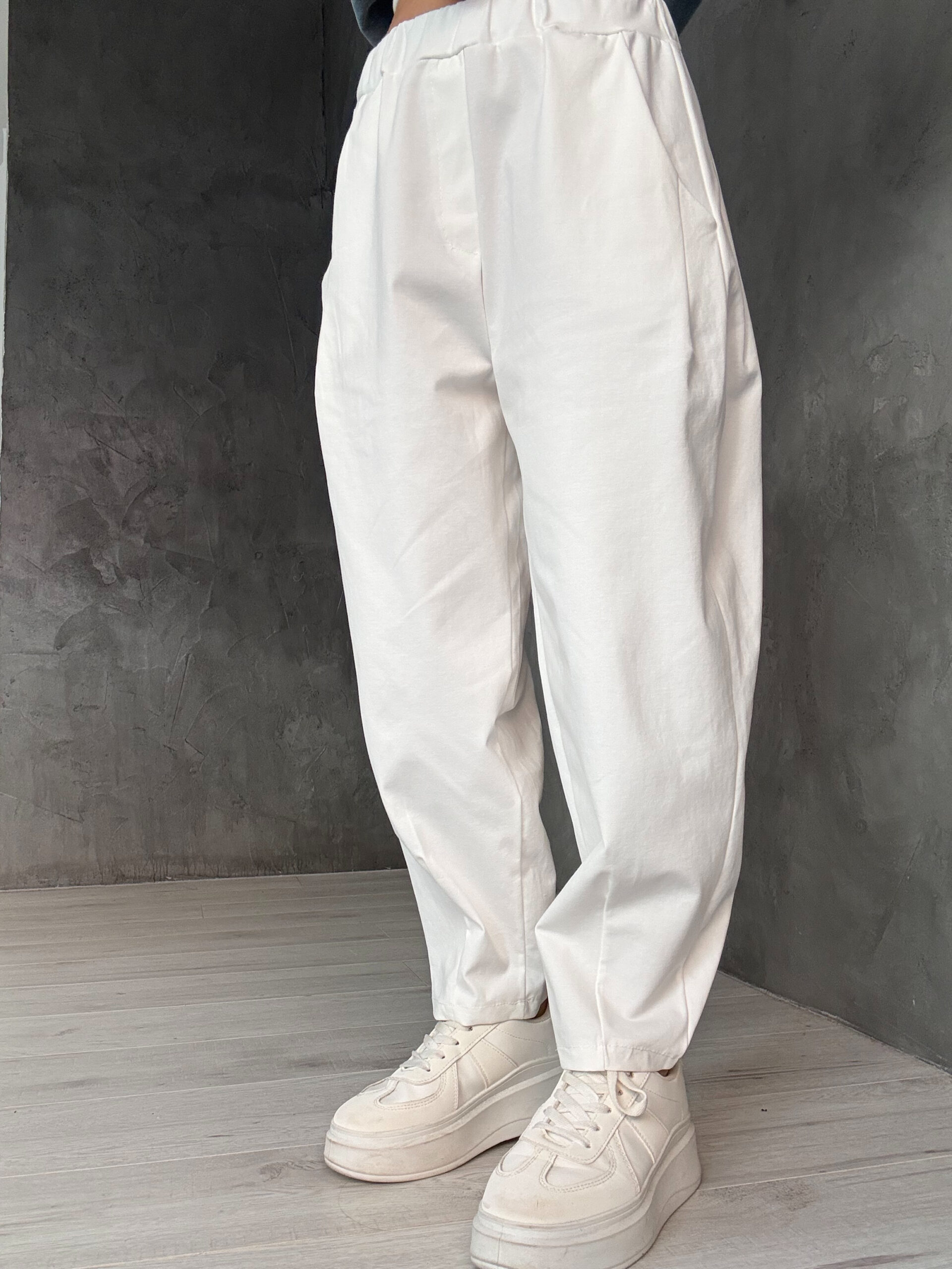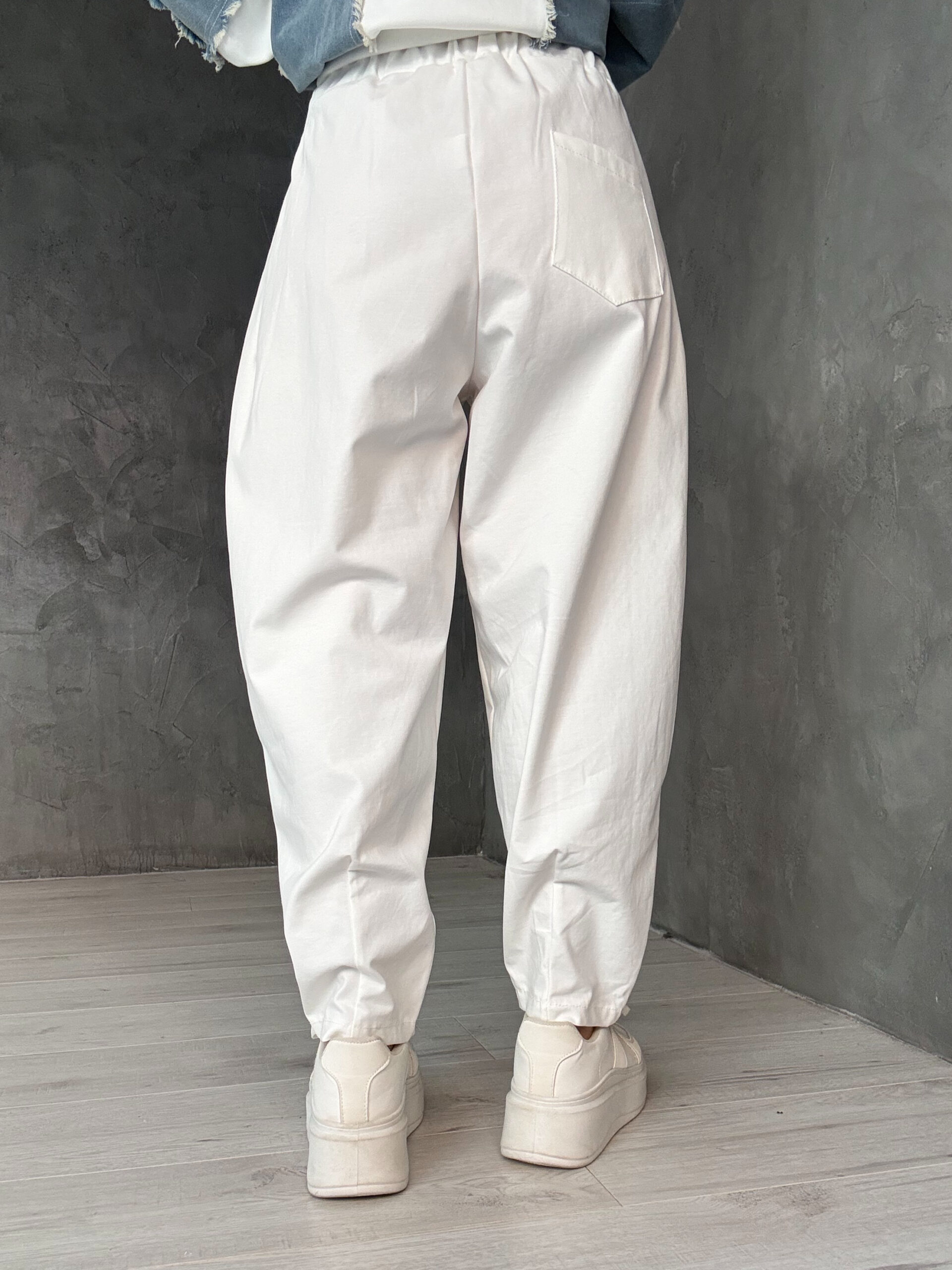 Λευκό παντελόνι με ψηλόμεση ελαστική μέση και φαρδιά, balloon γραμμή. Η καθαρή φόρμα του προσδίδει μοντέρνο ύφος, ενώ το ύφασμα χαρίζει ελαφρότητα και άνεση.