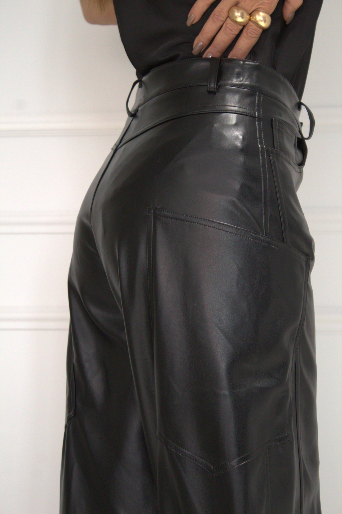 Εντυπωσιακό μαύρο δερματίνη παντελόνι με φαρδιά γραμμή και high-waist εφαρμογή που αγκαλιάζει τη μέση και δημιουργεί sleek σιλουέτα. Το υλικό του έχει σατινέ λάμψη, προσδίδοντας ένα δυναμικό, statement αποτέλεσμα. Οι έντονες ραφές και το balloon cut του χαρίζουν street-style αίσθηση με avant-garde χαρακτήρα.
