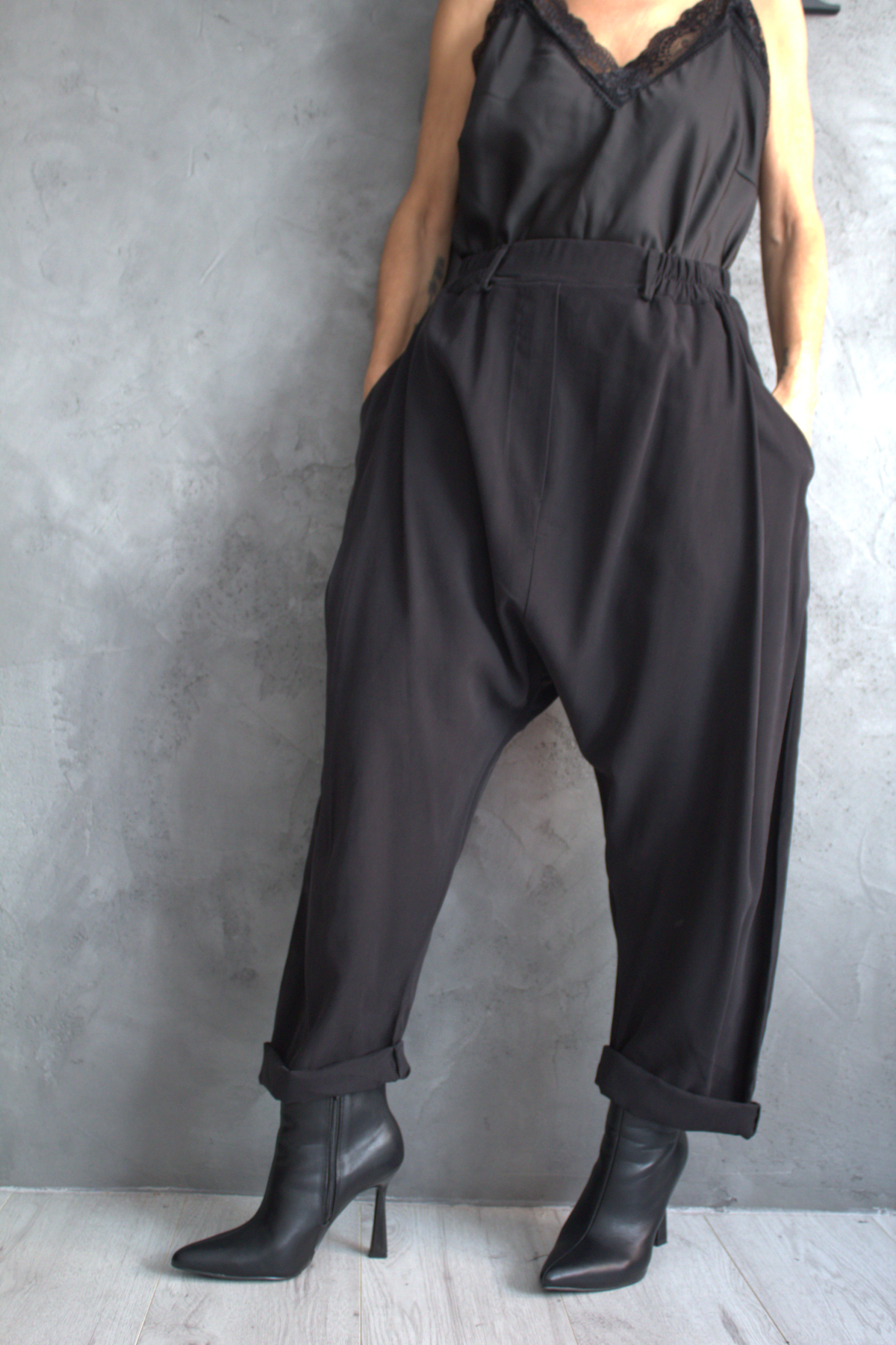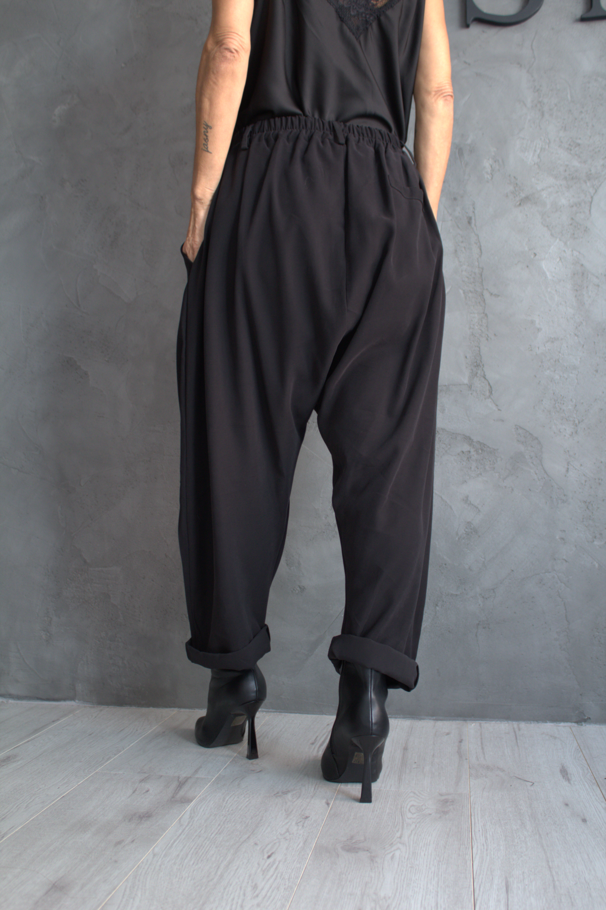 Minimal αλλά με έντονη σχεδιαστική ταυτότητα, είναι ένα παντελόνι με χαλαρή dropped crotch γραμμή, ψηλή μέση και ελαστική πλάτη για άνεση και στυλ.