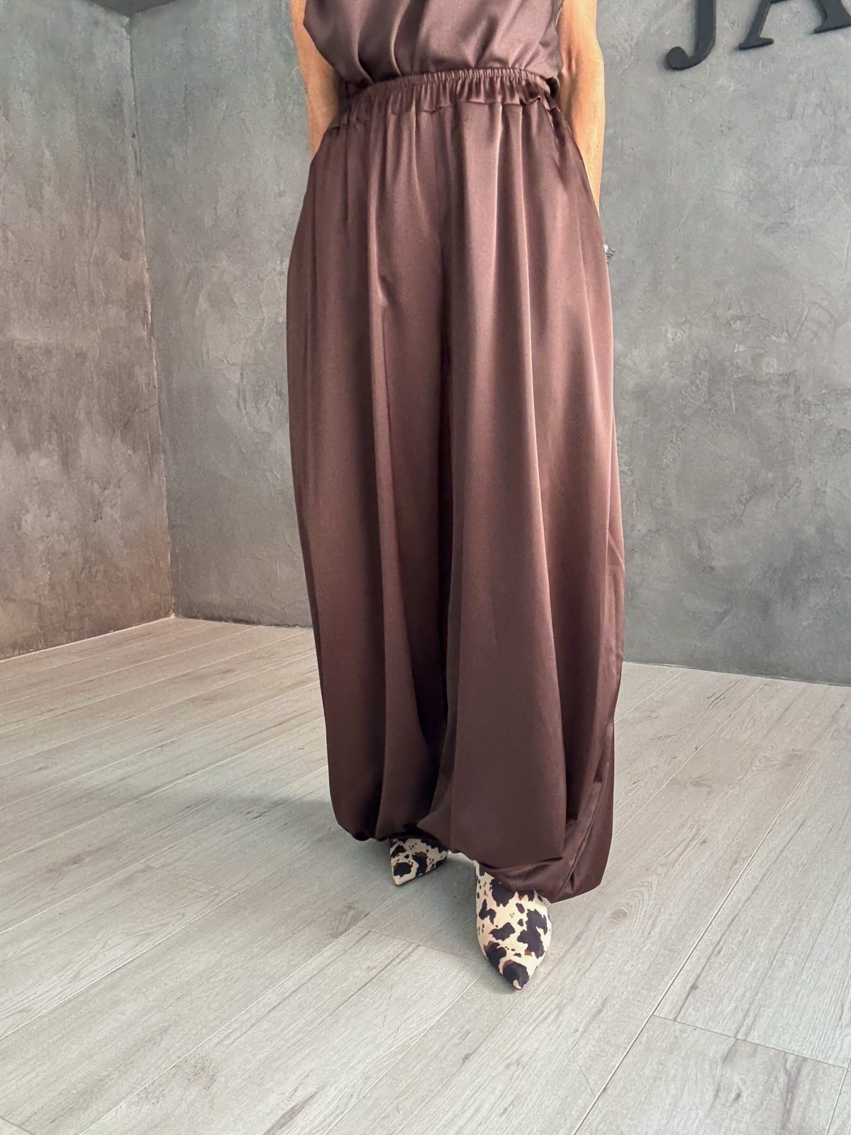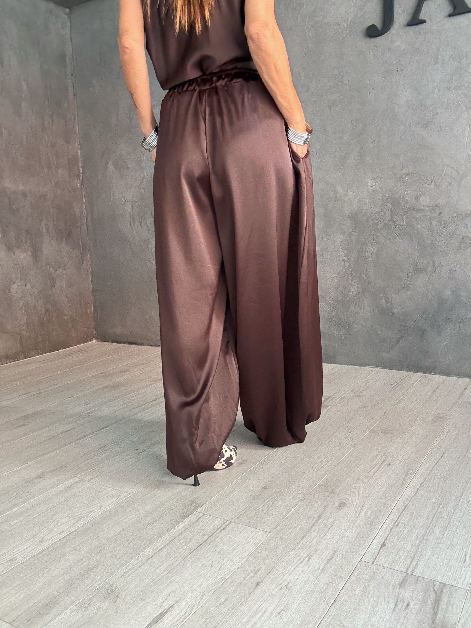 Παντελόνι σε σκούρα σοκολατί απόχρωση, με ψηλή μέση και άνετη, φαρδιά γραμμή τύπου σαλβάρι που χαρίζει κίνηση και άνεση. Το ελαστικό ζωνάρι στη μέση το καθιστά πρακτικό και ευκολοφόρετο, ενώ η minimal αισθητική του το καθιστά ιδανικό για day-to-night εμφανίσεις.