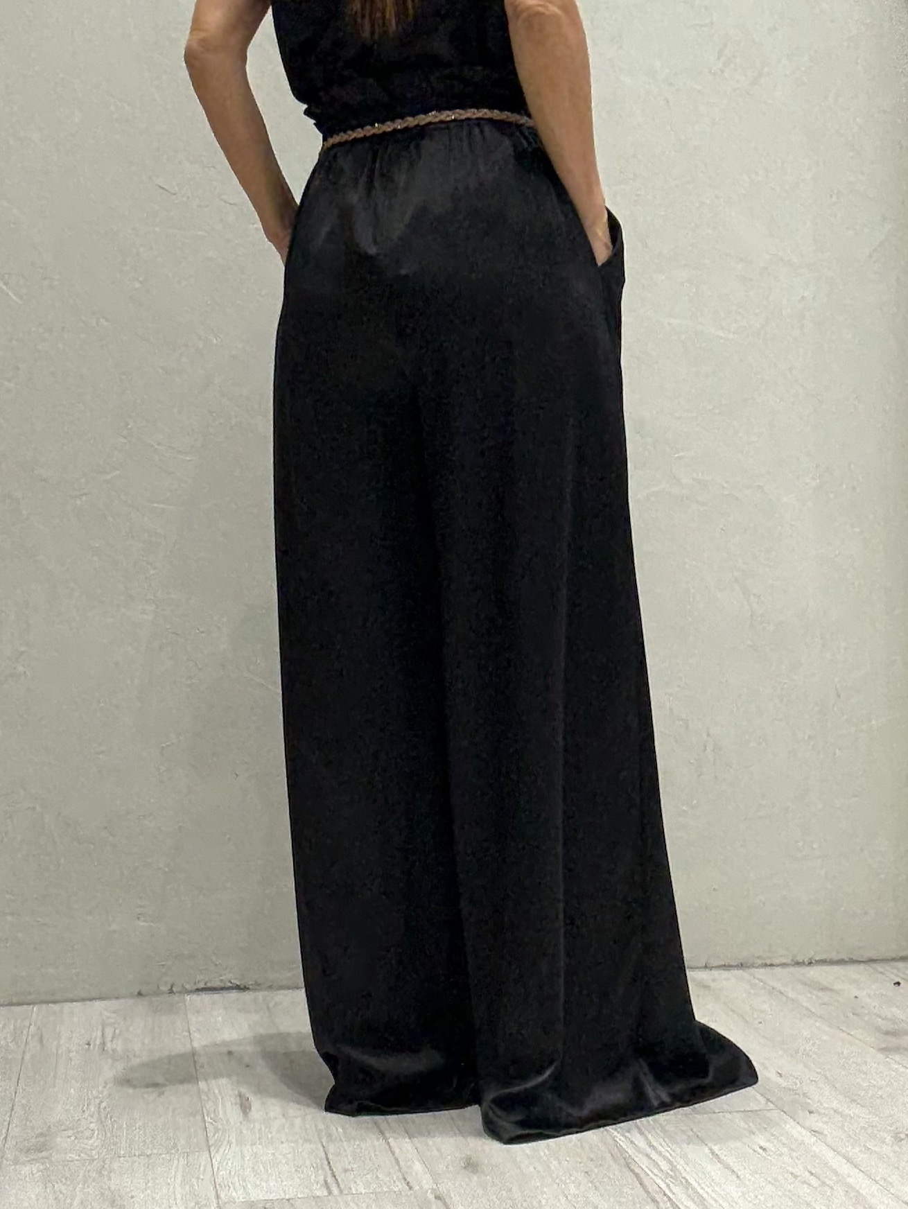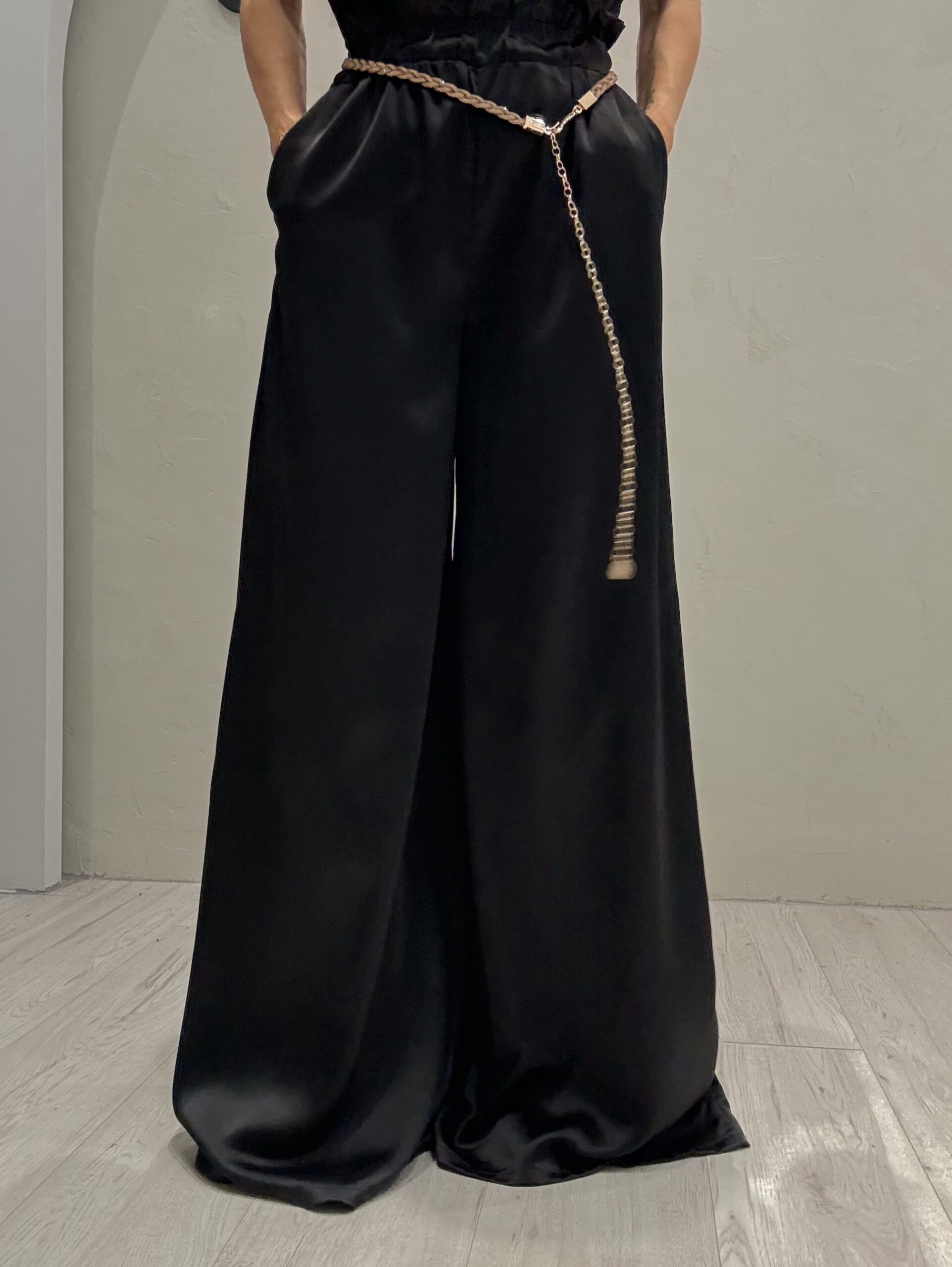 Φαρδύ μαύρο σατέν παντελόνι με ανάλαφρη υφή και κομψή ροή, που χαρίζει αίσθηση πολυτέλειας και άνεσης. Το υλικό του προσδίδει διακριτική λάμψη, ενώ η loose γραμμή προσφέρει elegant σιλουέτα και ευελιξία στην κίνηση.