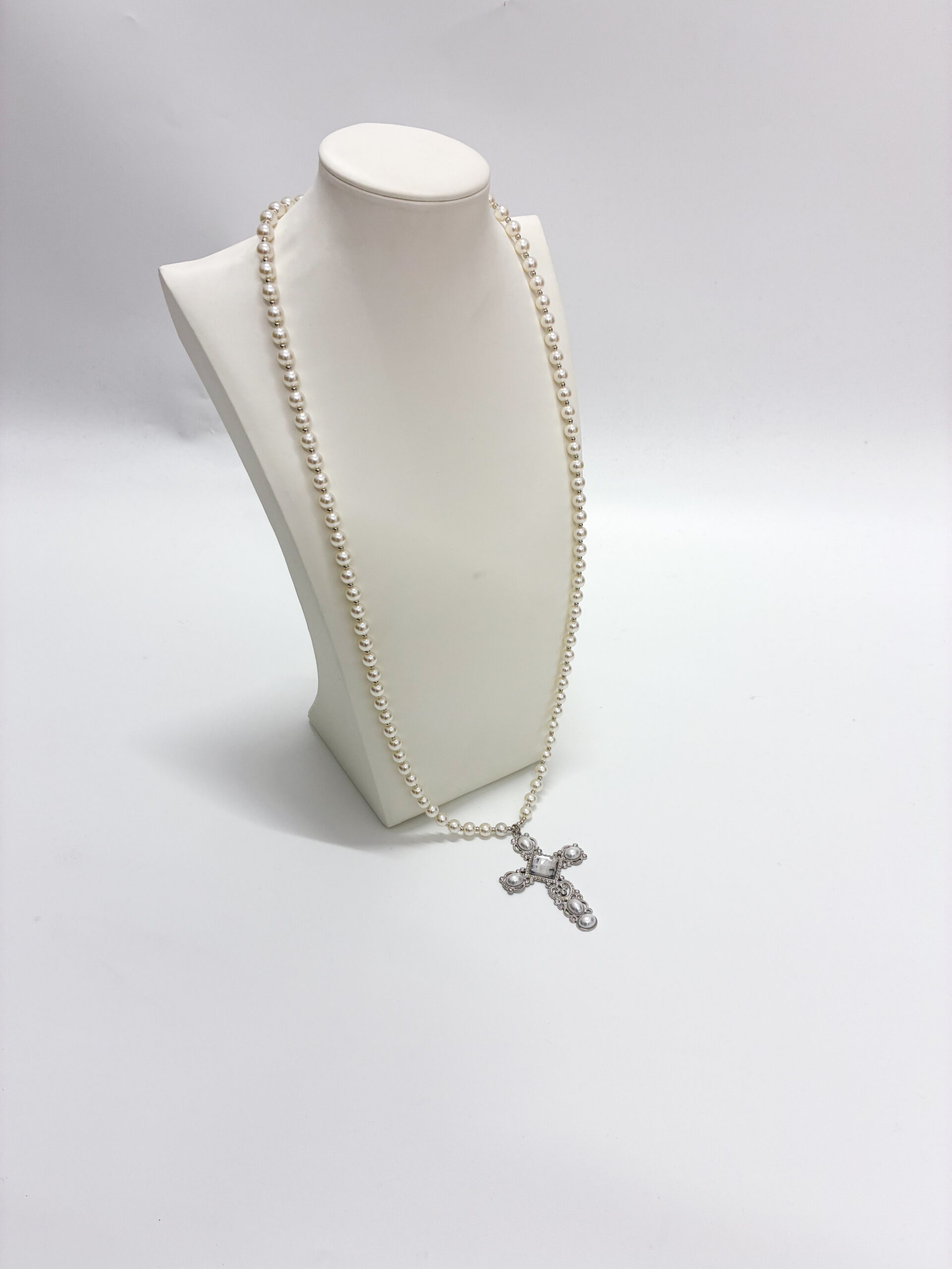 Κομψό κολιέ με διαχρονικές λευκές πέρλες και διακριτικό σταυρό διακοσμημένο με λαμπερές λεπτομέρειες.