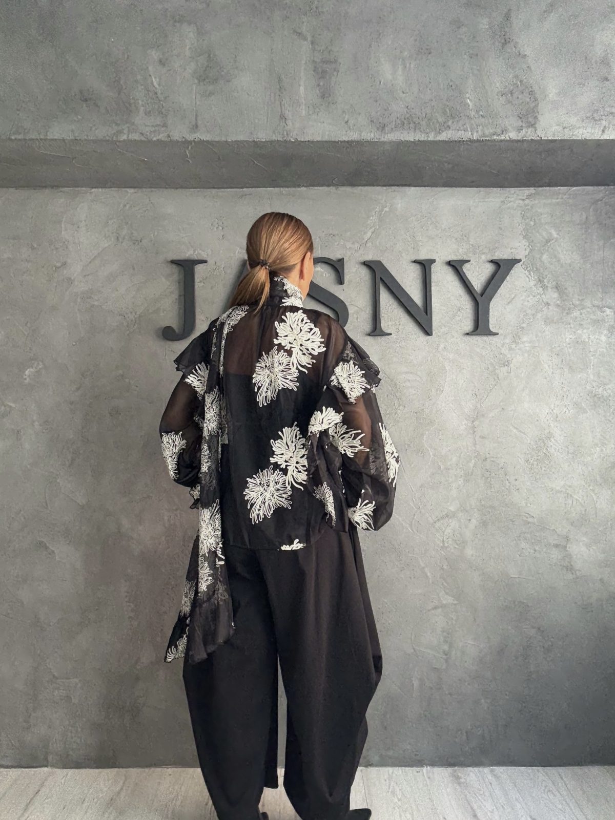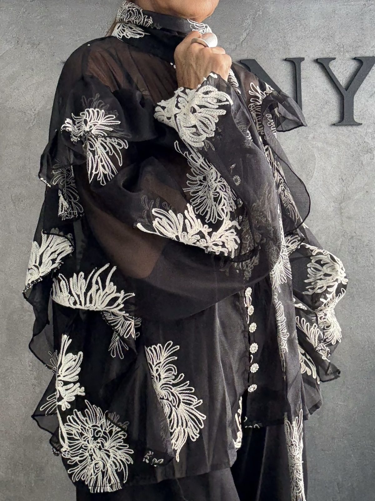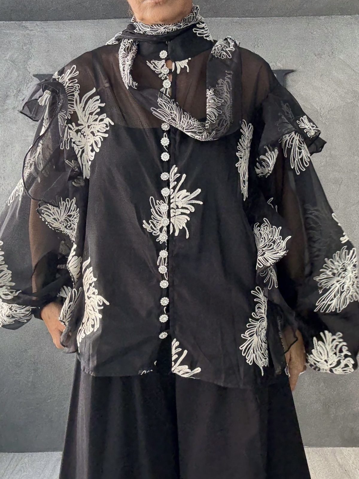 Μαύρο πουκάμισο με διάφανο τούλι ,  με τοπάκι από μέσα διακοσμημένο με εντυπωσιακά λευκά κεντημένα μοτίβα λουλουδιών. Τα statement κουμπιά και οι ανάλαφροι όγκοι στα μανίκια προσθέτουν δραματικότητα και θηλυκή κομψότητα. Ένα κομμάτι που συνδυάζει ρομαντισμό με αίσθηση πολυτέλειας.