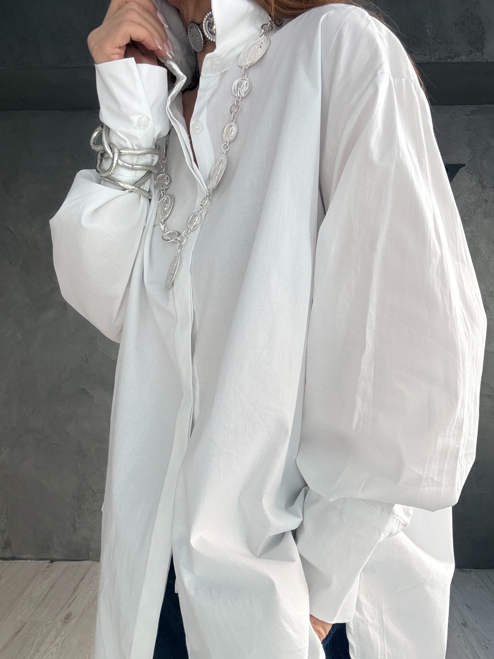 Αυτό το πουκάμισο είναι ένα λευκό oversized κομμάτι με αυστηρή, μίνιμαλ γραμμή και ανδρόγυνο ύφος. Διαθέτει μακριά μανίκια με φαρδιές μανσέτες, κλασικό γιακά και μια μεταλλική λεπτομέρεια-αλυσίδα που λειτουργεί σαν statement αξεσουάρ. Το ύφασμα φαίνεται βαμβακερό, με ελαφρώς δομημένη υφή που δίνει όγκο στο ένδυμα.