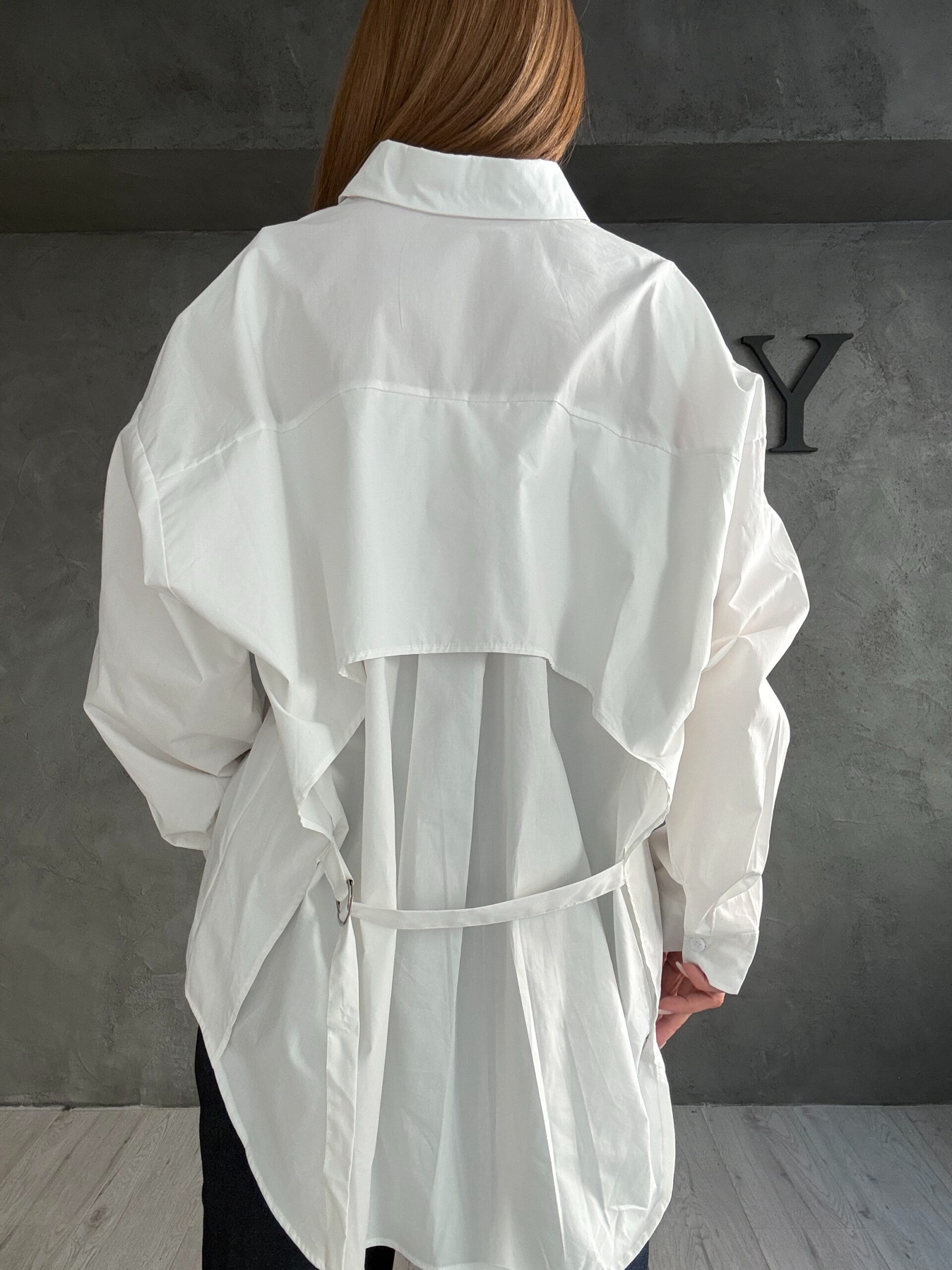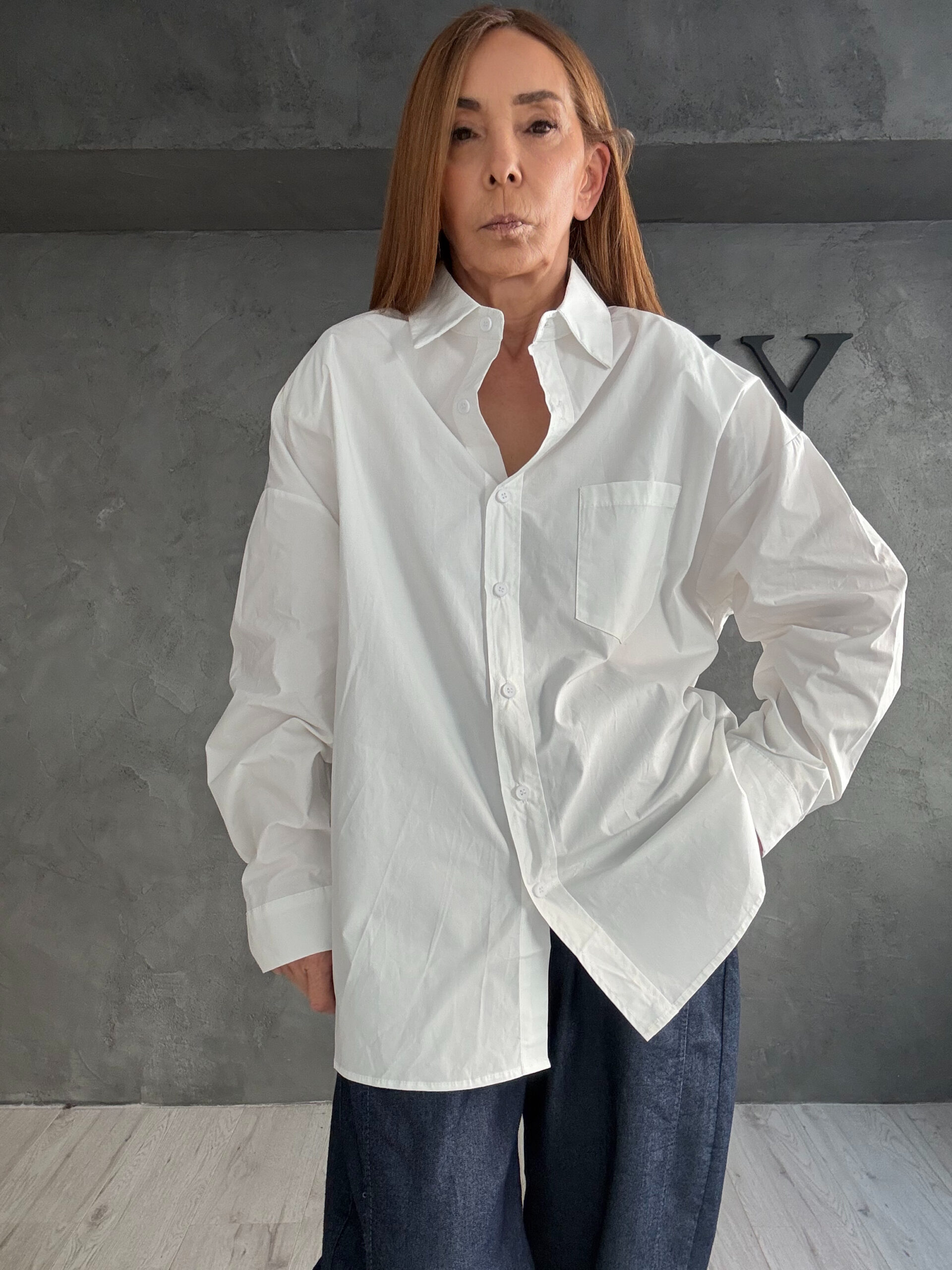 Λευκό πουκάμισο με oversized γραμμή και minimal σχεδιασμό, σχεδιασμένο να λειτουργεί ως διαχρονική βάση της γκαρνταρόμπας.