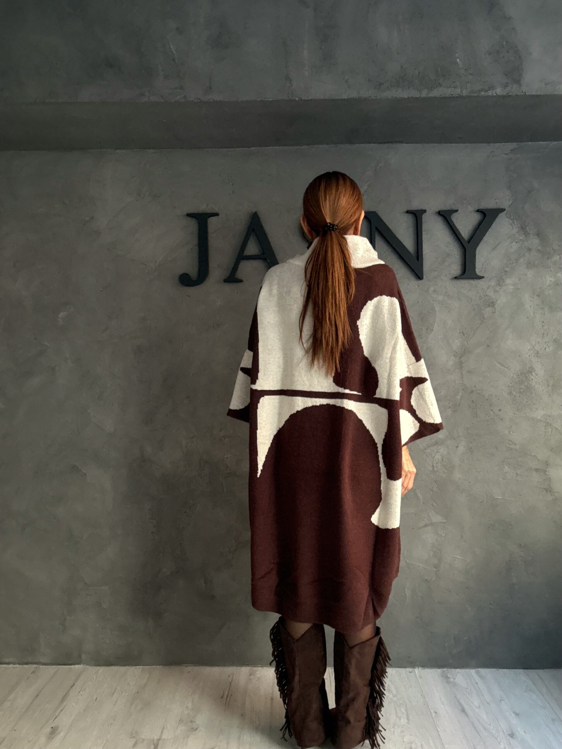 Πλεκτό μπλουζοφόρεμα σε εκρού τόνο που φωτίζει τη σιλουέτα και αναδεικνύει την oversized γραμμή με διακριτικό τρόπο. Το αφηρημένο σχέδιο λειτουργεί σαν ήσυχη αντίθεση πάνω στη φωτεινή βάση, δημιουργώντας ένα σύγχρονο αλλά καθαρό αποτέλεσμα.