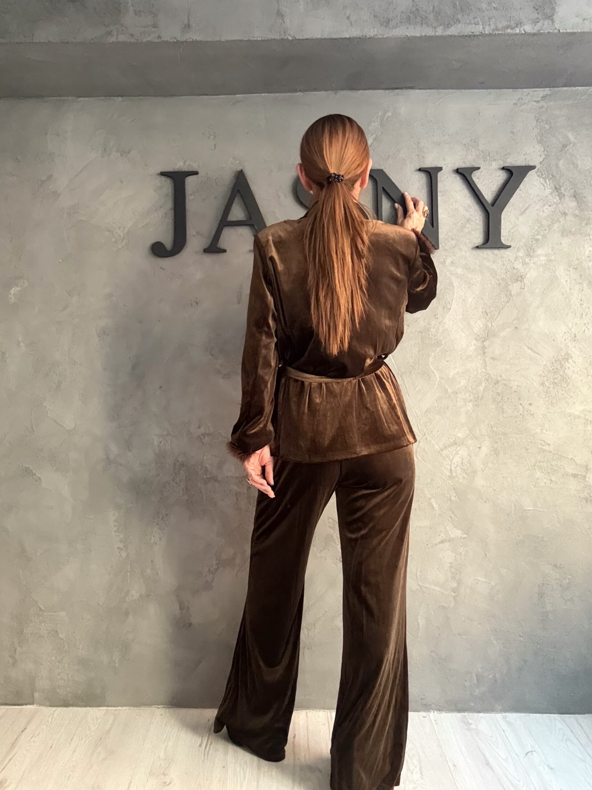 Ένα λουκ που βασίζεται στη δύναμη της απλότητας και στην ποιότητα του υλικού. Το velvet σύνολο σε ζεστή καφέ απόχρωση αγκαλιάζει το σώμα με χαλαρή, αλλά ξεκάθαρα δομημένη γραμμή. Η σταυρωτή μπλούζα δημιουργεί καθαρό σχήμα στο επάνω μέρος, ενώ το φαρδύ παντελόνι προσθέτει ύψος και αίσθηση άνεσης χωρίς υπερβολές. Ένα σύνολο ήσυχο, αλλά με έντονη παρουσία — ακριβώς όπως το JASNY DNA.