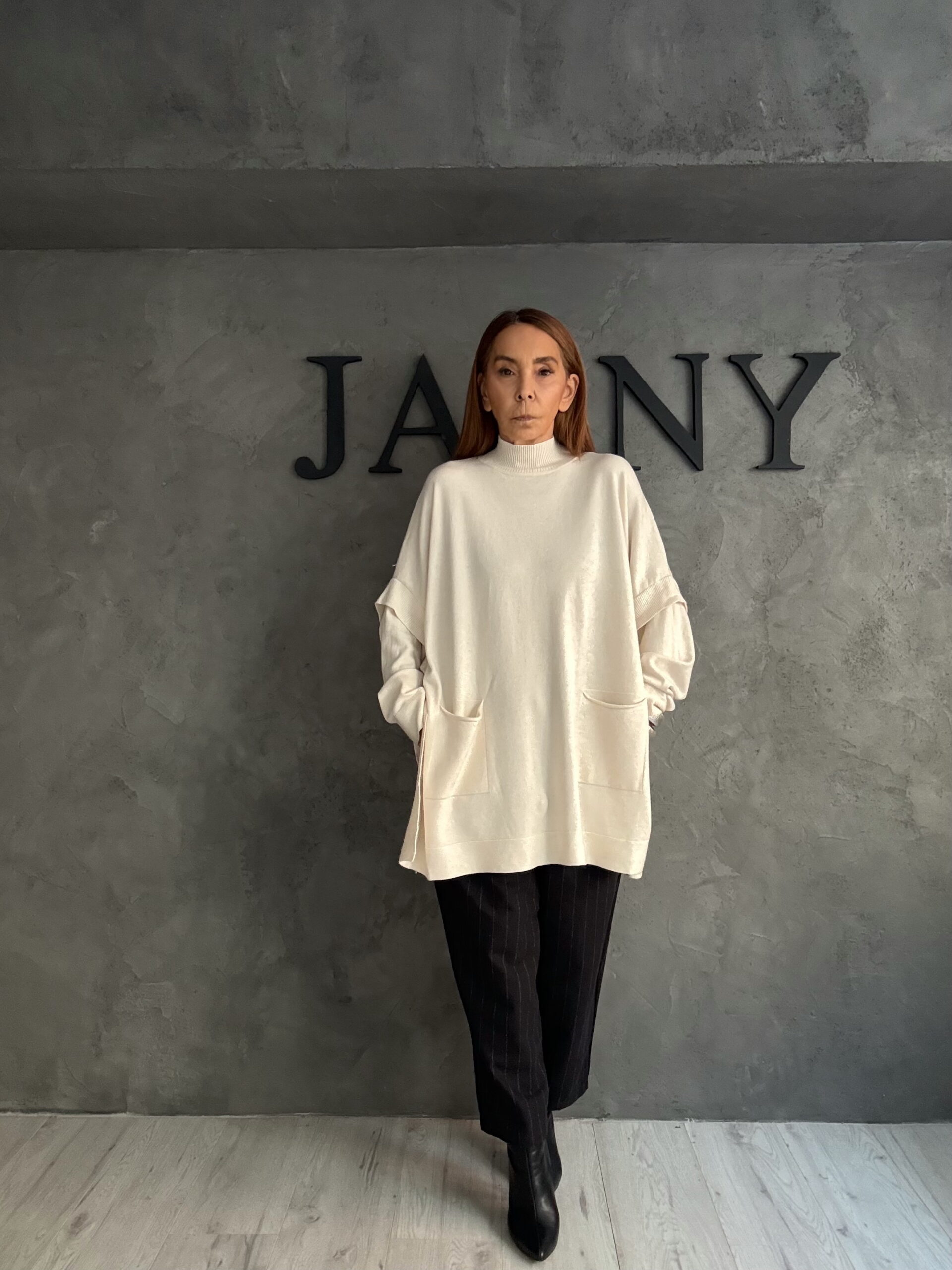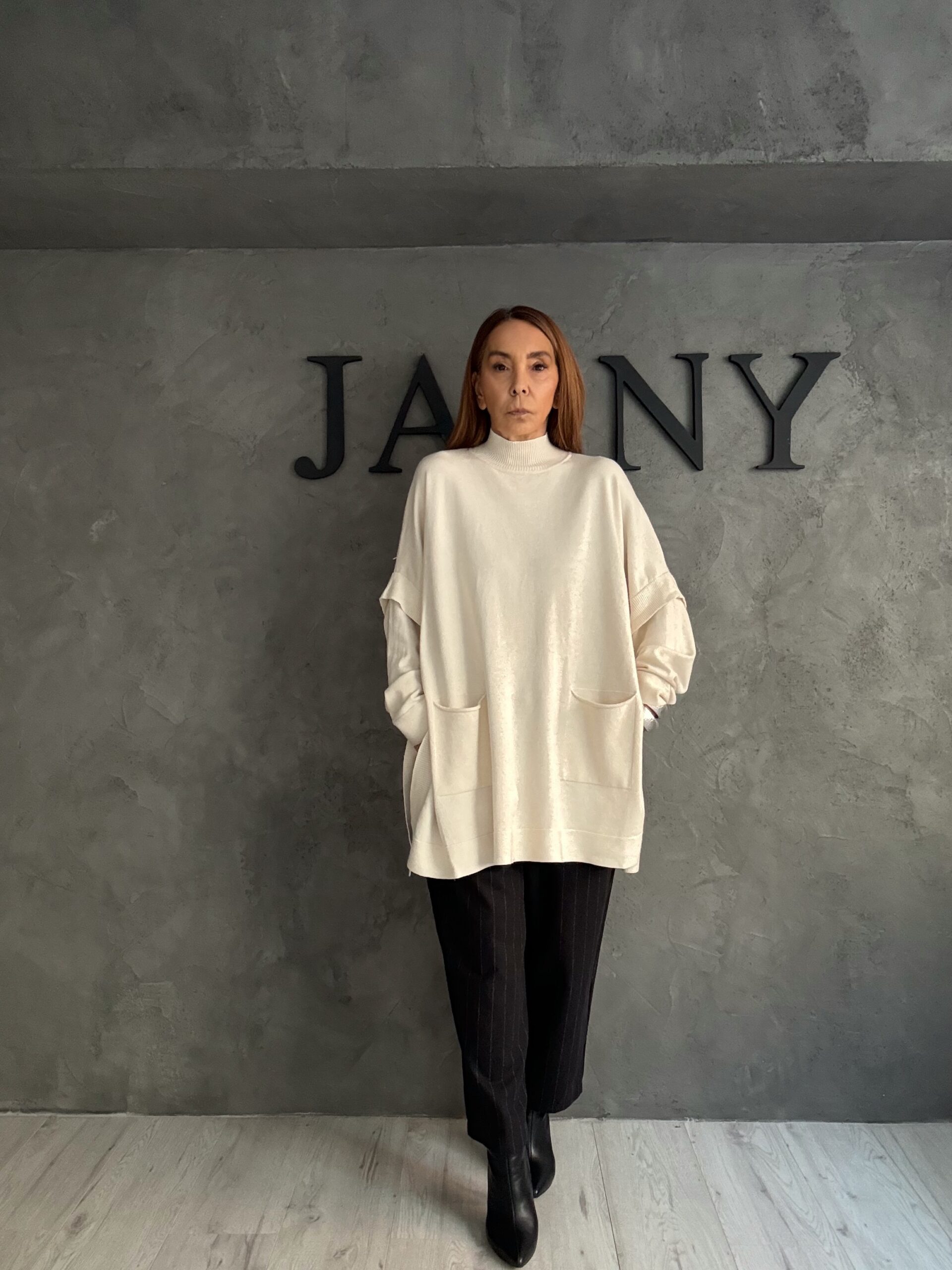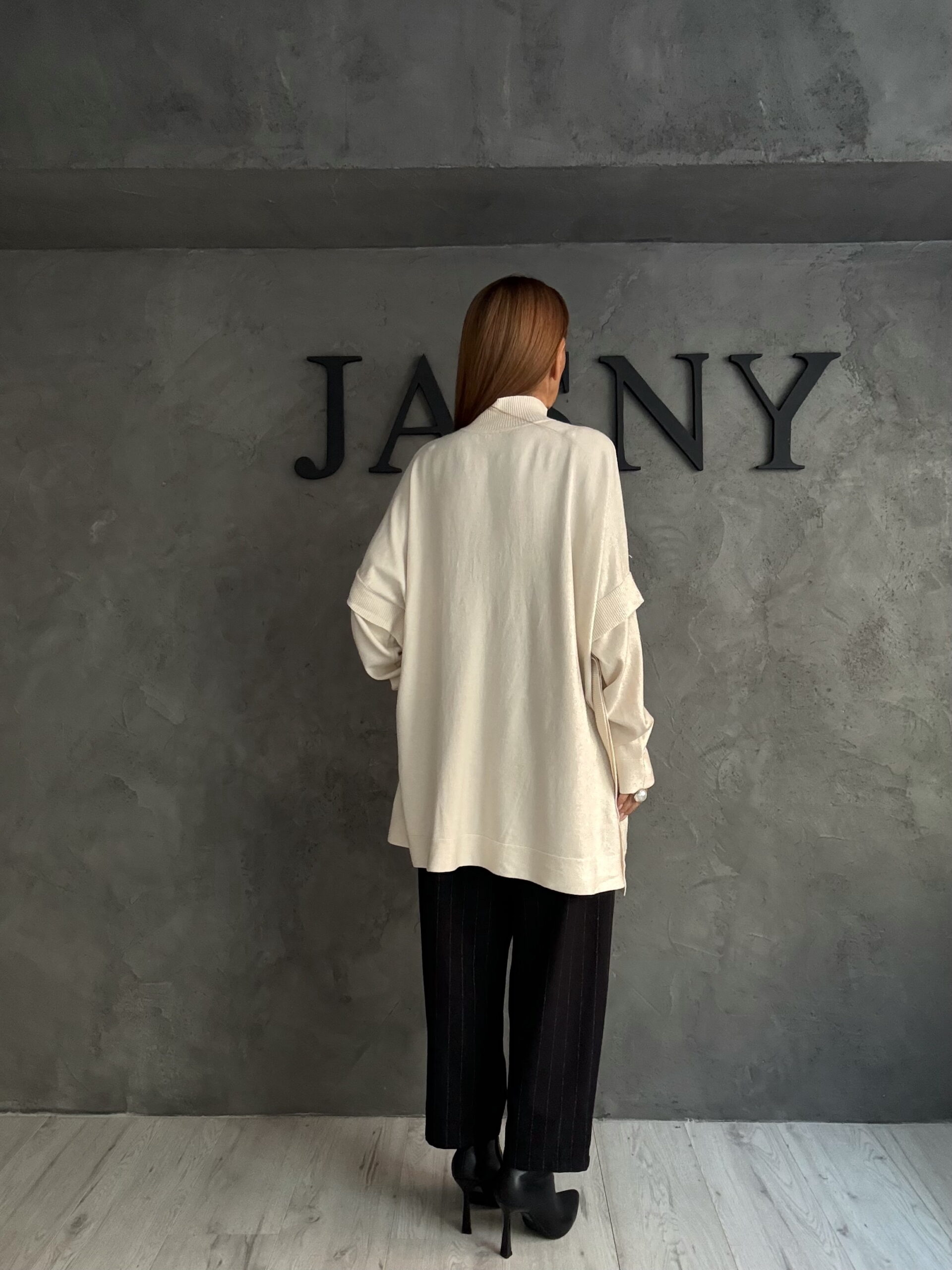 Ένα refined καθημερινό look που βασίζεται στη δύναμη της απλότητας και στις καθαρές, δομημένες γραμμές. Το oversized πλεκτό, με χαλαρή πτώση και minimal αισθητική, αγκαλιάζει το σώμα χωρίς να το περιορίζει, δημιουργώντας ένα αίσθημα άνεσης και διακριτικής πολυτέλειας.