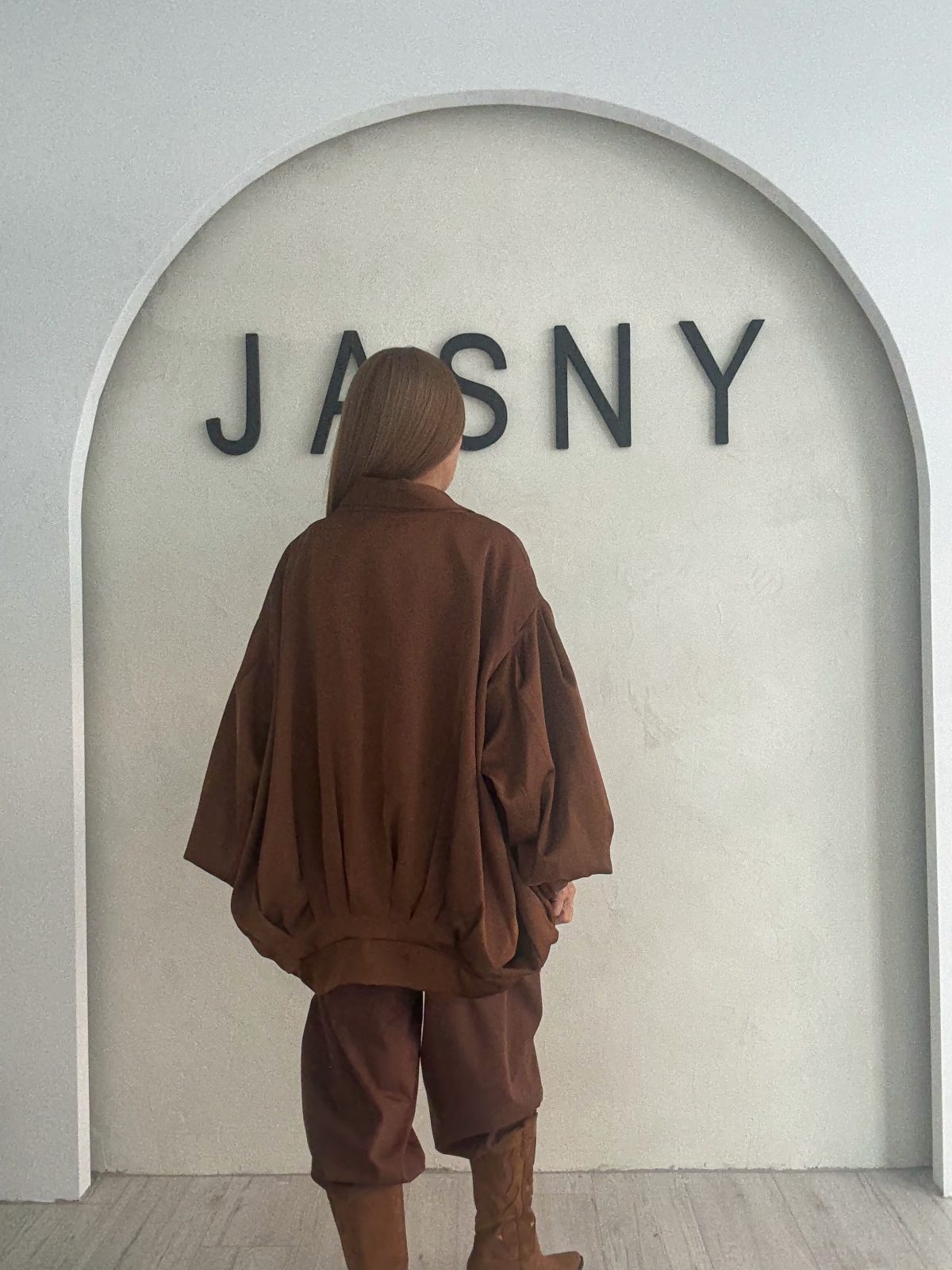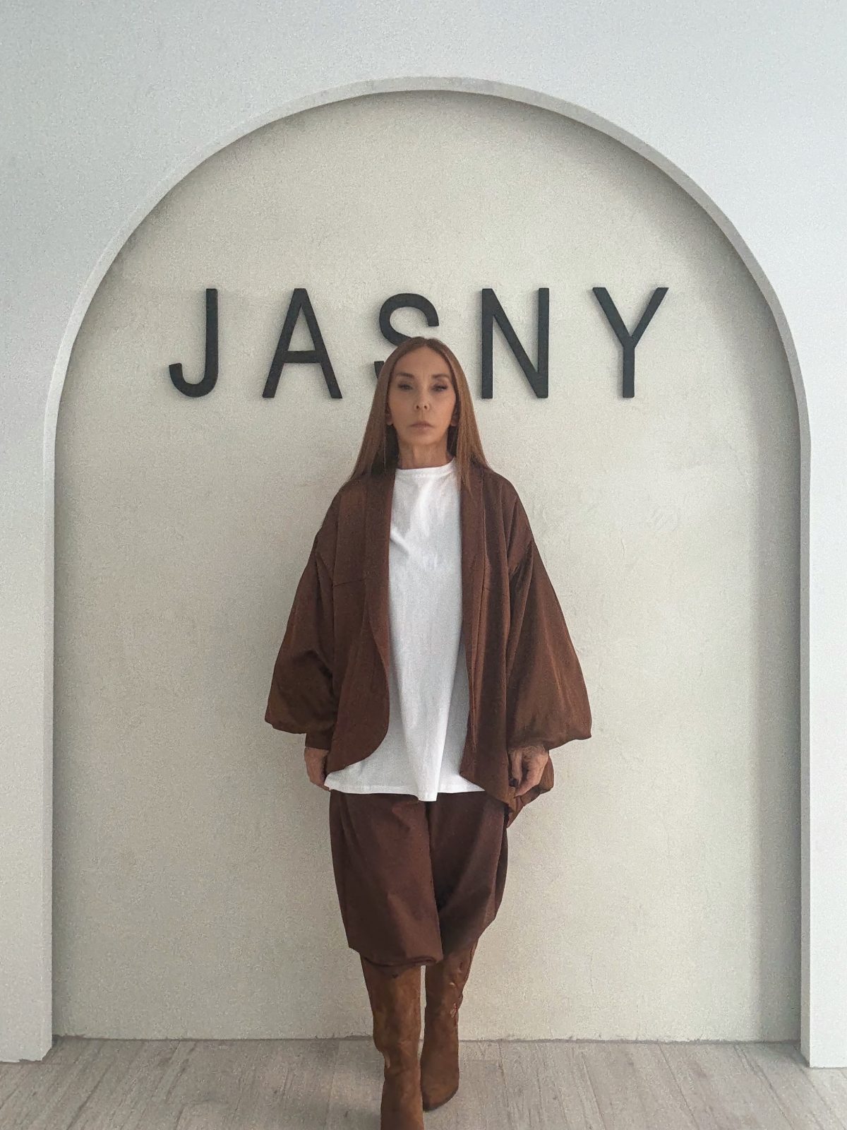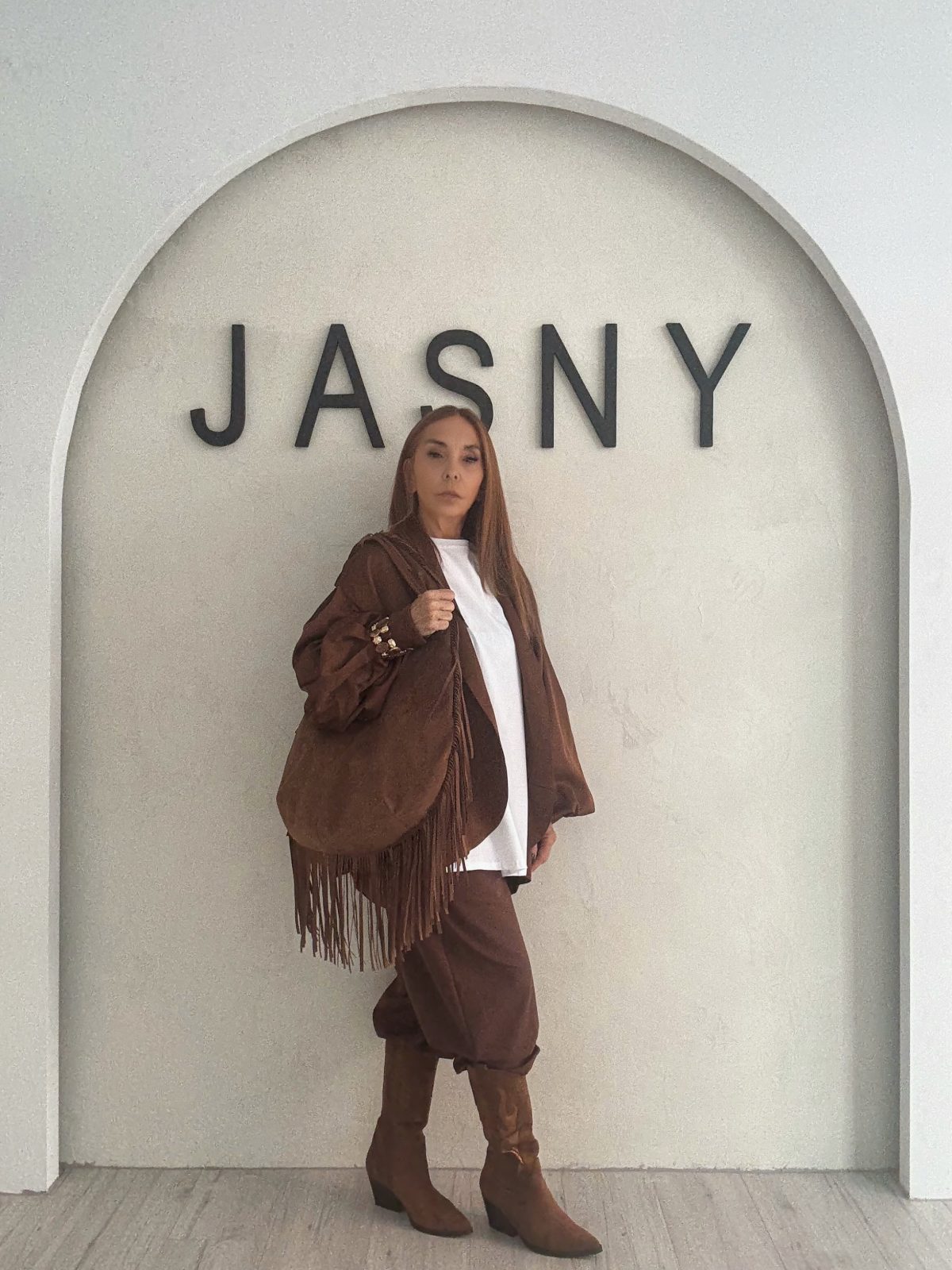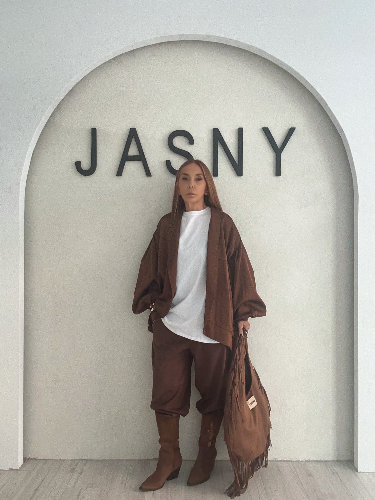 Ένα άνετο και σύγχρονο look σε γήινες αποχρώσεις που παντρεύει το oversized λευκό t-shirt με καφέ loose πανωφόρι και παντελόνι σε ίδιο τόνο. Οι suede μπότες ολοκληρώνουν το σύνολο με boho-chic διάθεση, προσθέτοντας ύψος και δυναμισμό. Το look ισορροπεί ανάμεσα σε minimal και casual, ιδανικό για all-day εμφανίσεις με στυλ.