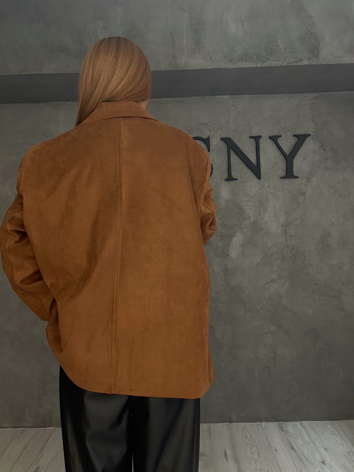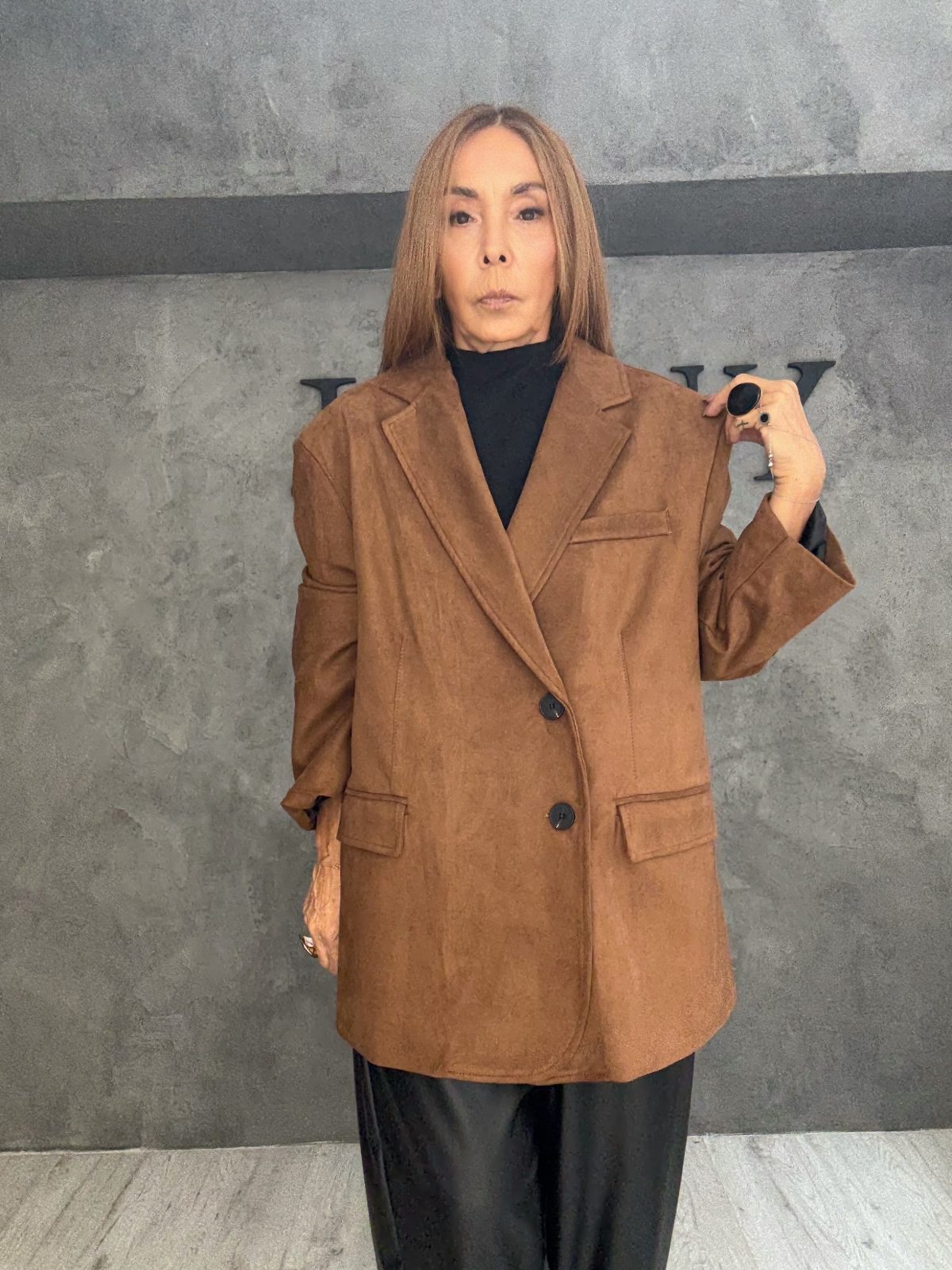 Ένα oversized σακάκι σε γήινη camel απόχρωση που φέρνει τη ζεστασιά του suede look σε μοντέρνα εκδοχή. Με φαρδύ κόψιμο και έντονους ώμους, δίνει δομημένη αλλά και χαλαρή σιλουέτα, ιδανική για layering πάνω από basic tops ή πουκάμισα. Το χρώμα του προσφέρει ευελιξία και εύκολη συνδυαστικότητα, ενώ τα μεγάλα κουμπιά και οι τσέπες προσθέτουν πρακτικότητα και χαρακτήρα.