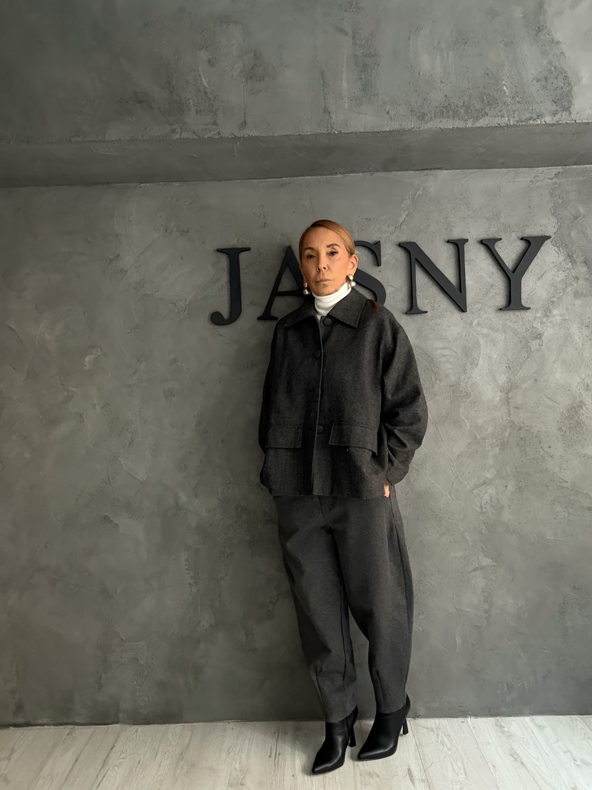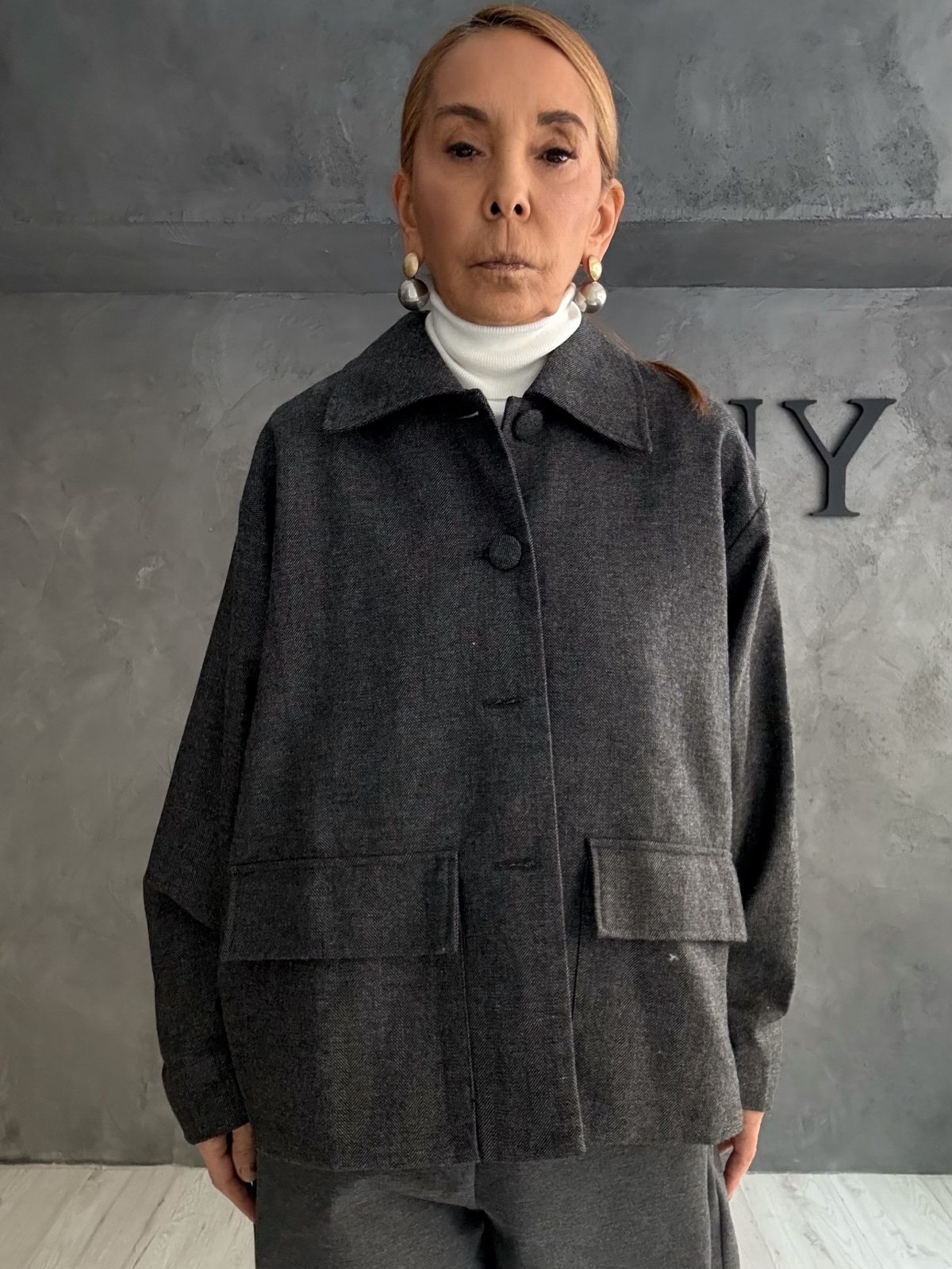 Το Minimal Wool Jacket είναι ένα premium μάλλινο overshirt σακάκι σε βαθύ ανθρακί γκρι, με καθαρές γραμμές και αρχιτεκτονική αισθητική. Διαθέτει boxy γραμμή, κρυφό κούμπωμα και μεγάλες utility τσέπες στο μπροστινό μέρος, που δίνουν μια διακριτικά αυστηρή αλλά σύγχρονη εικόνα. Ο γιακάς τύπου shirt collar προσθέτει minimal κομψότητα, ενώ το ζεστό ύφασμα προσφέρει άνεση και αντοχή για τα καθημερινά city looks.
