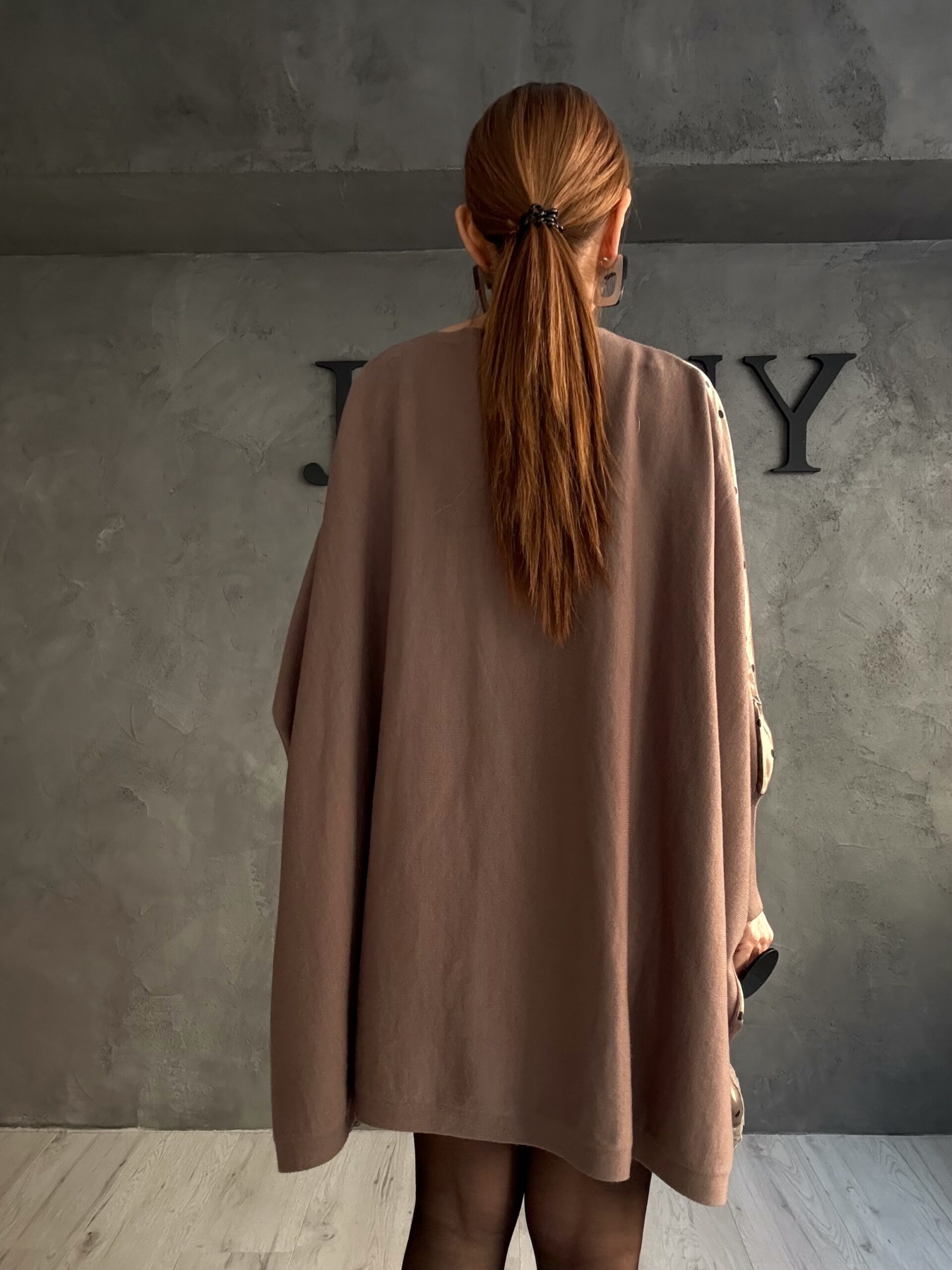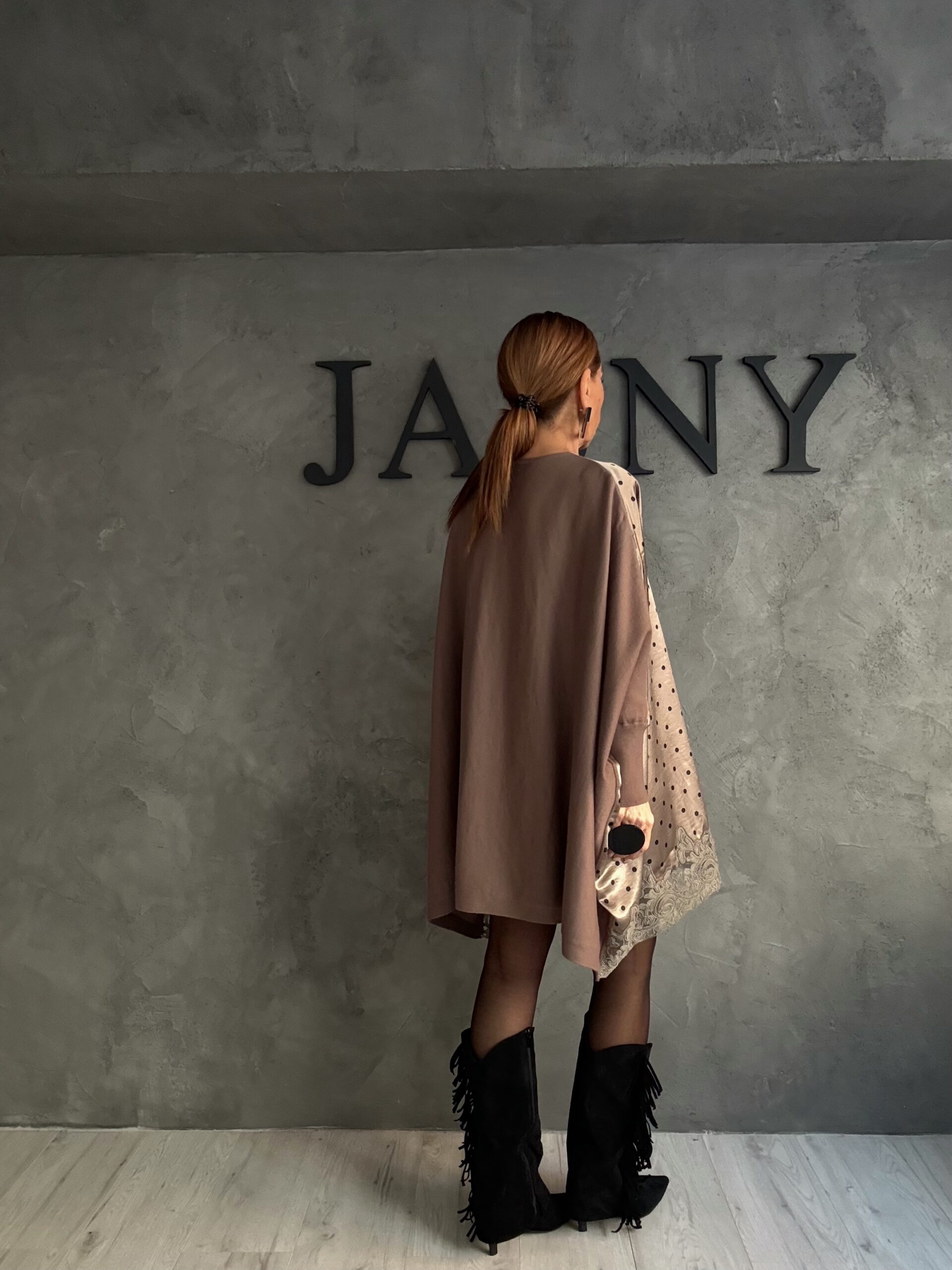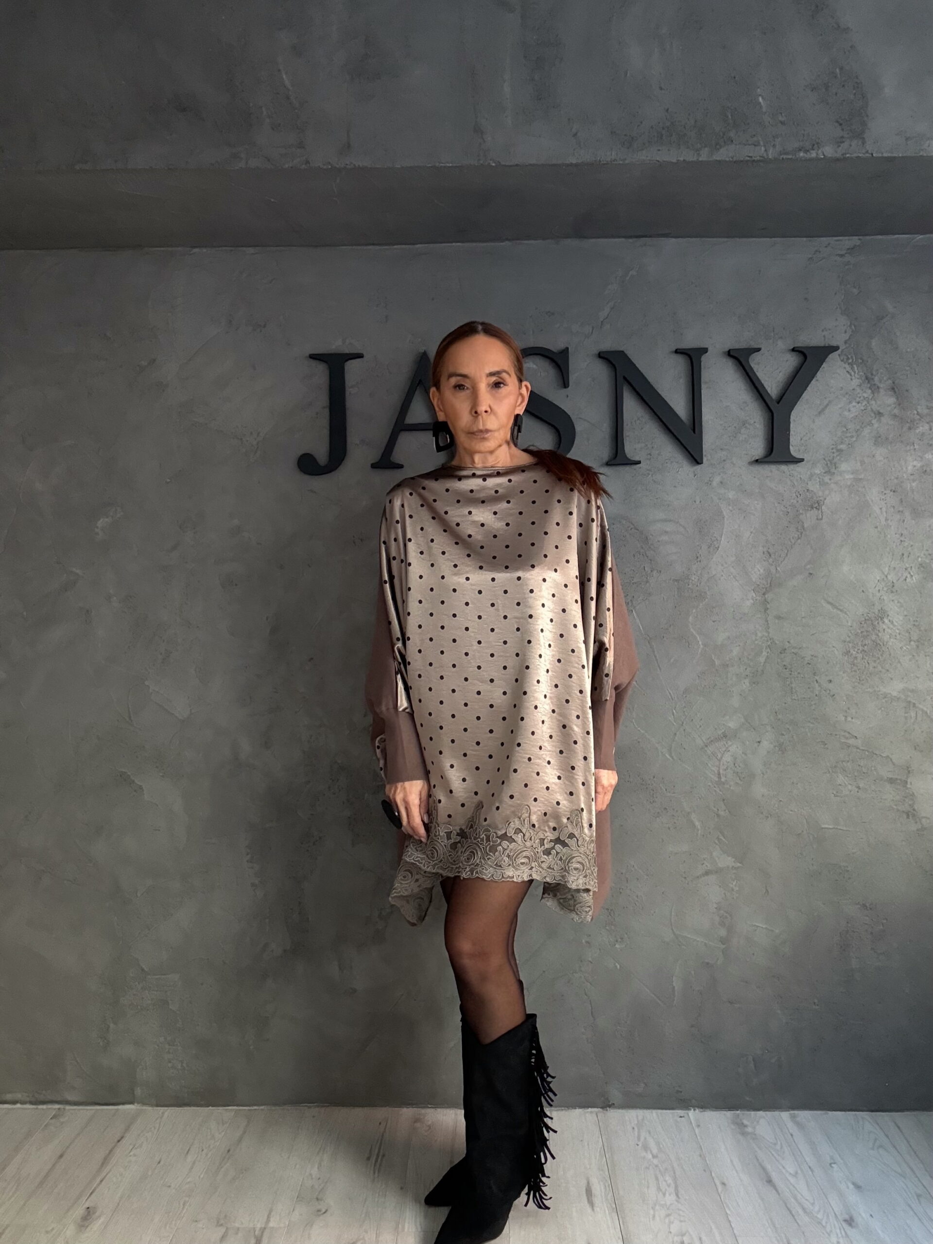 Ένα statement look που ισορροπεί ιδανικά ανάμεσα στη λάμψη και την ηρεμία. Το σατινέ ύφασμα με διακριτικό πουά μοτίβο δημιουργεί μια φωτεινή, εκλεπτυσμένη επιφάνεια που κινείται απαλά με το σώμα. Η oversized, αέρινη γραμμή χαρίζει άνεση και ελευθερία, ενώ το τελείωμα με δαντέλα προσθέτει βάθος και θηλυκή λεπτομέρεια χωρίς να βαραίνει το σύνολο.