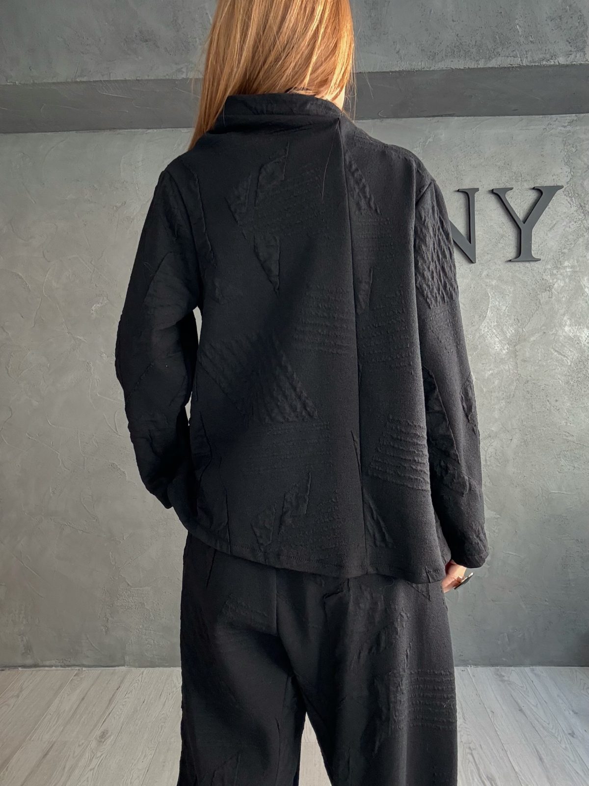 Minimal μαύρο σετ με μοναδική ανάγλυφη υφή που προσθέτει βάθος και αρχιτεκτονική αίσθηση στο σύνολο. Αποτελείται από loose cropped ζακέτα με κουμπιά και ασύμμετρη γραμμή, και παντελόνι σε χαλαρή tapered εφαρμογή. Το ύφασμα έχει διακριτική γυαλάδα και “crinkle” επιφάνεια που προσδίδει avant-garde χαρακτήρα. Ένα outfit που αποπνέει ισορροπία, δύναμη και καθαρότητα σχεδίου.