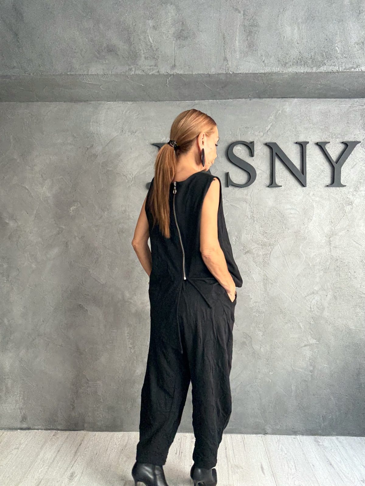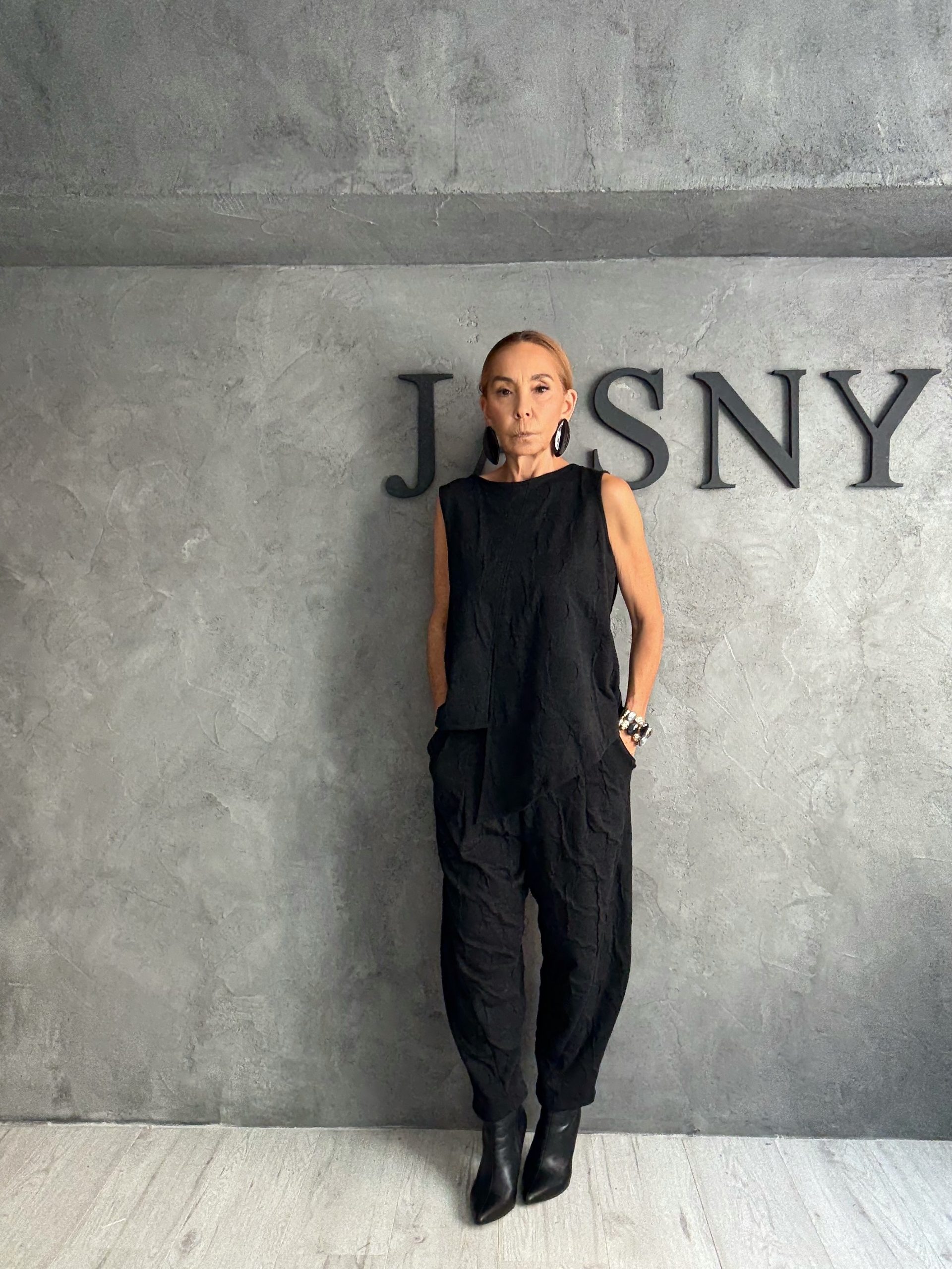 Minimal αλλά ταυτόχρονα έντονο, το total black σετ ξεχωρίζει χάρη στο ιδιαίτερο τσαλακωμένο ύφασμα που δίνει μια avant-garde αισθητική. Το sleeveless top συνδυάζεται με χαλαρό παντελόνι που στενεύει προς τα κάτω, ενώ τα μαύρα ankle boots ολοκληρώνουν το look με δυναμισμό. Η υφή του υφάσματος δίνει στο μαύρο βάθος και κίνηση, αποφεύγοντας τη μονοτονία.