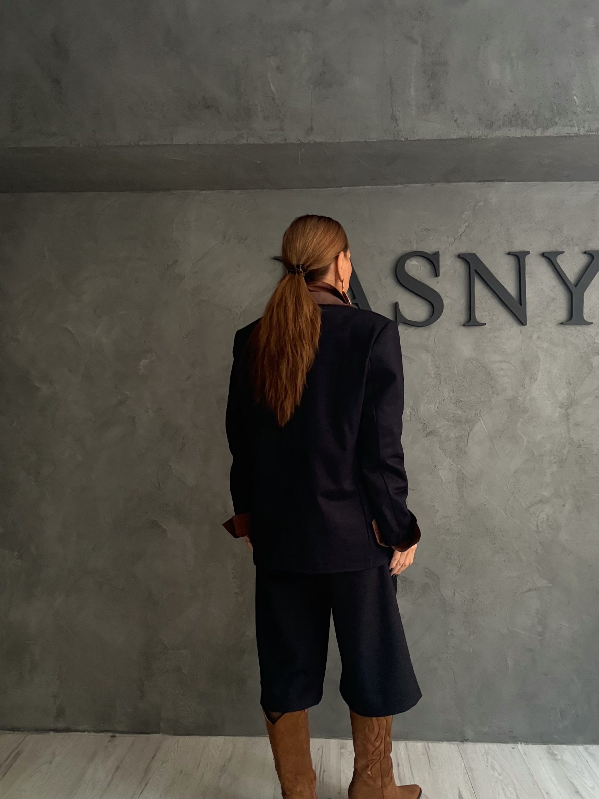 Αποτελείται από μπλέ σκούρο σακάκι με καθαρές, αυστηρές γραμμές και καφέ λεπτομέρειες και βερμούδα σε μήκος γόνατος, που δημιουργούν ισορροπία ανάμεσα στην αυστηρότητα και την ελευθερία της κίνησης.