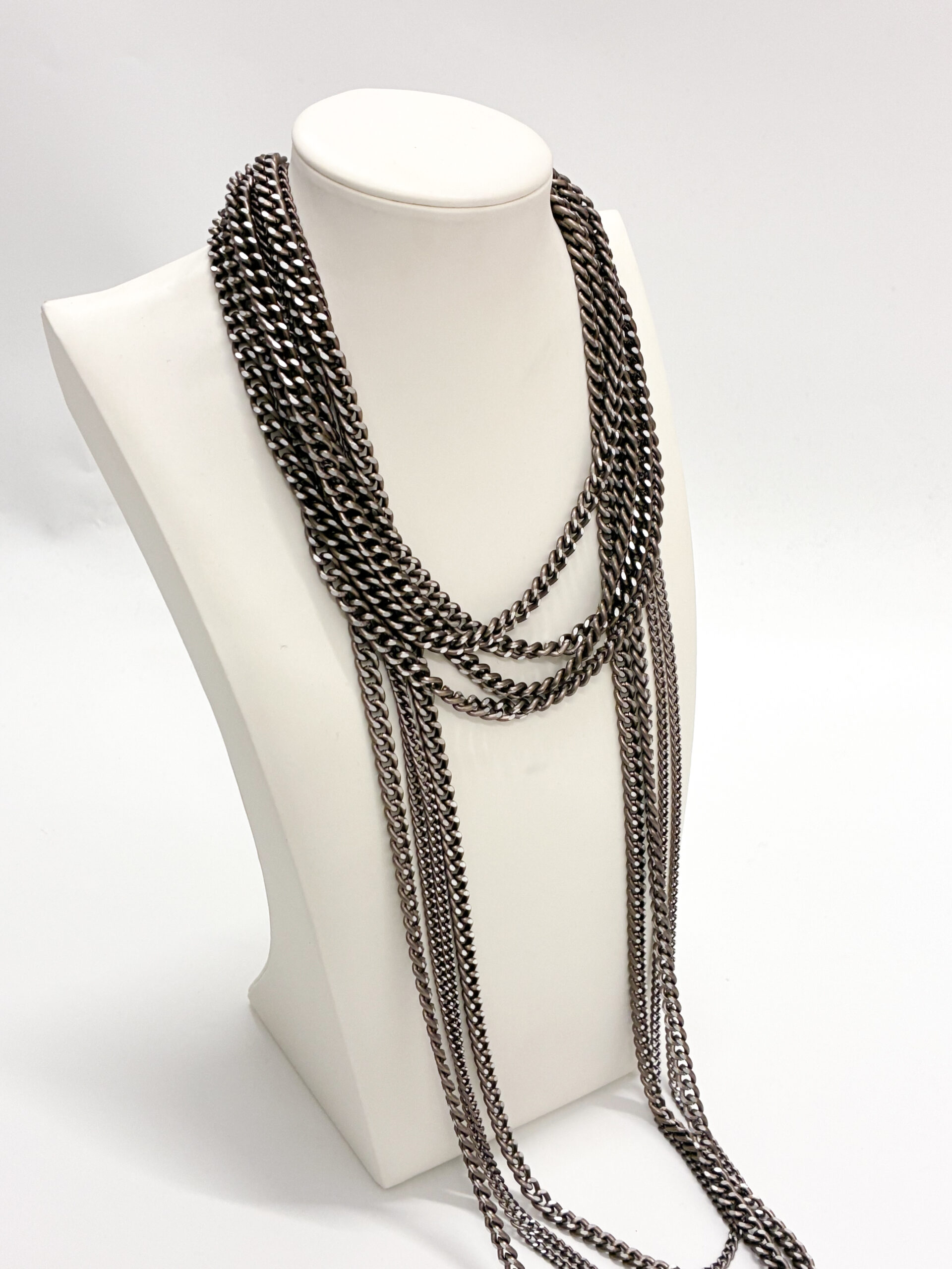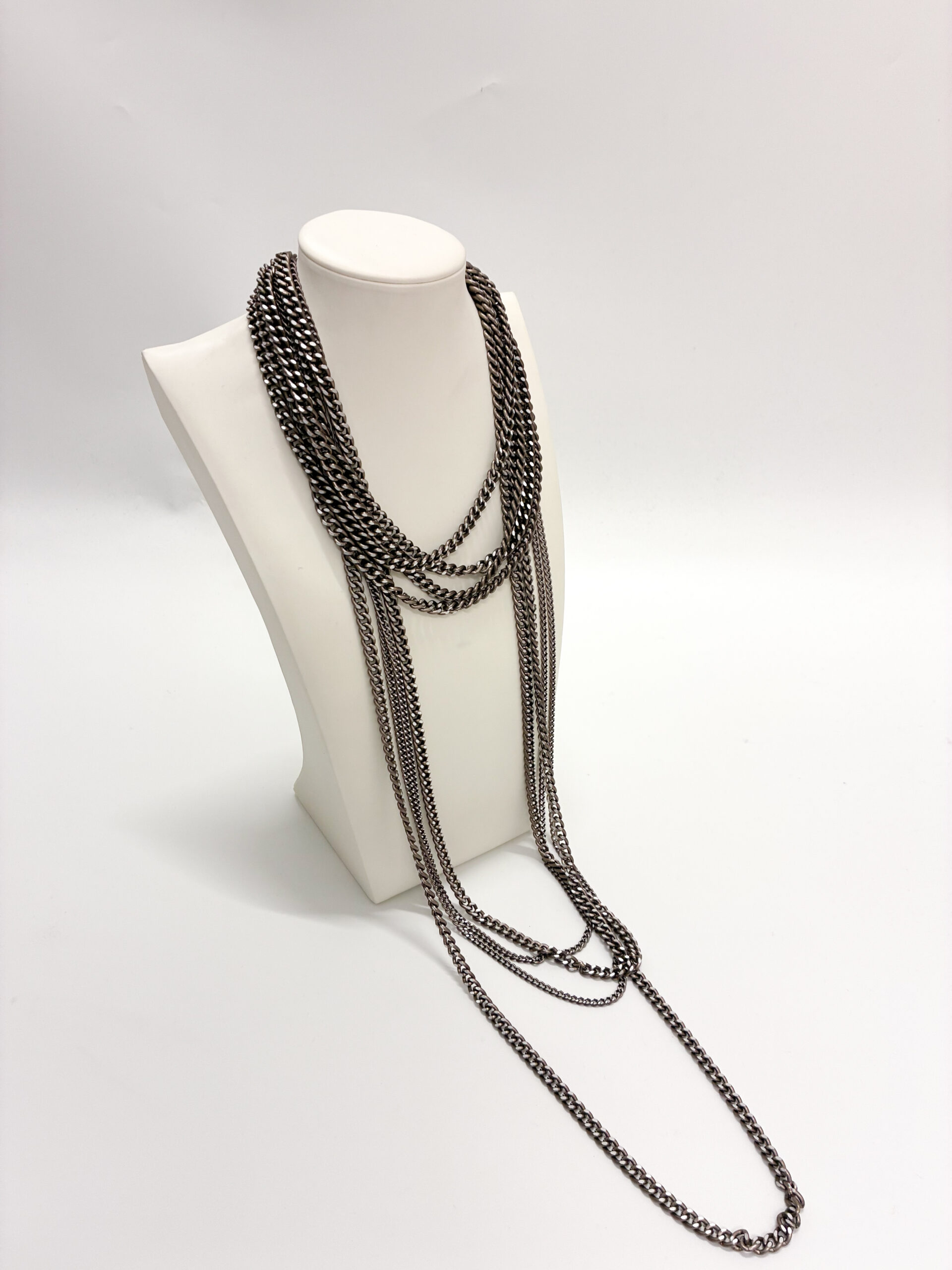 Εντυπωσιακό ασημί κολιέ με πολλαπλές λεπτές αλυσίδες που δημιουργούν κίνηση και βάθος. Η καθαρή, λιτή γραμμή του συναντά τη δυναμική λάμψη του μετάλλου, προσφέροντας ένα αποτέλεσμα σύγχρονο και διαχρονικό ταυτόχρονα. Φοριέται άνετα ως statement piece, αναδεικνύοντας τον λαιμό και το σύνολο χωρίς υπερβολή.