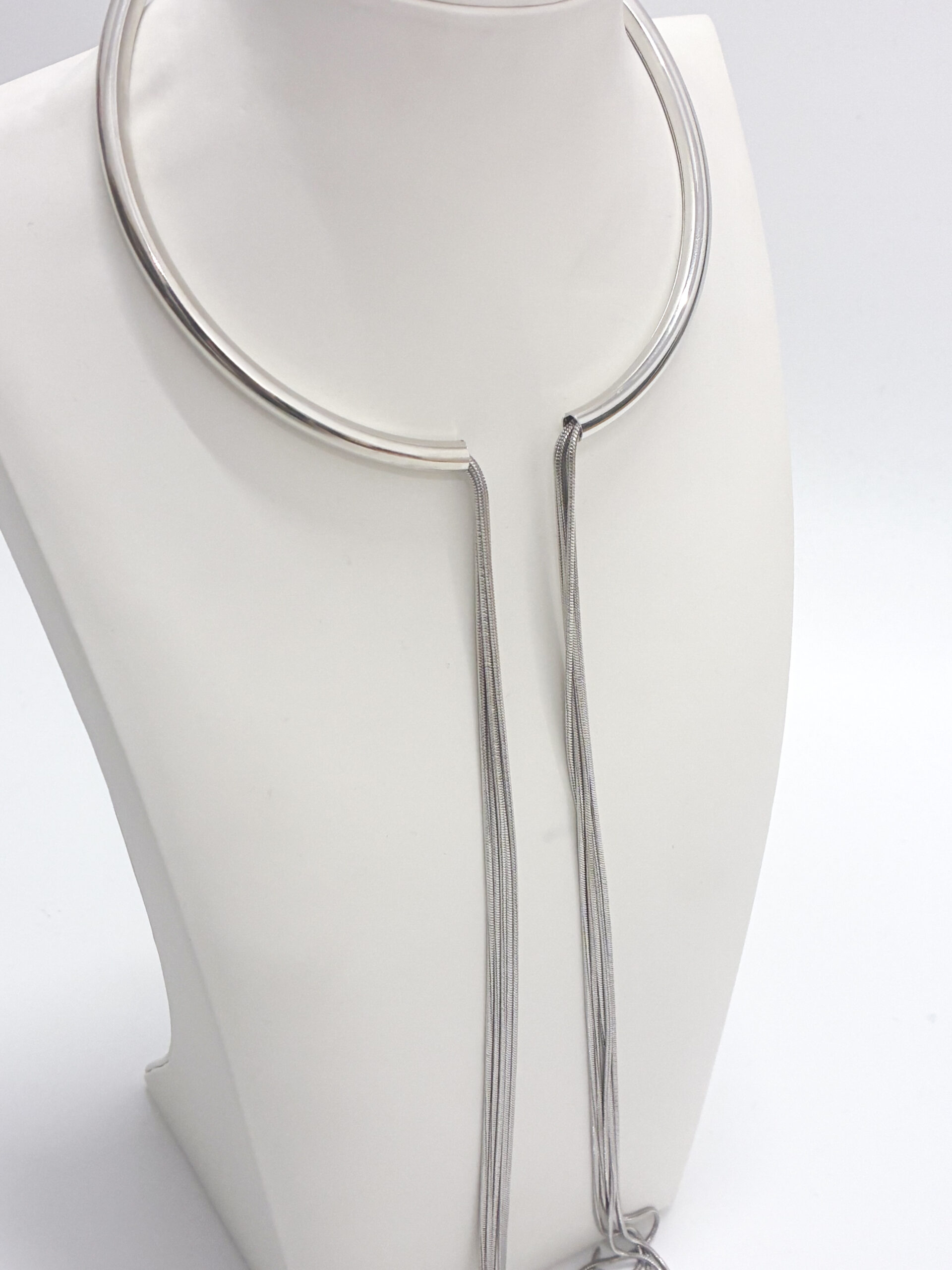 Minimal statement κολιέ με άκαμπτο μεταλλικό λαιμόκομμα και μακριές λεπτές αλυσίδες που πέφτουν κάθετα, δημιουργώντας ένα καθαρό αλλά έντονο οπτικό αποτέλεσμα. Η γεωμετρία του σχεδίου και η ρευστή κίνηση των αλυσίδων προσθέτουν σύγχρονη κομψότητα και luxury χαρακτήρα σε κάθε εμφάνιση. Ένα κόσμημα που δεν χρειάζεται τίποτα άλλο για να ξεχωρίσει.