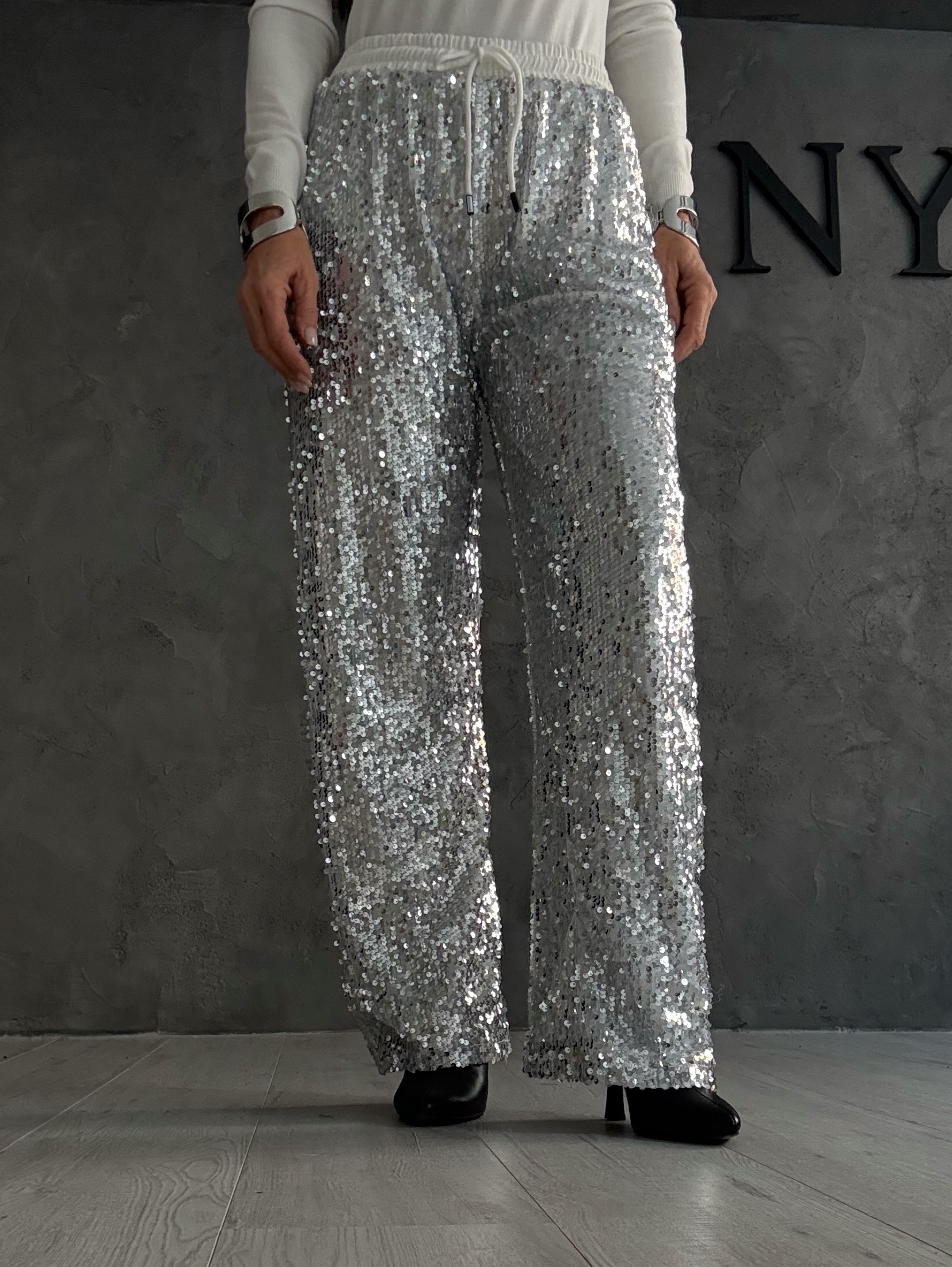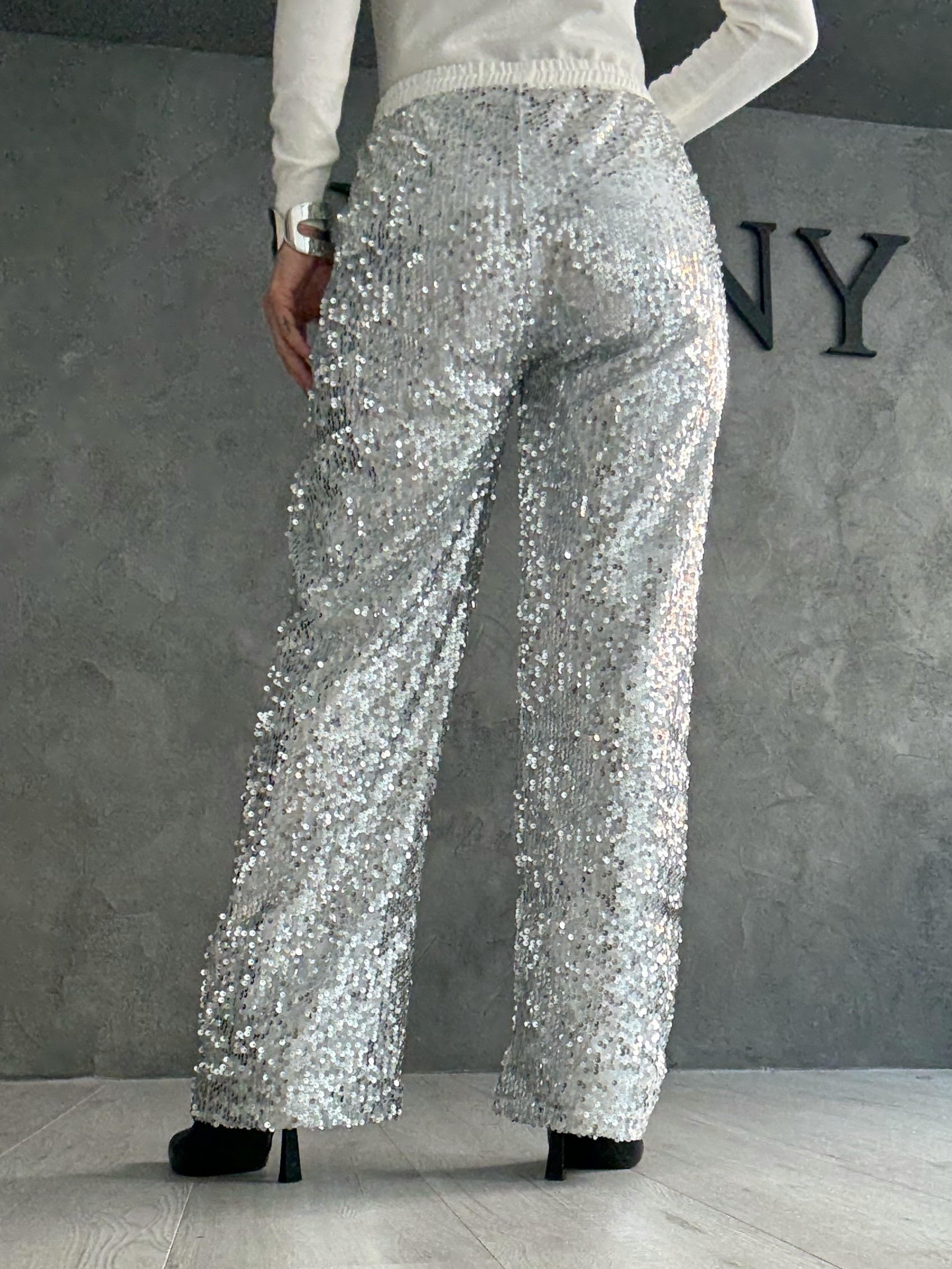 Ασημί παντελόνι με παγιέτες που λειτουργεί σαν υγρό φως πάνω στο σώμα. Η λάμψη του δεν είναι κραυγαλέα, αλλά απόλυτα ελεγχόμενη, δημιουργώντας ένα αποτέλεσμα πολυτέλειας και σύγχρονης δύναμης. Η ίσια, άνετη γραμμή εξισορροπεί τον έντονο χαρακτήρα των παγιετών, προσφέροντας άνεση και καθαρή σιλουέτα. Το ελαστικό τελείωμα στη μέση προσθέτει πρακτικότητα, ενώ η συνολική εικόνα παραμένει σοφιστικέ και δυναμική. Ένα κομμάτι σχεδιασμένο για βραδινές εμφανίσεις με κύρος — όχι απλώς για να λάμπεις, αλλά για να ξεχωρίζεις.