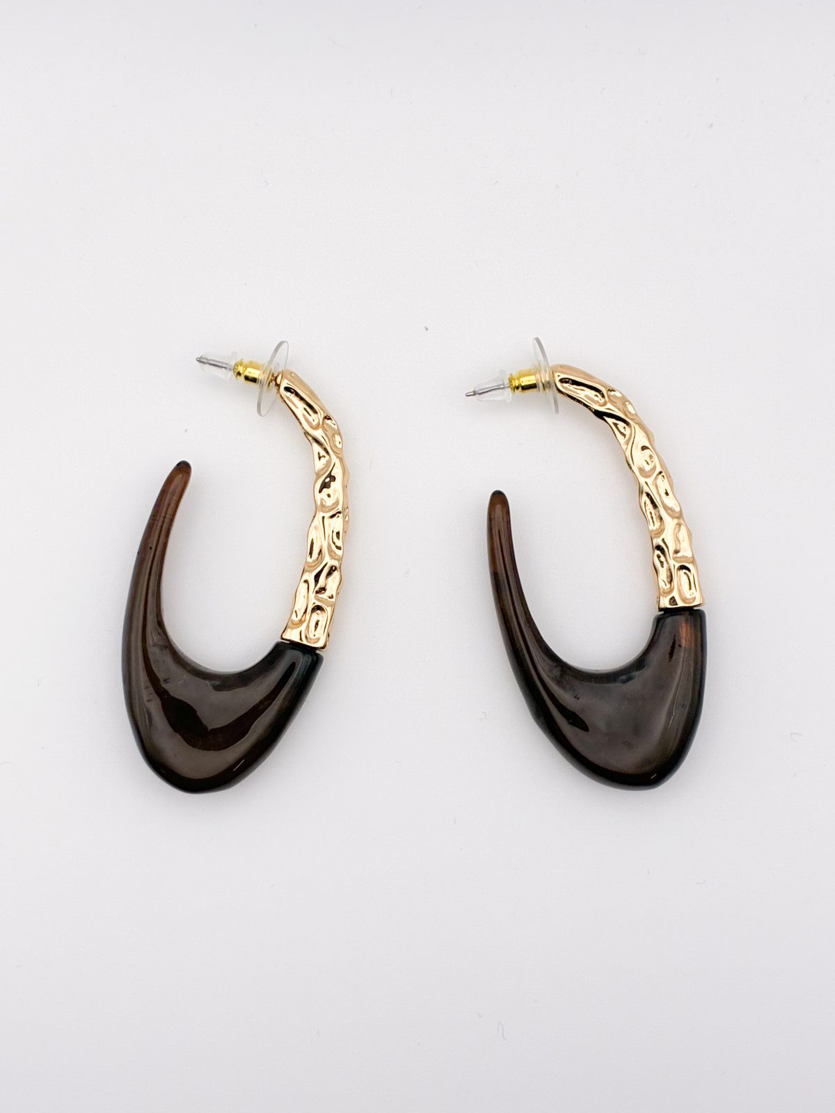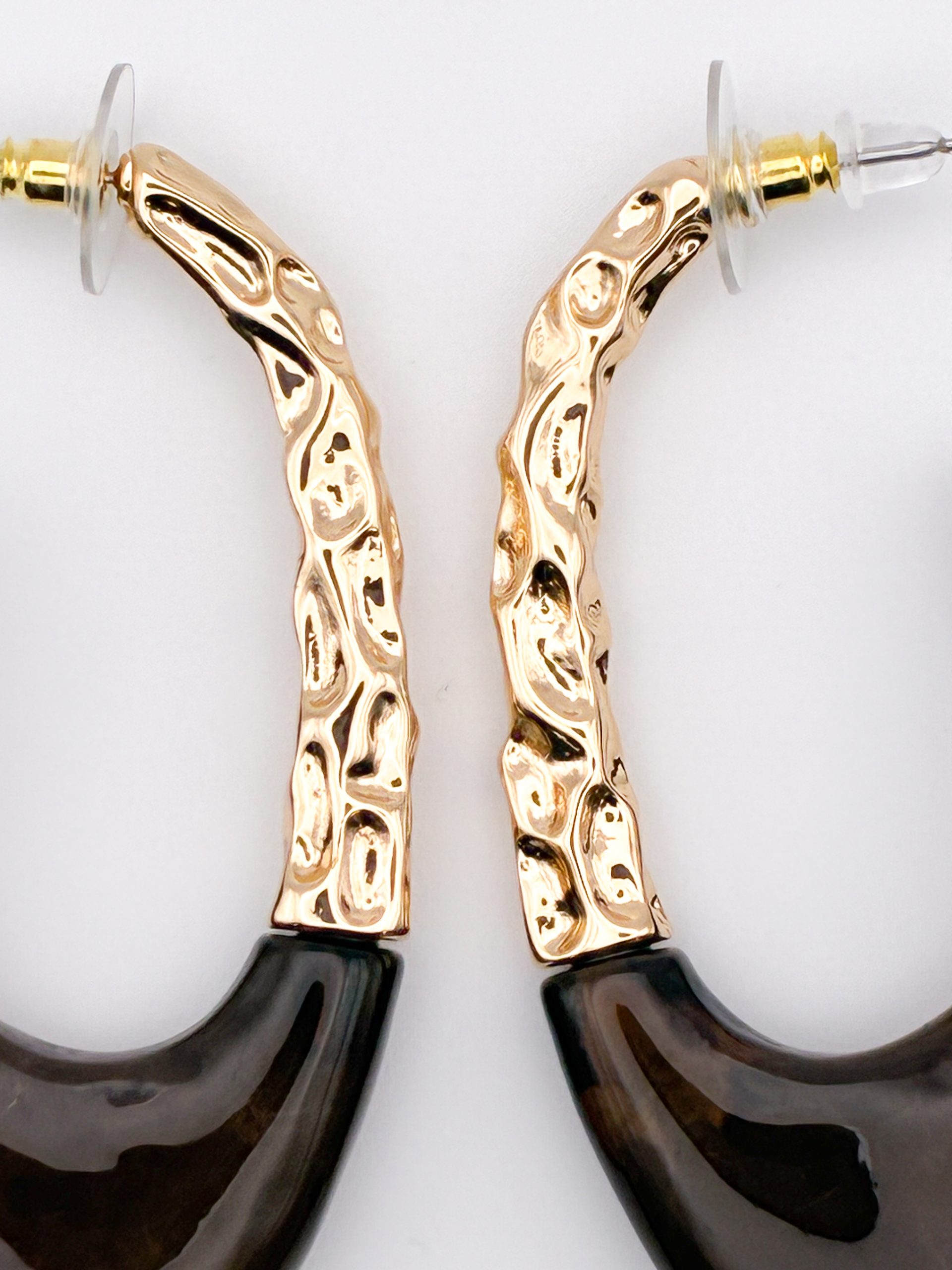 Εντυπωσιακά σκουλαρίκια σε καφέ απόχρωση με ιδιαίτερο οργανικό σχήμα σταγόνας. Η χρυσή μεταλλική λεπτομέρεια στο πάνω μέρος χαρίζει πολυτέλεια και αντίθεση, δημιουργώντας ένα κόσμημα που ισορροπεί ανάμεσα στο μοντέρνο και το φυσικό στοιχείο.