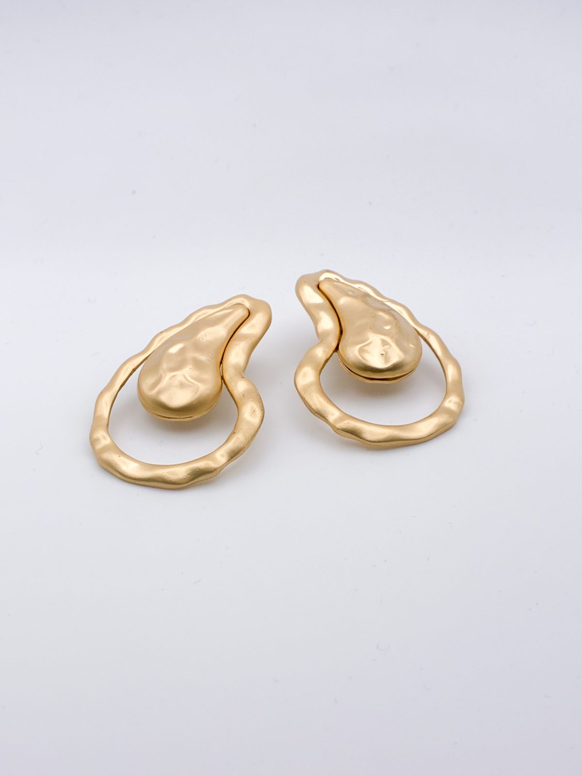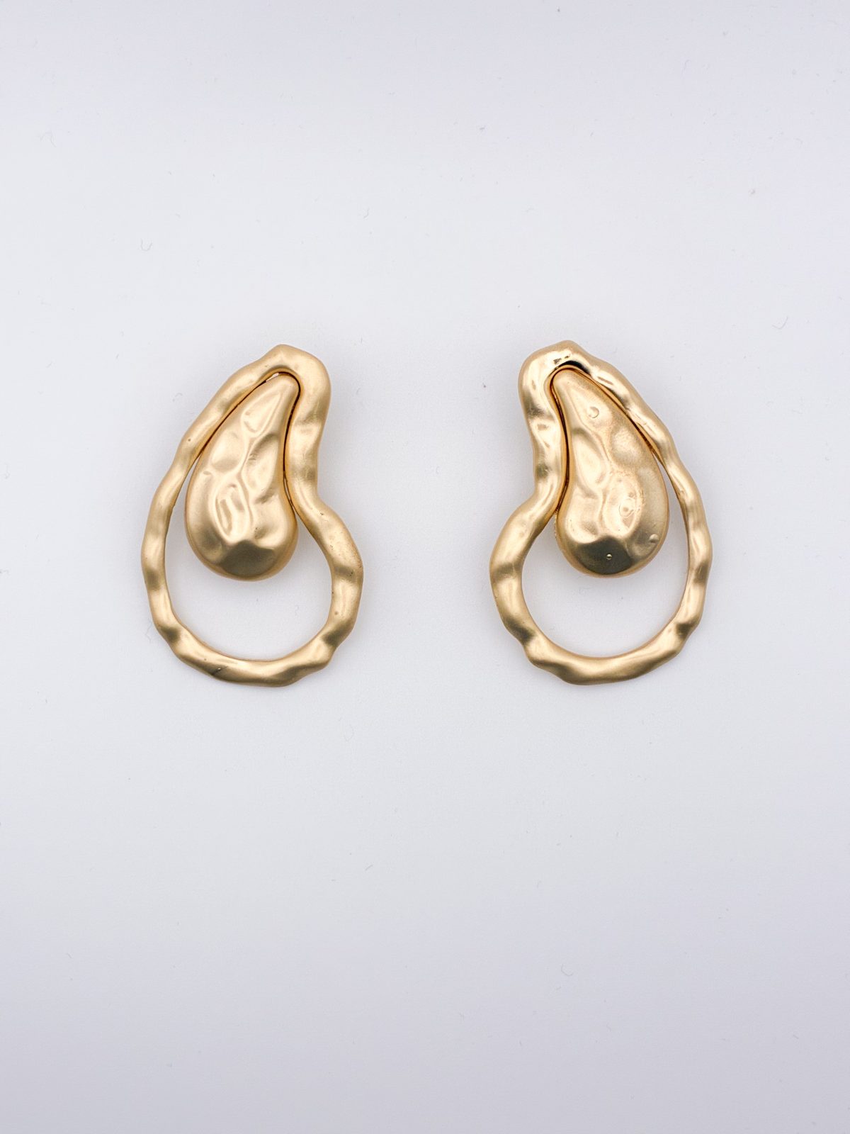 Εντυπωσιακά χρυσά σκουλαρίκια με οργανικό, ρευστό design που θυμίζει κύμα ή λιωμένο μέταλλο. Το ακανόνιστο περίγραμμα τους δίνει μια καλλιτεχνική και statement αίσθηση, ενώ η χρυσή λάμψη τα κάνει ιδανικά για εμφανίσεις που θέλουν να ξεχωρίζουν.