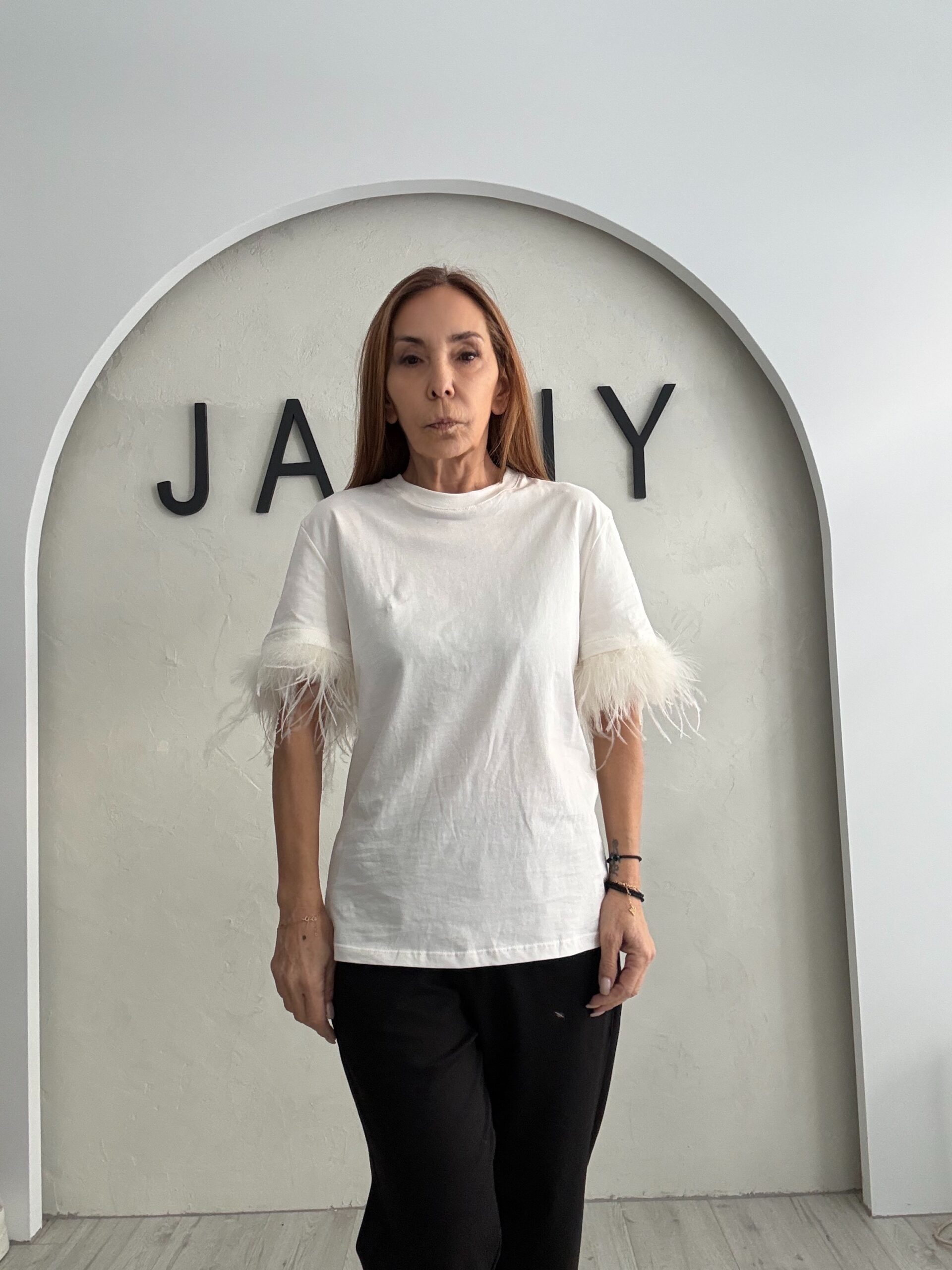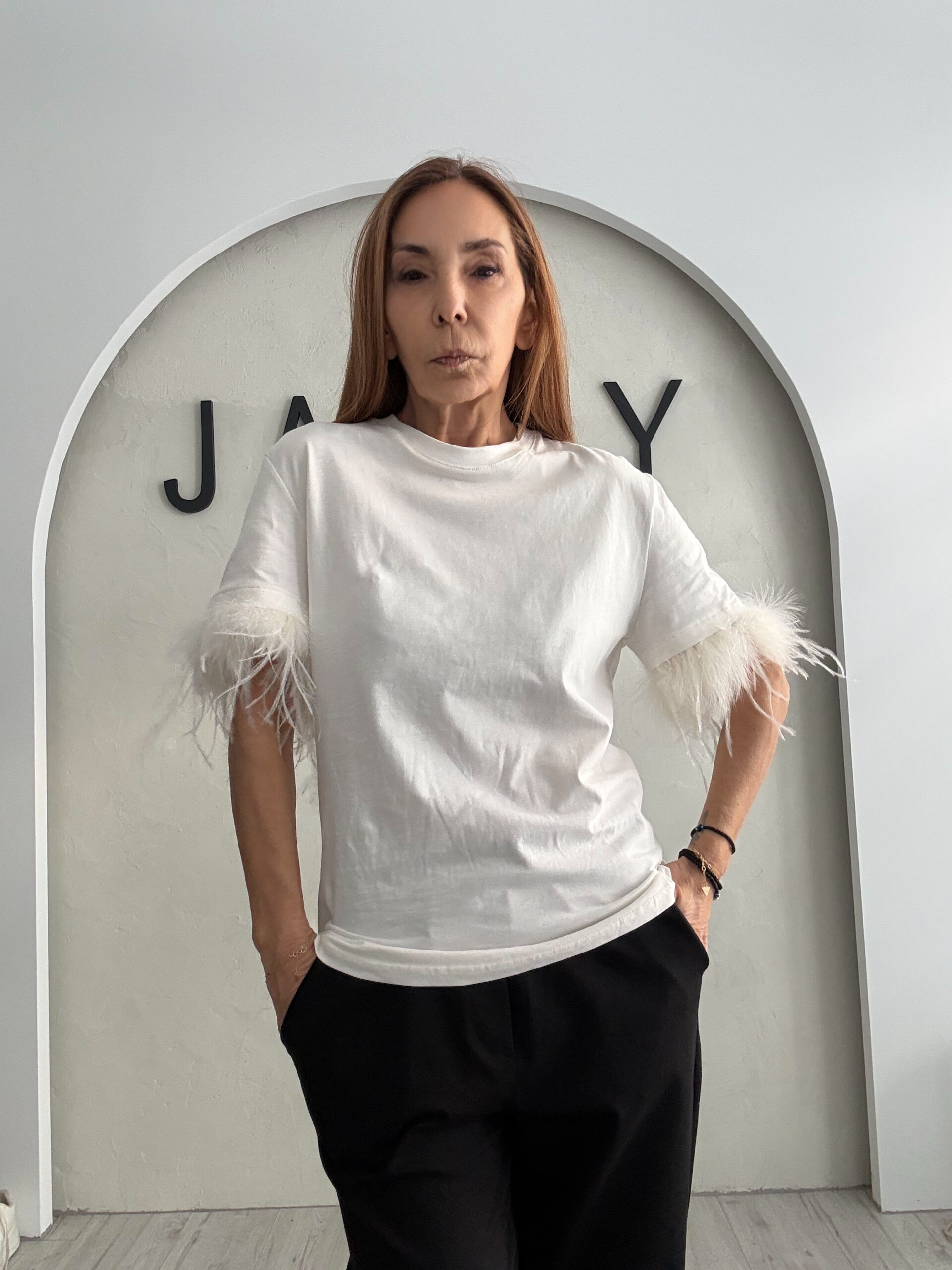 Η καθαρή, ίσια φόρμα διατηρεί την απλότητα του βασικού κομματιού, ενώ τα φτερά μετατρέπουν το t-shirt σε statement επιλογή.
